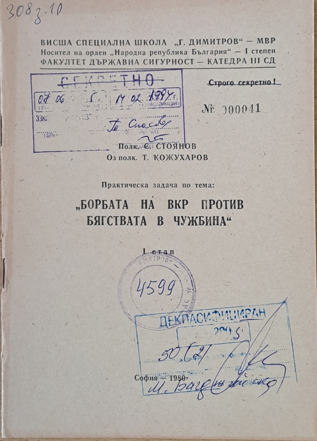 ВСШ „Г. Димитров“-МВР. Задача по тема: „Борбата на ВКР против бягствата в чужбина“ (за преподаватели)“