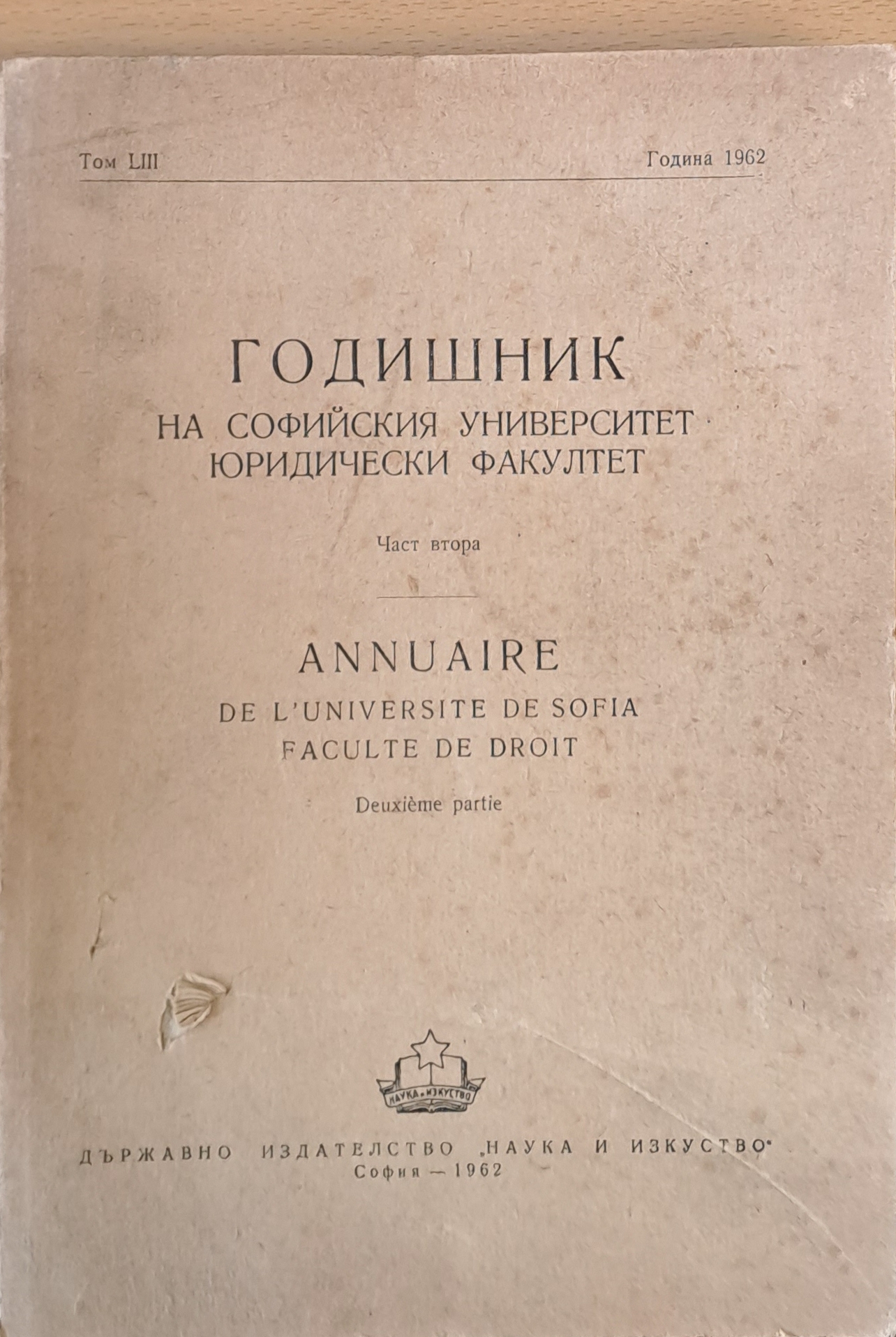 Годишник на Софийския университет, Юридически факултет, част втора, том LІІІ, Година 1962