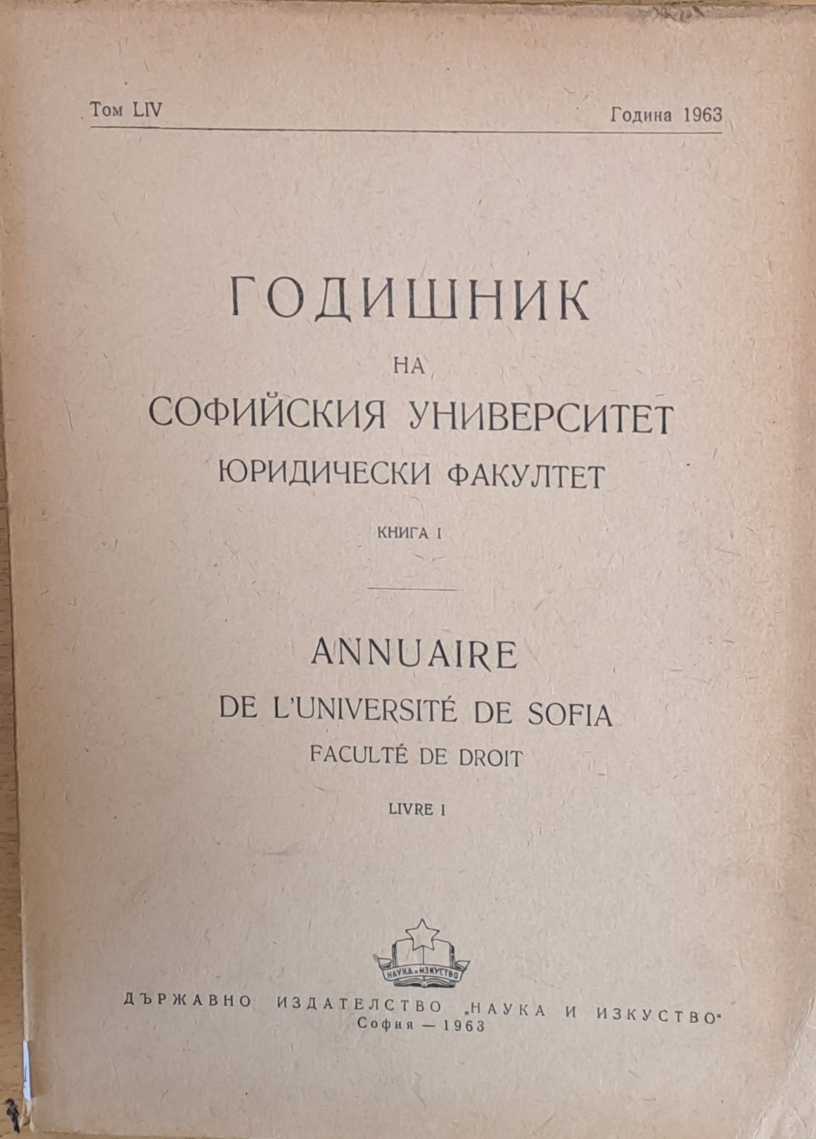 Годишник на Софийския университет, Юридически факултет, книга І, том LІV, Година 1963