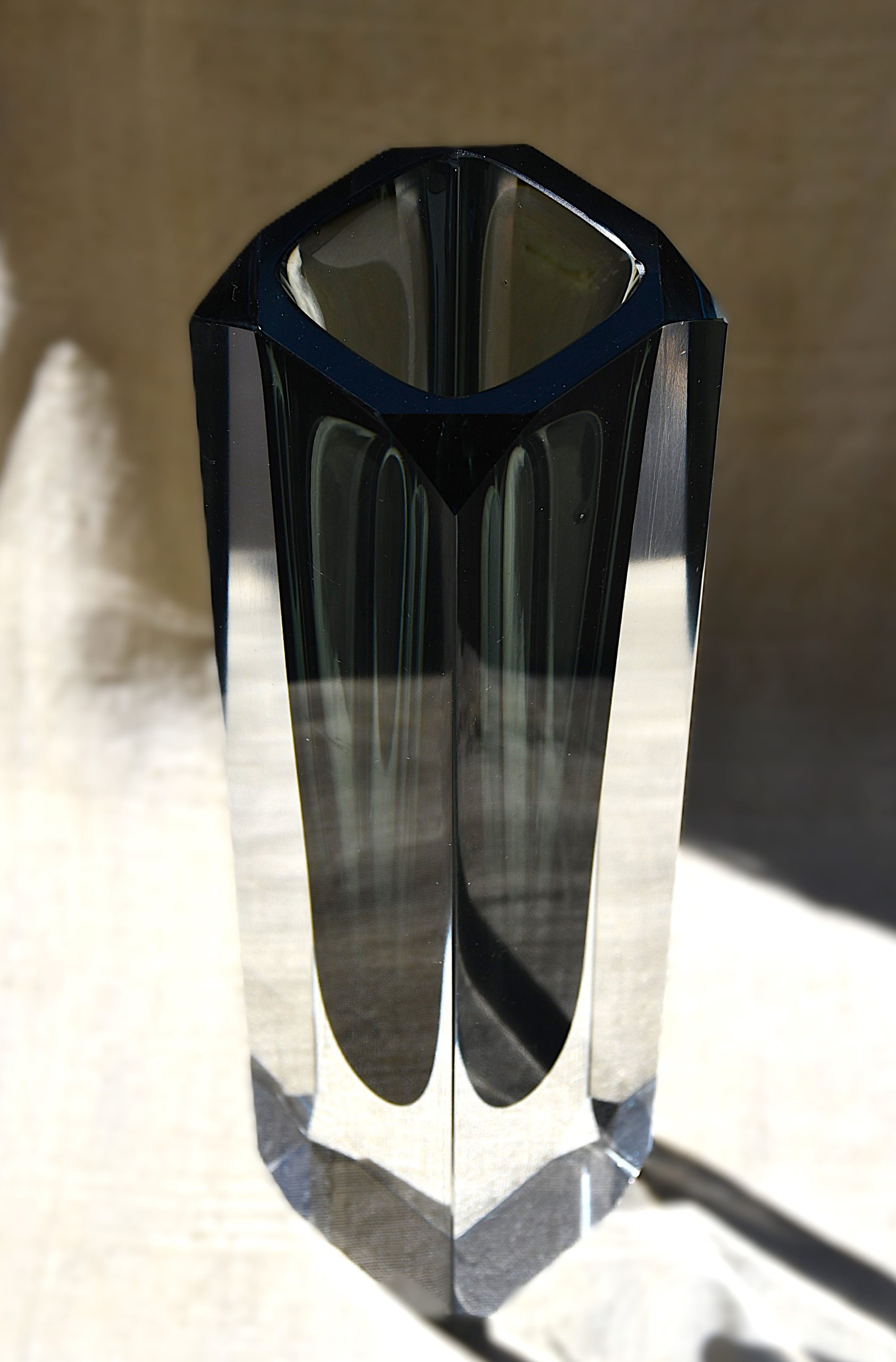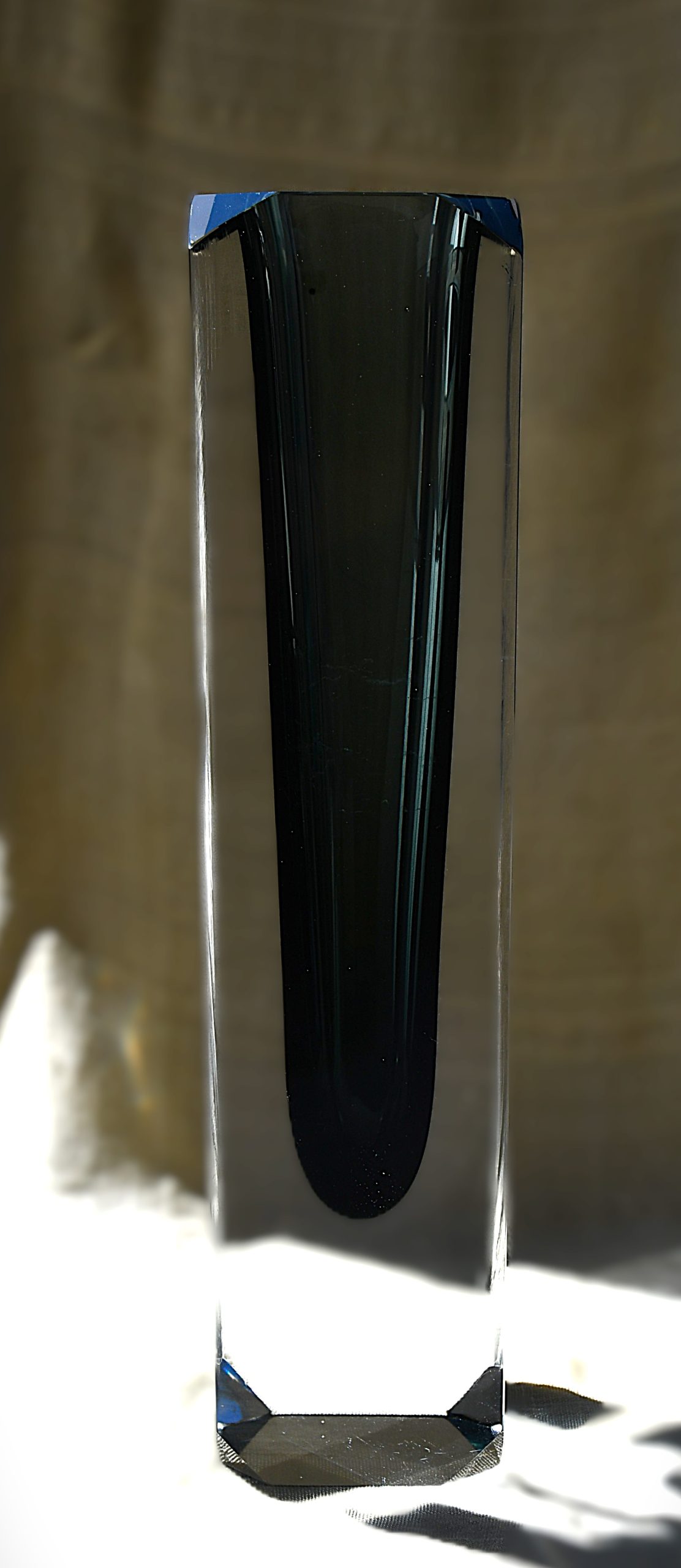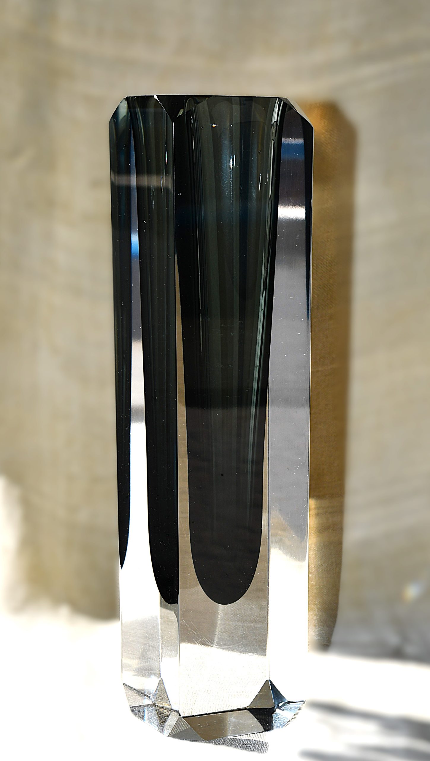 Много голямо (и тежко!) тяло във форма на колона от прозрачно кристално стъкло, обгръщащо сърцевина от топло-опушено стъкло. Sommerso техника. С късо фасетирани ъгли, много рядък вариант на основния изчистен модел или на този с дългите фасети. Магическа оптичност.