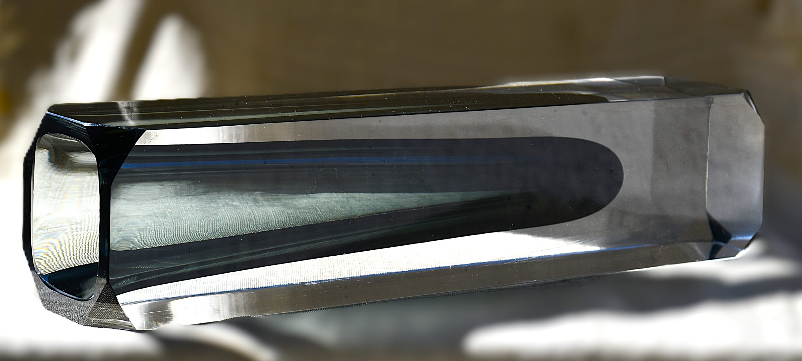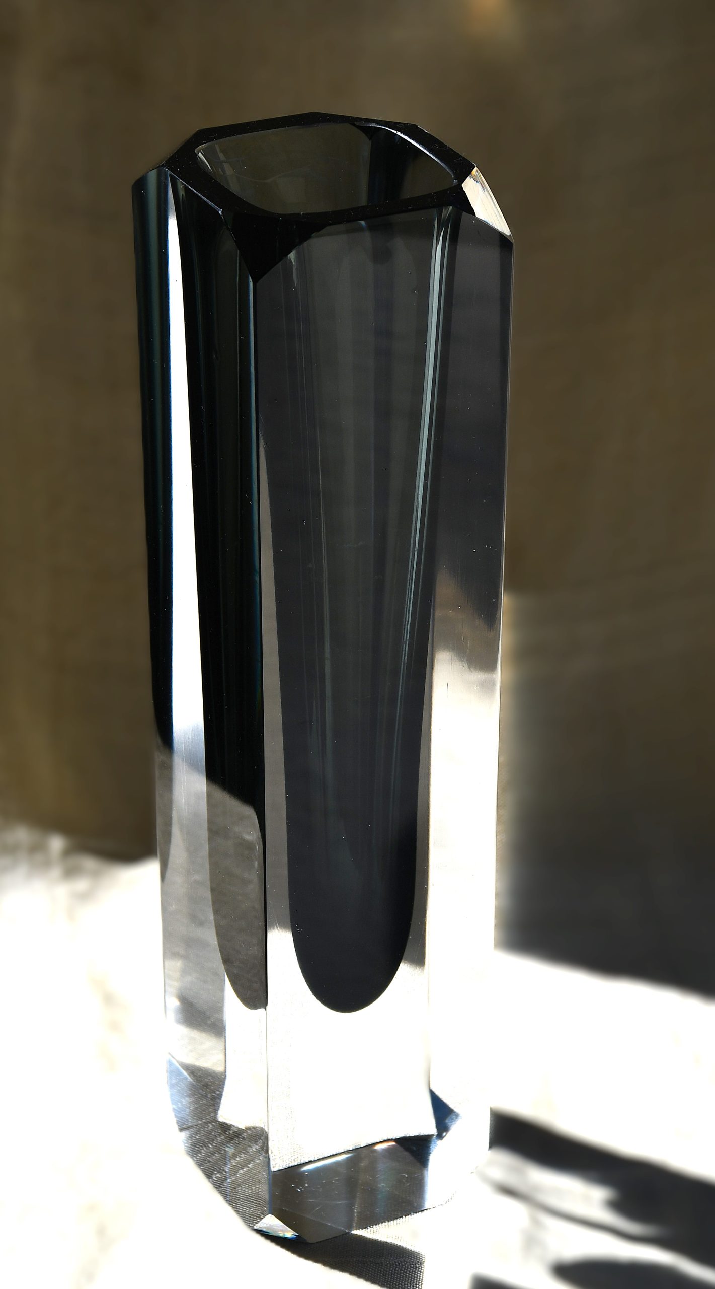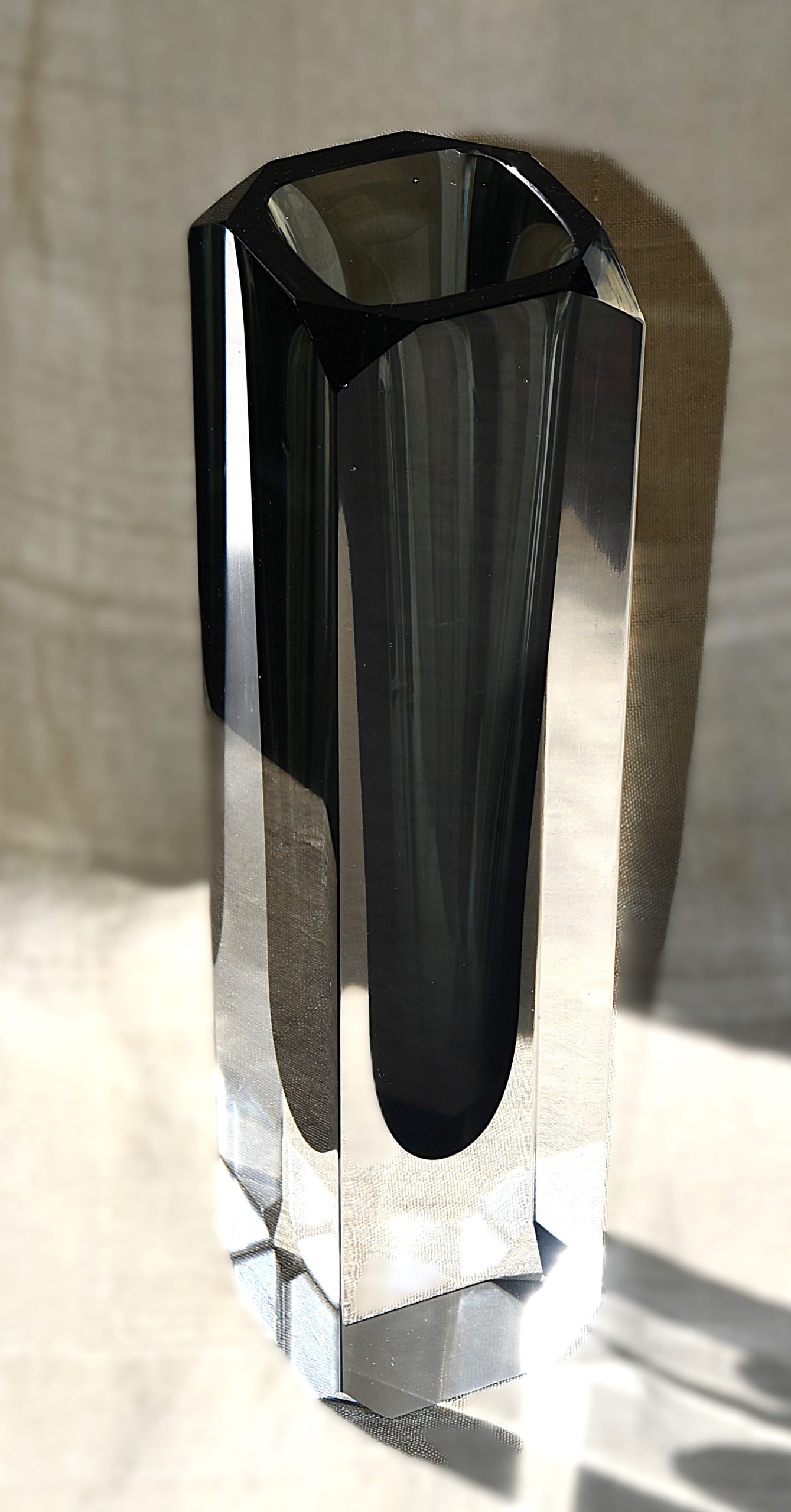 Много голямо (и тежко!) тяло във форма на колона от прозрачно кристално стъкло, обгръщащо сърцевина от топло-опушено стъкло. Sommerso техника. С късо фасетирани ъгли, много рядък вариант на основния изчистен модел или на този с дългите фасети. Магическа оптичност.