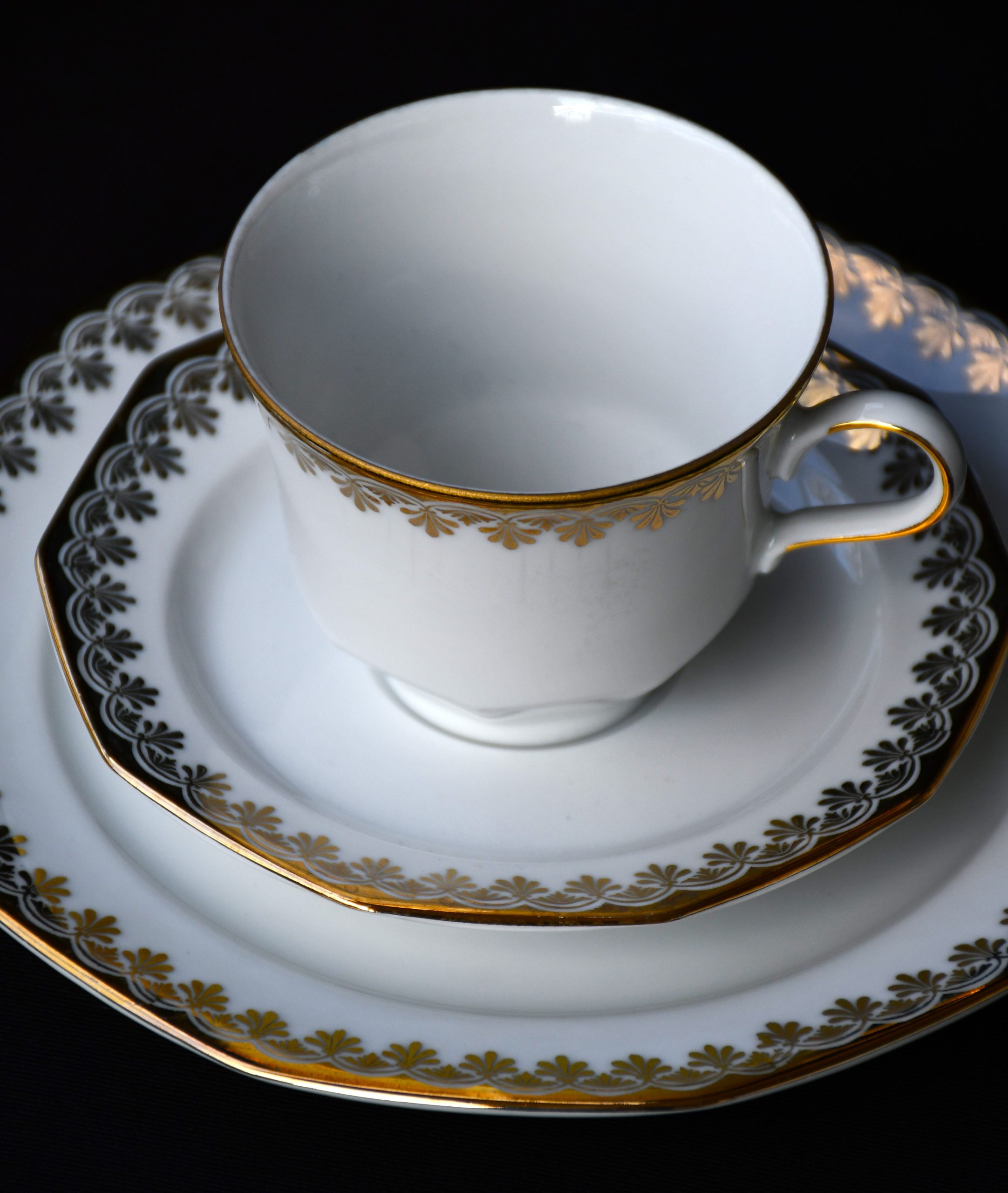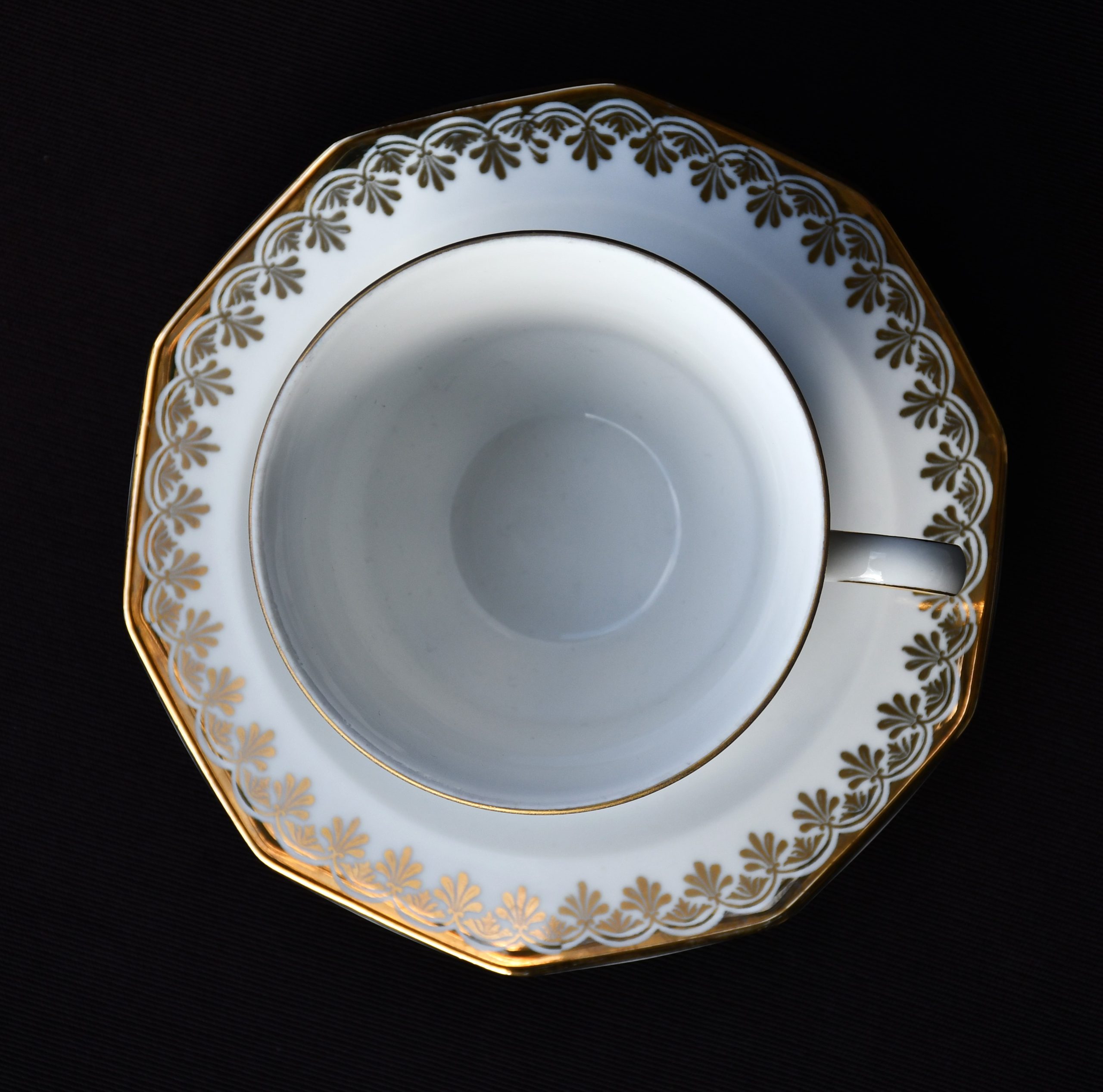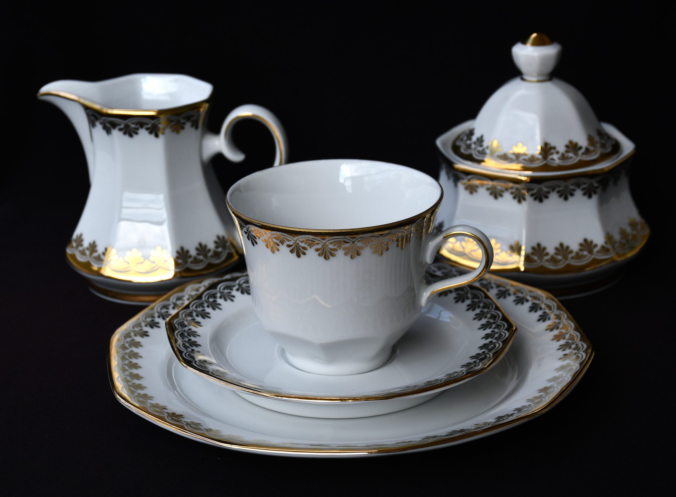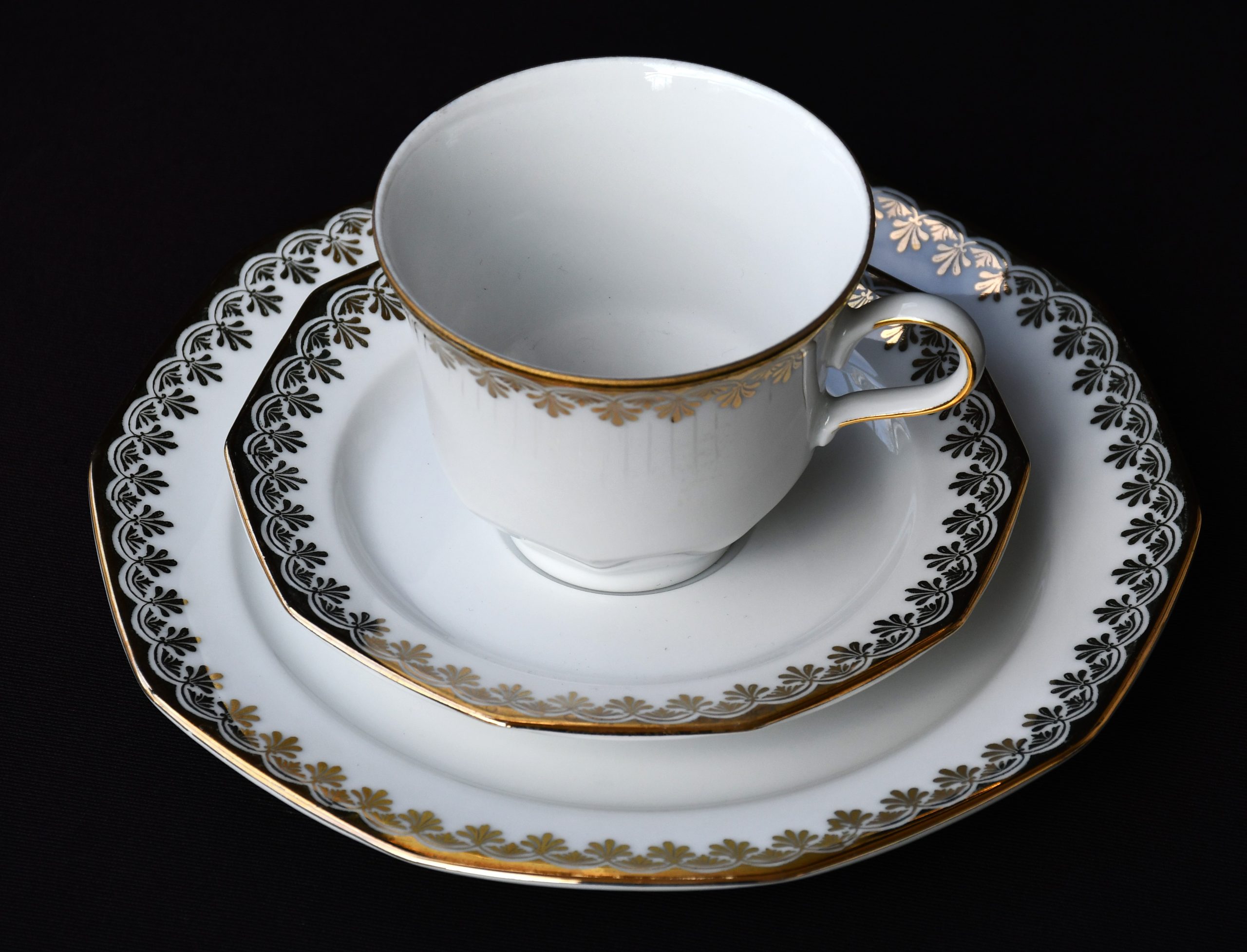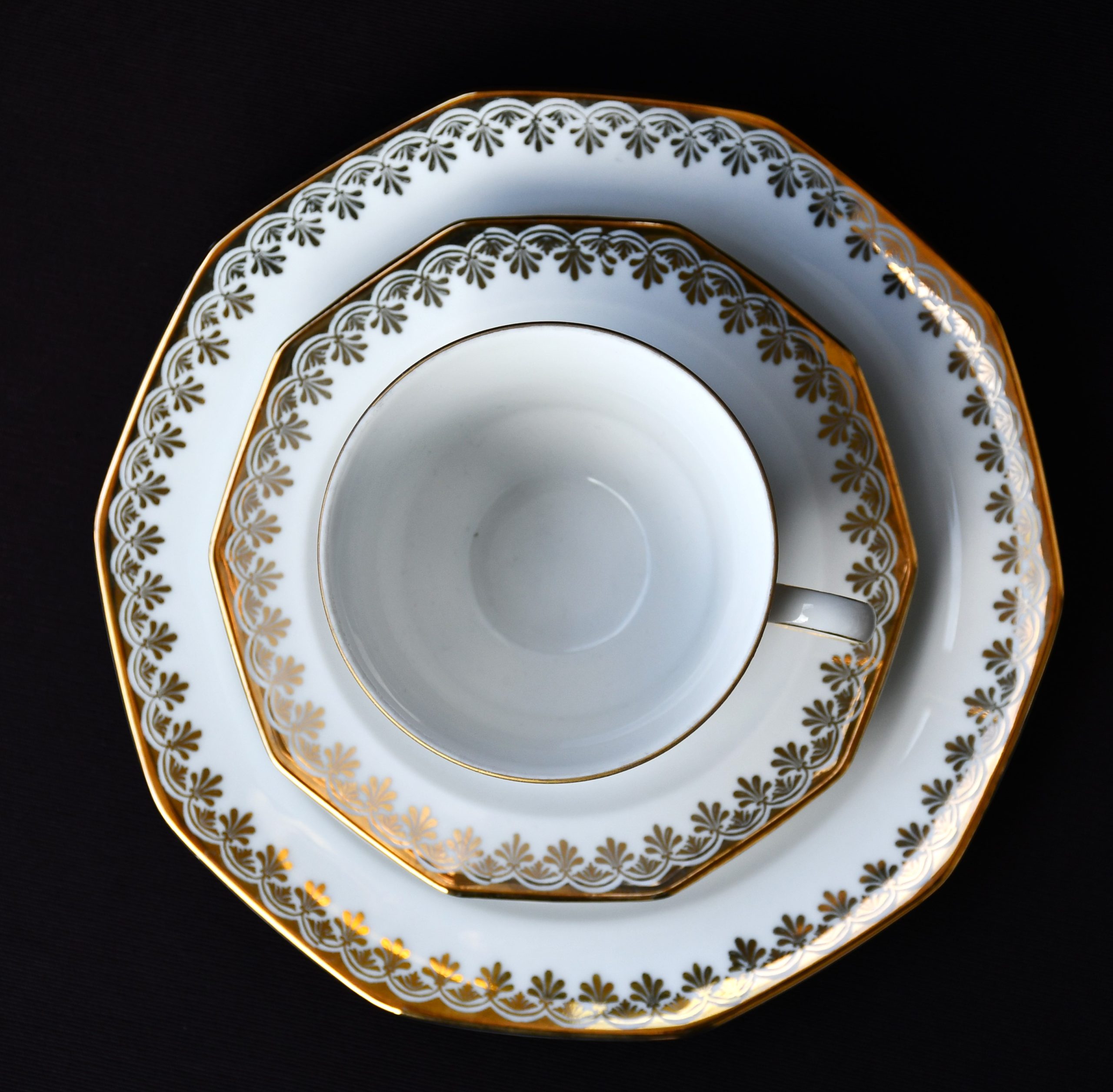 Голям сет за кафе от елитен баварски порцелан с рядка палметна декорация в златно. Производство на Winterling.