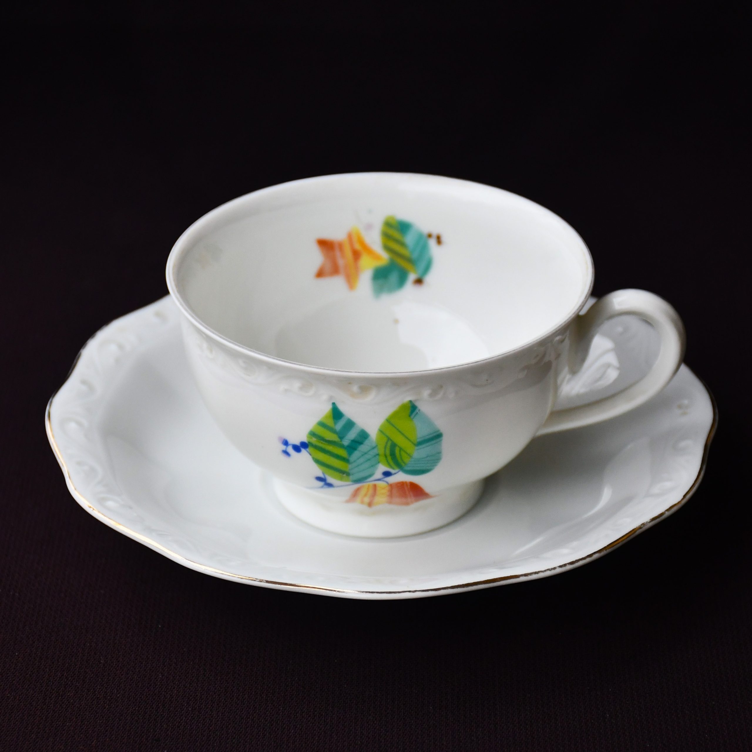 Цветна флорална декорация, вътре и вън. Позлатени участъци. Обем на чашата – около 230 мл.