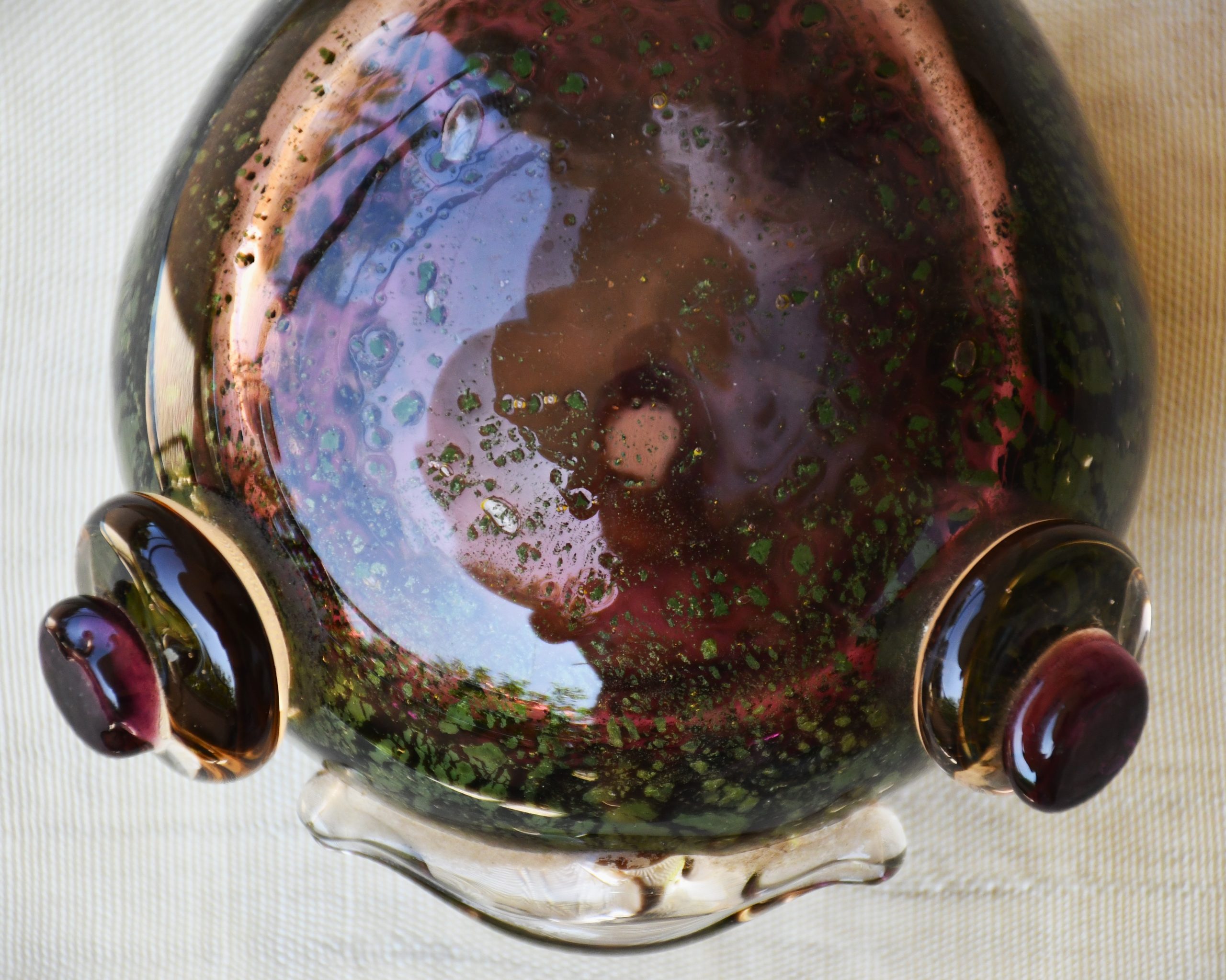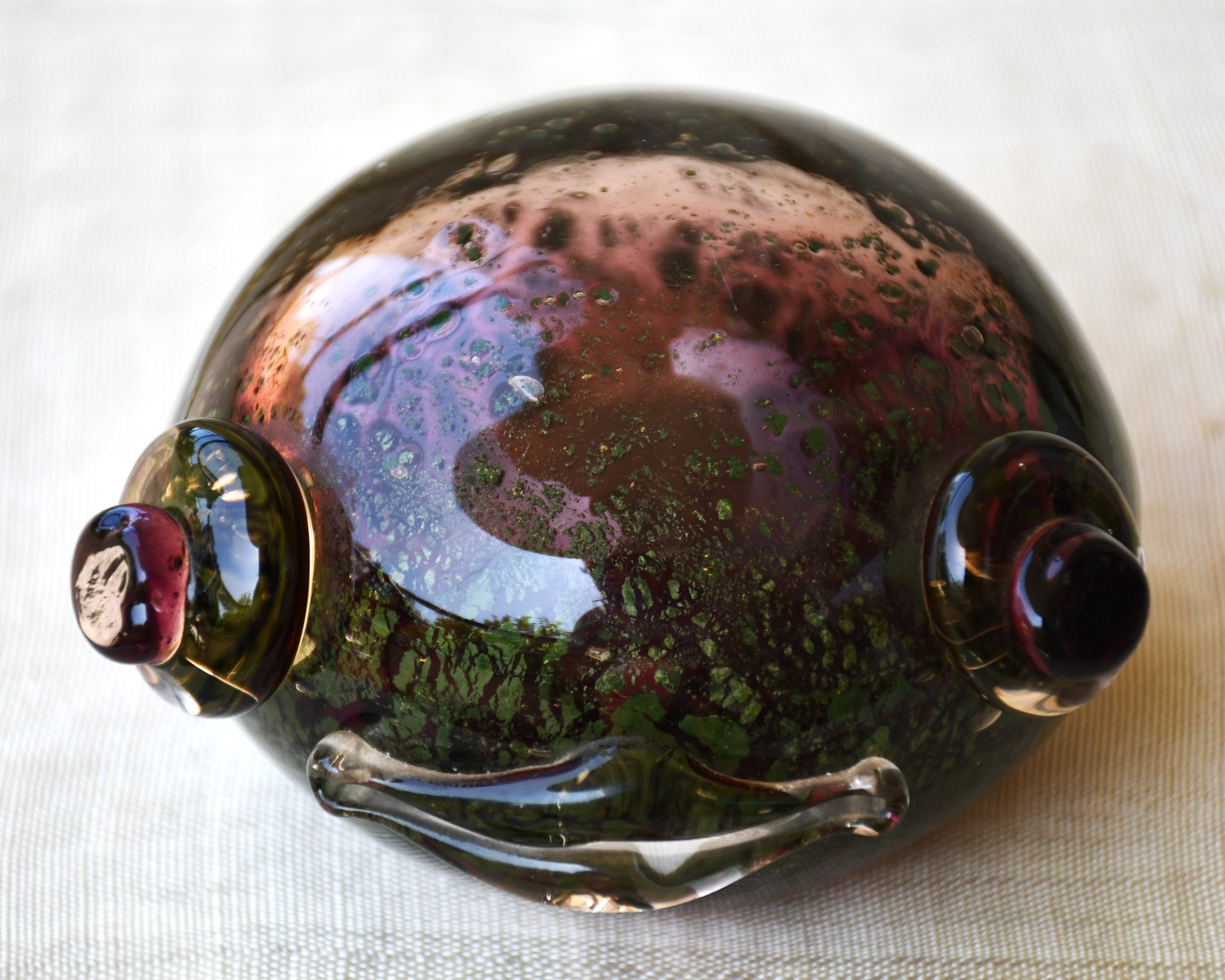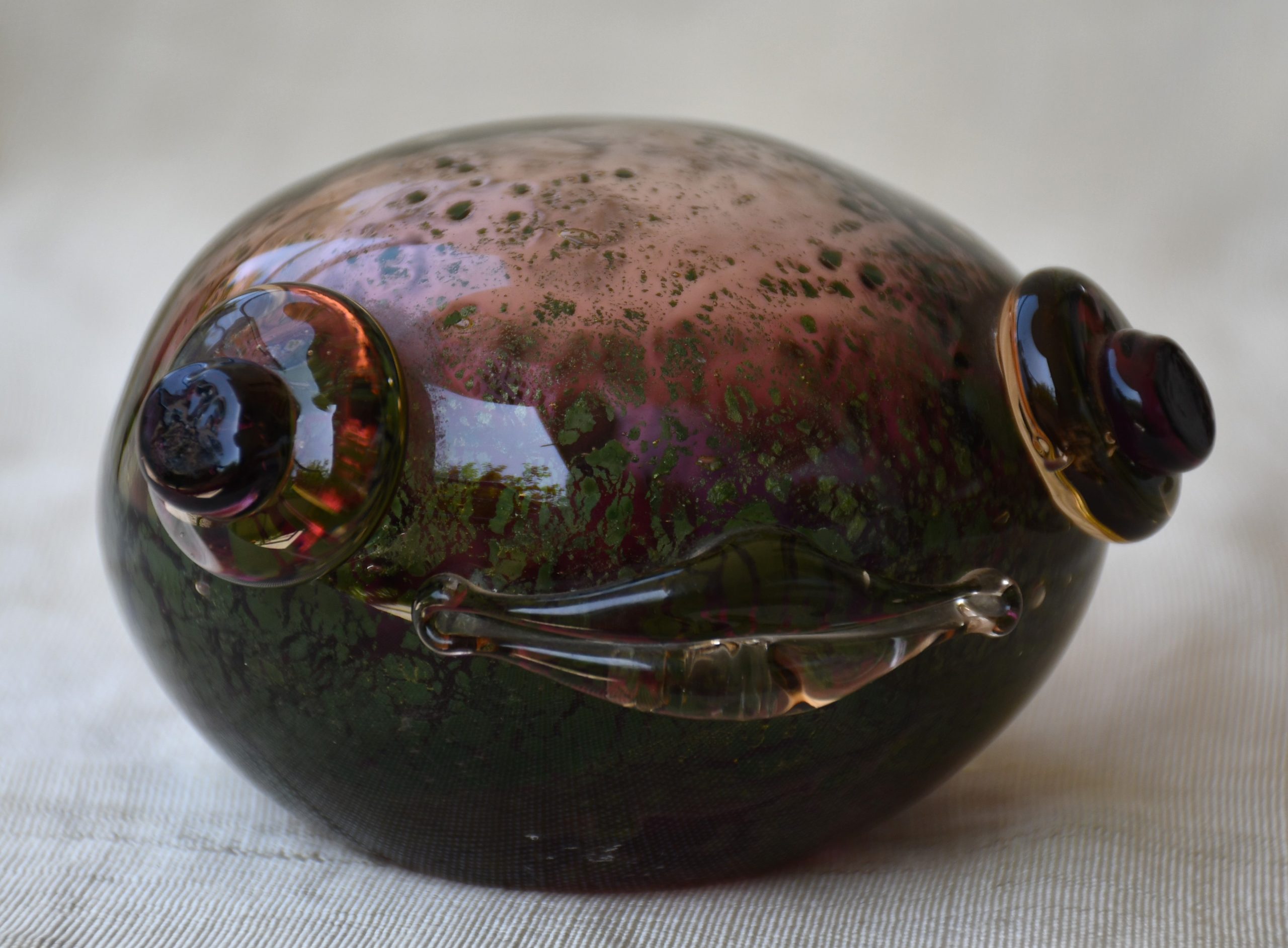 Много весела жаба – арт-стъкло в стила на Murano, датирано 60’те, многоцветно. Ръчна работа. Дизайнерът е неизвестен. Не е подписана, както повечето неща от периода.