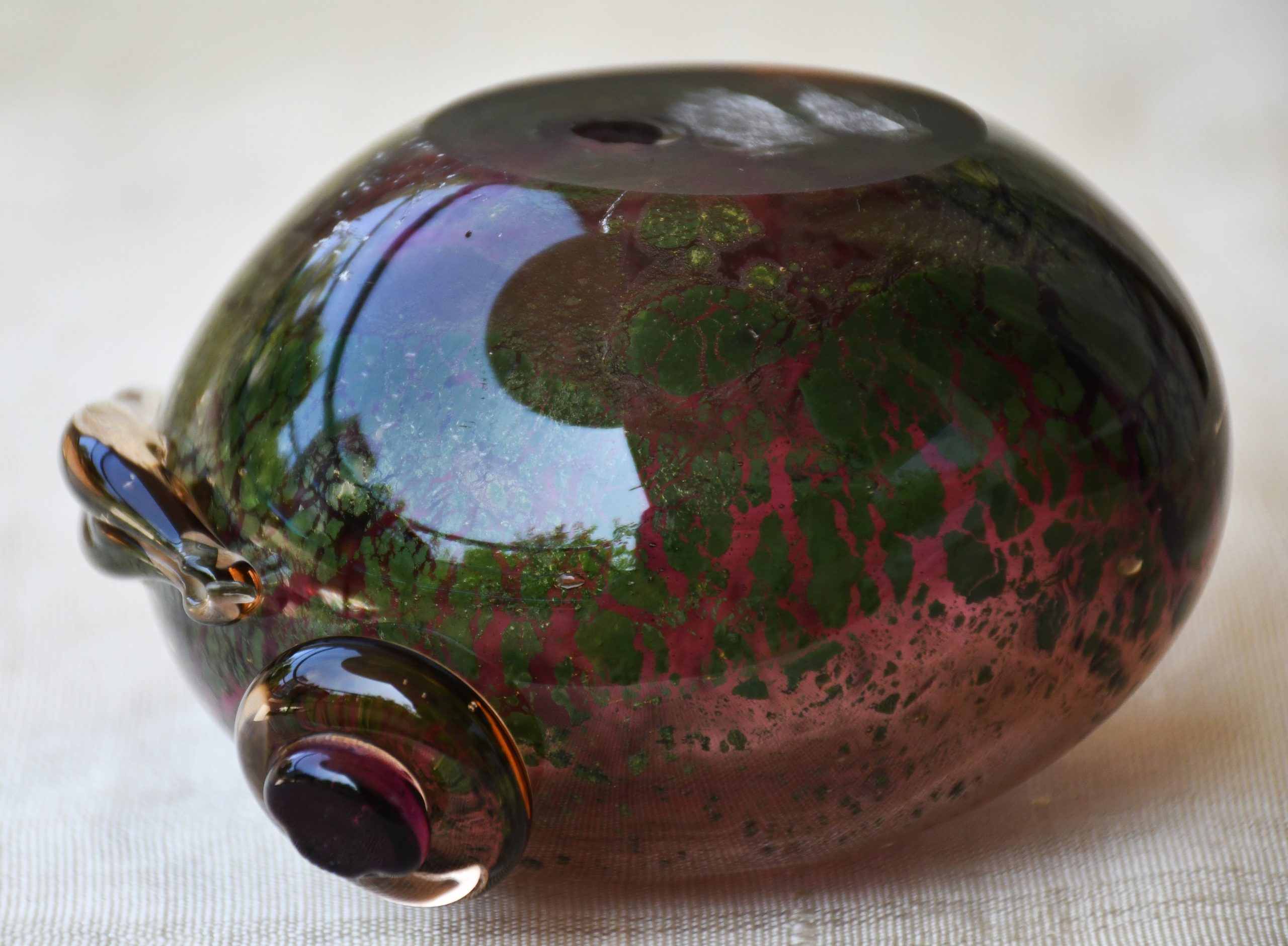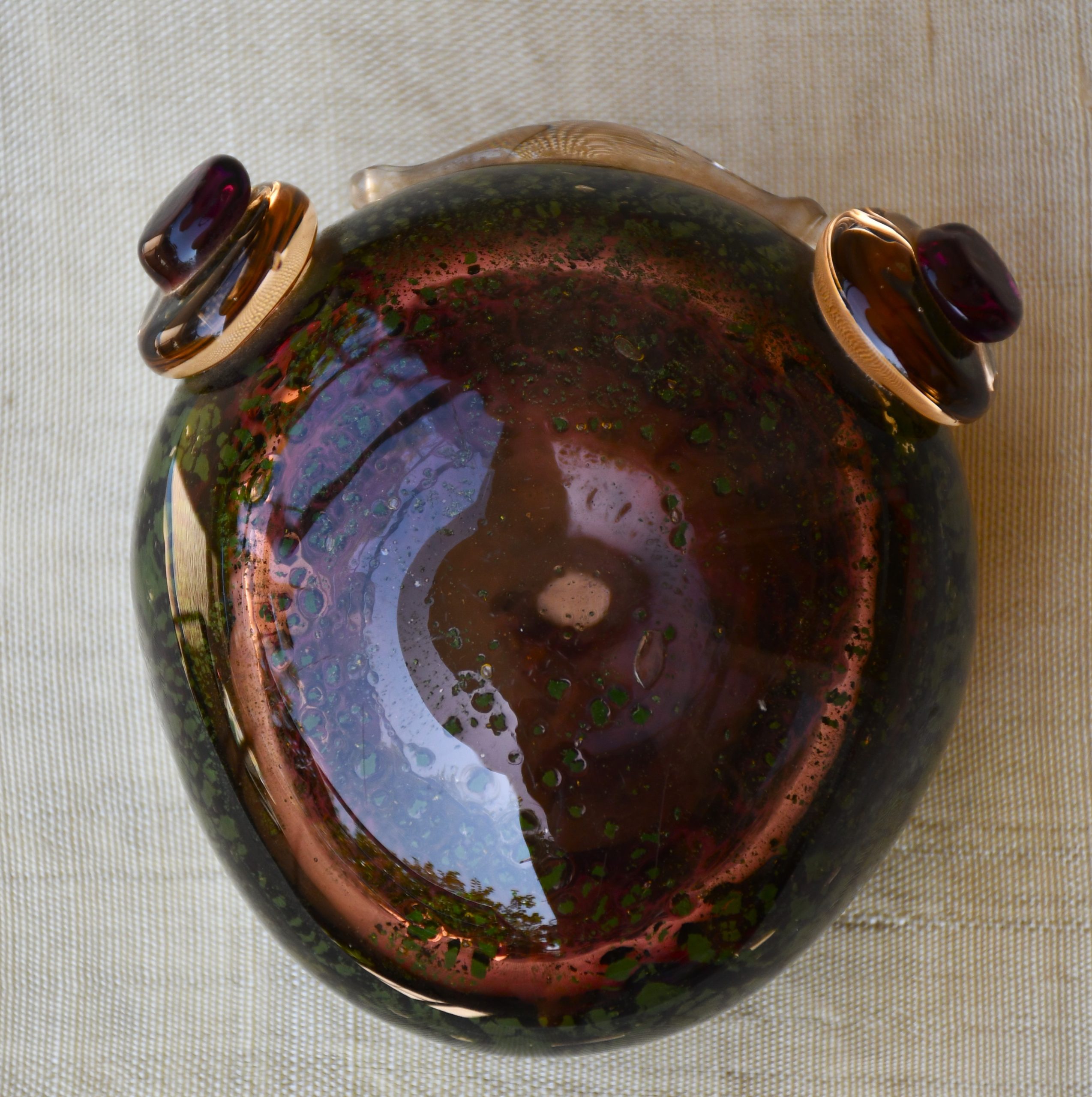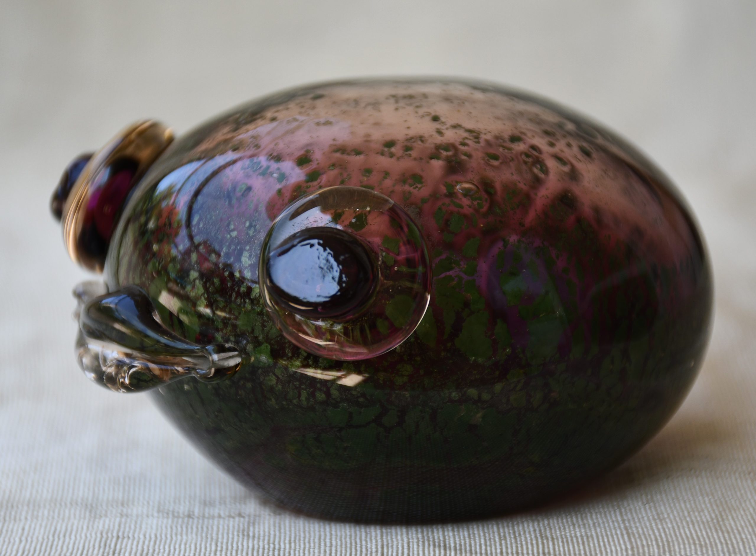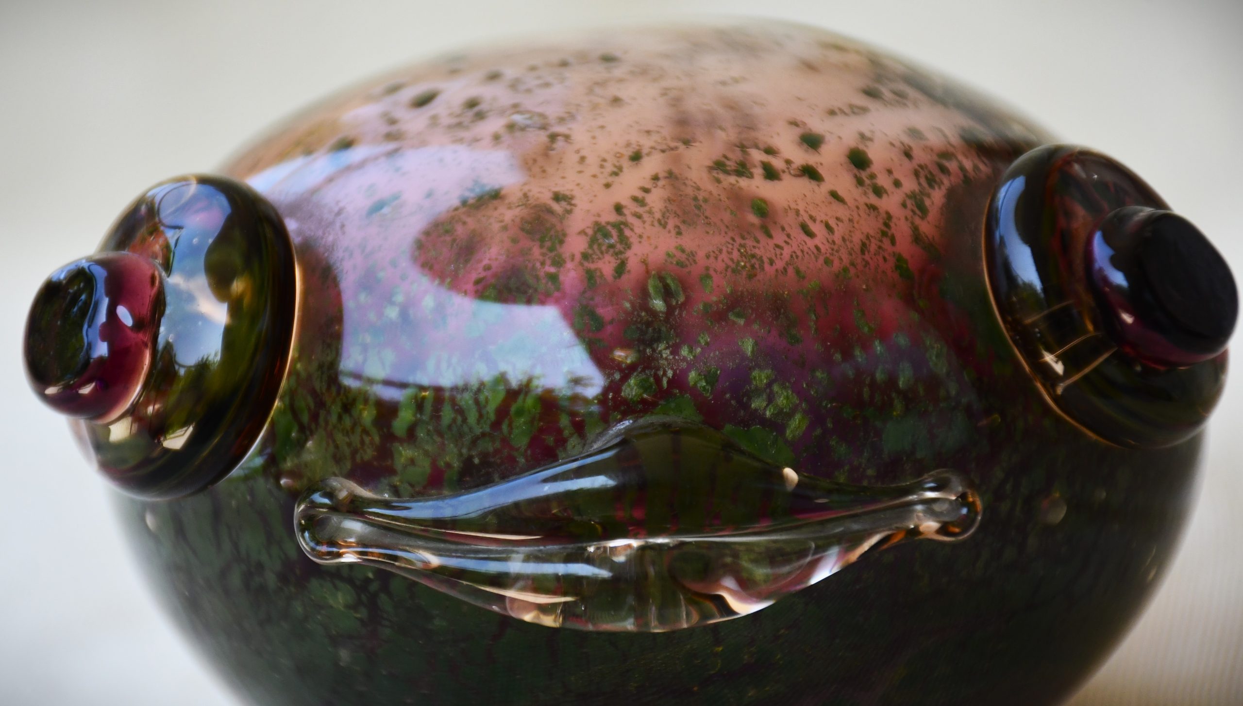 Много весела жаба – арт-стъкло в стила на Murano, датирано 60’те, многоцветно. Ръчна работа. Дизайнерът е неизвестен. Не е подписана, както повечето неща от периода.