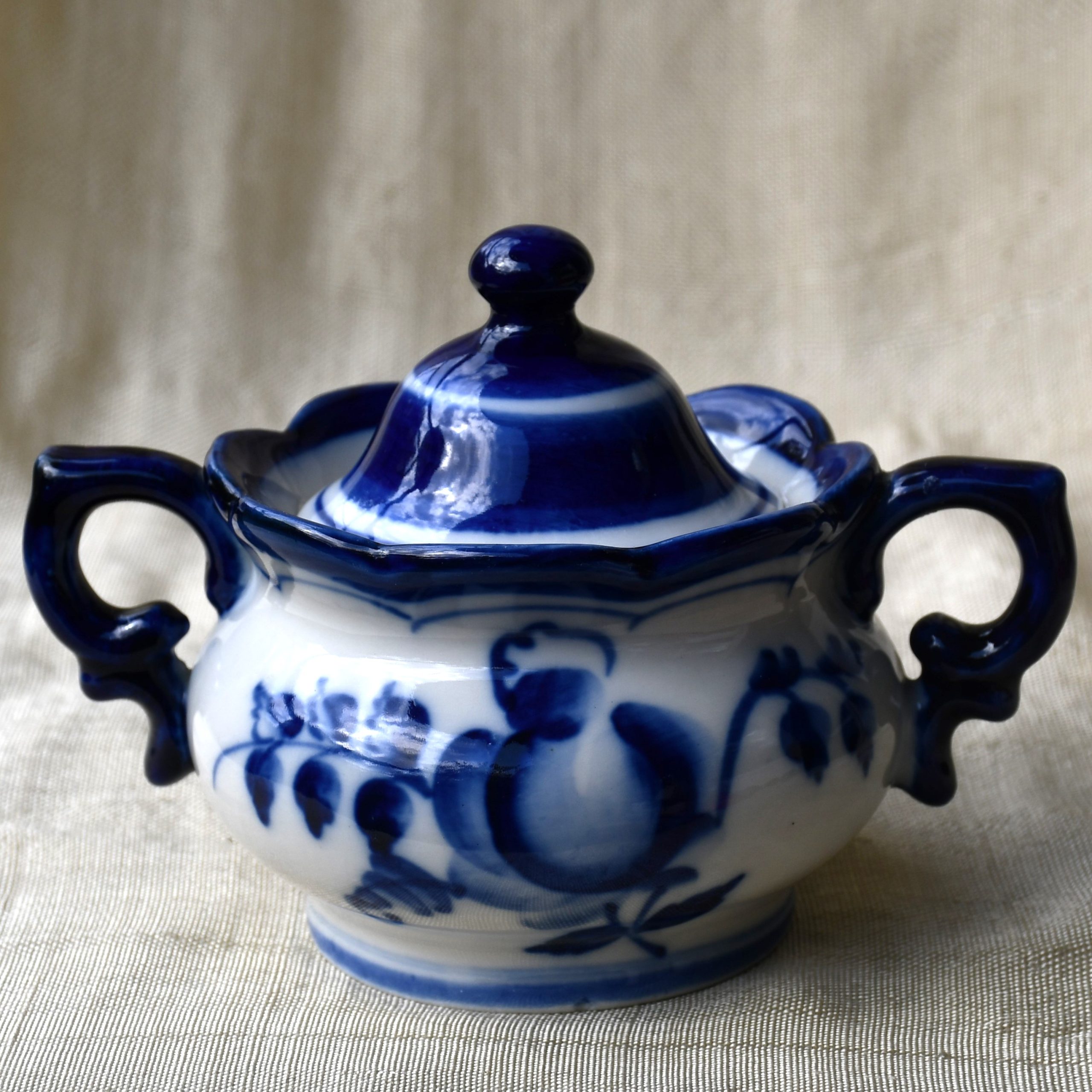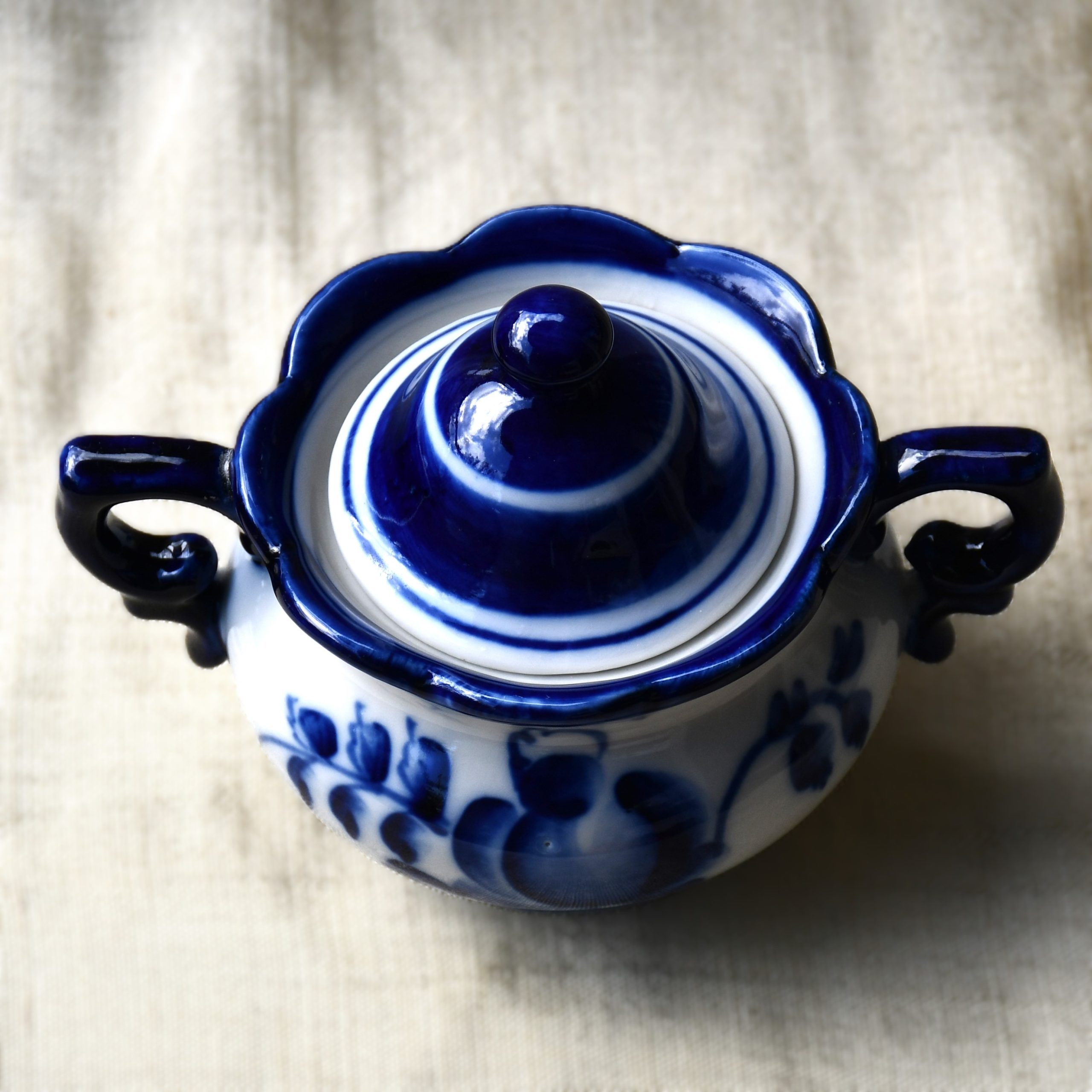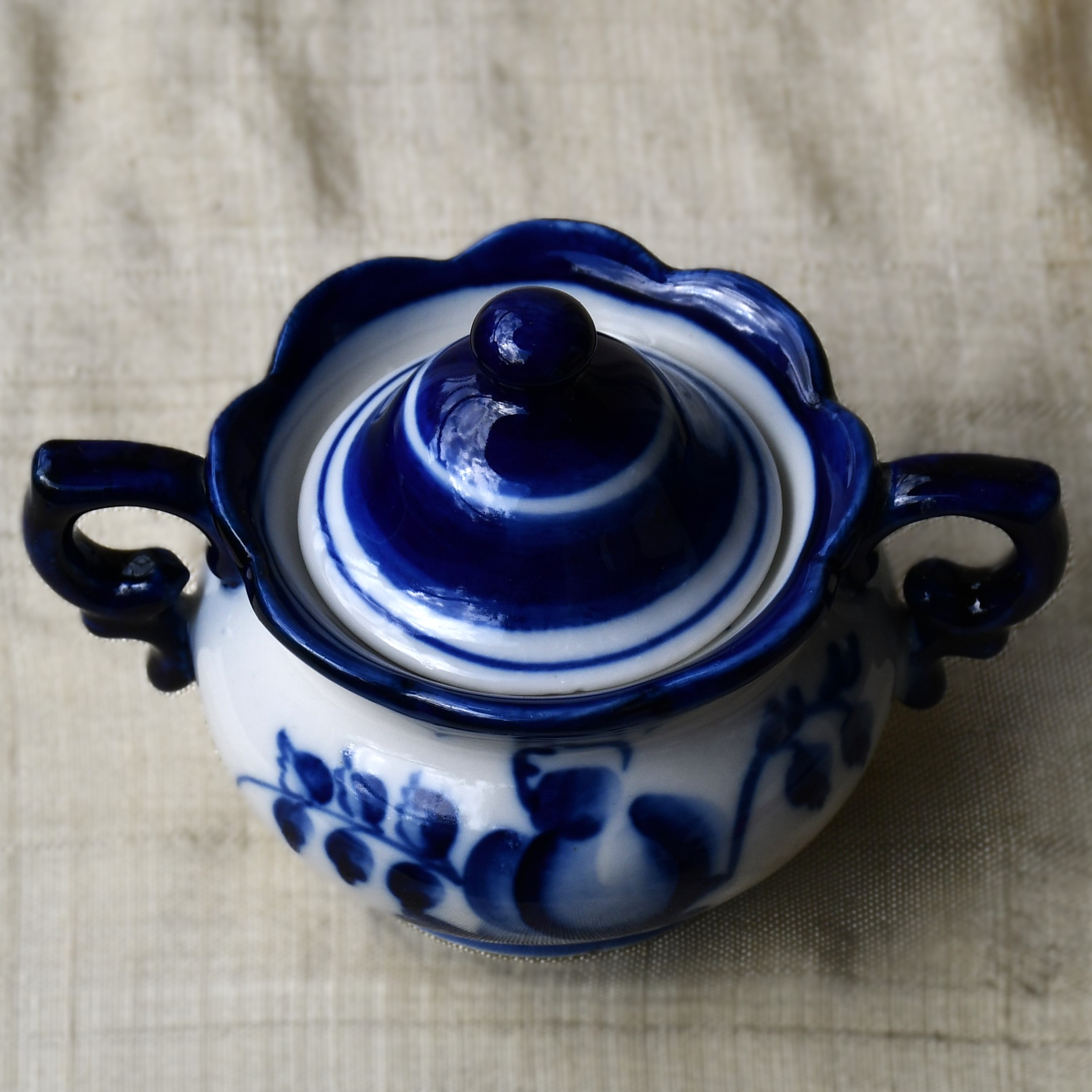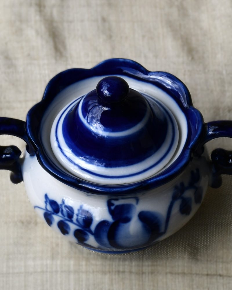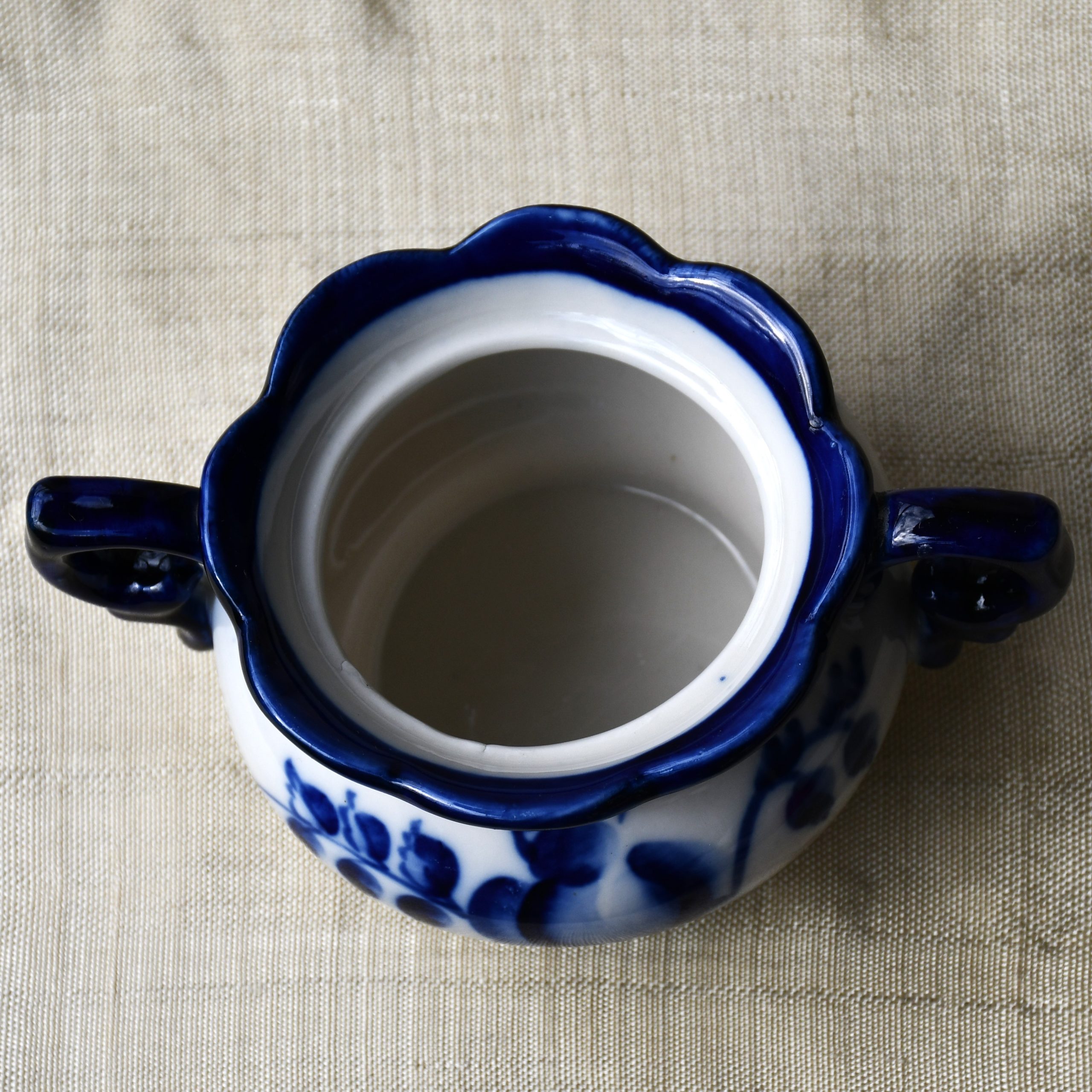 Порцеланова захарница на Гжел. Vintage, датировка втората половина на XXв. Напълно маркирана. Червен печат за първо качество.