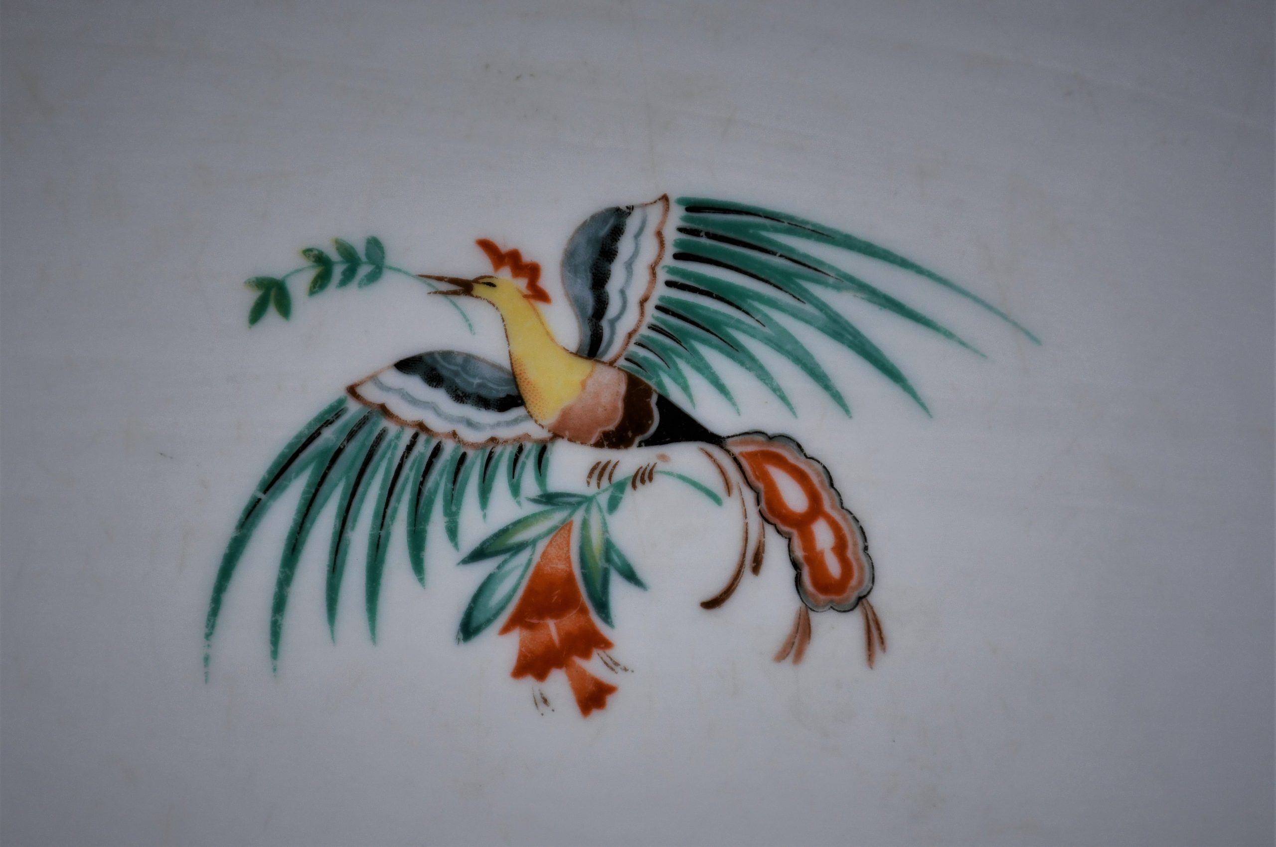 Изключително декоративна. В стил Арт Деко. В центъра е представена райска птица, ръбовете са декорирани с флорални мотиви.