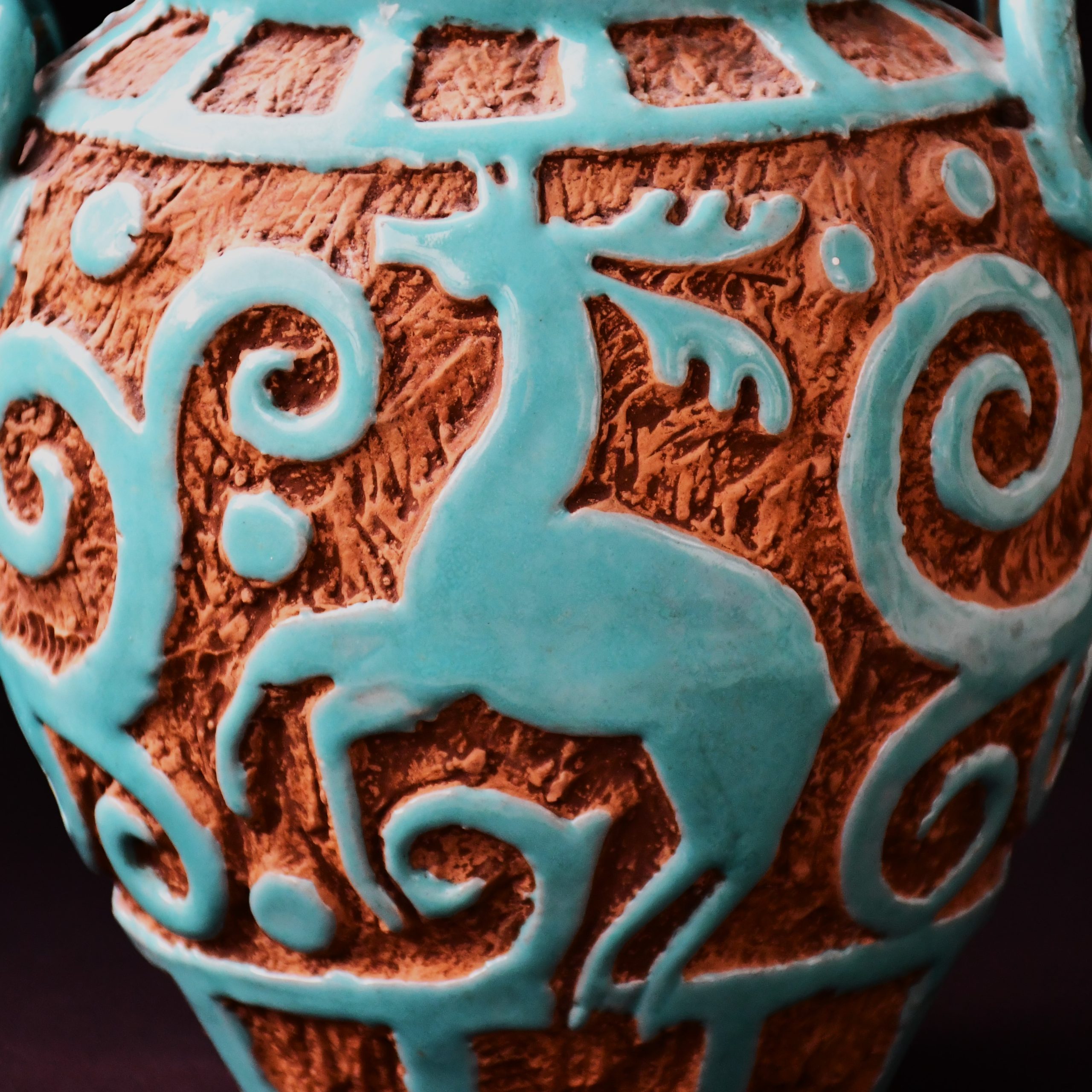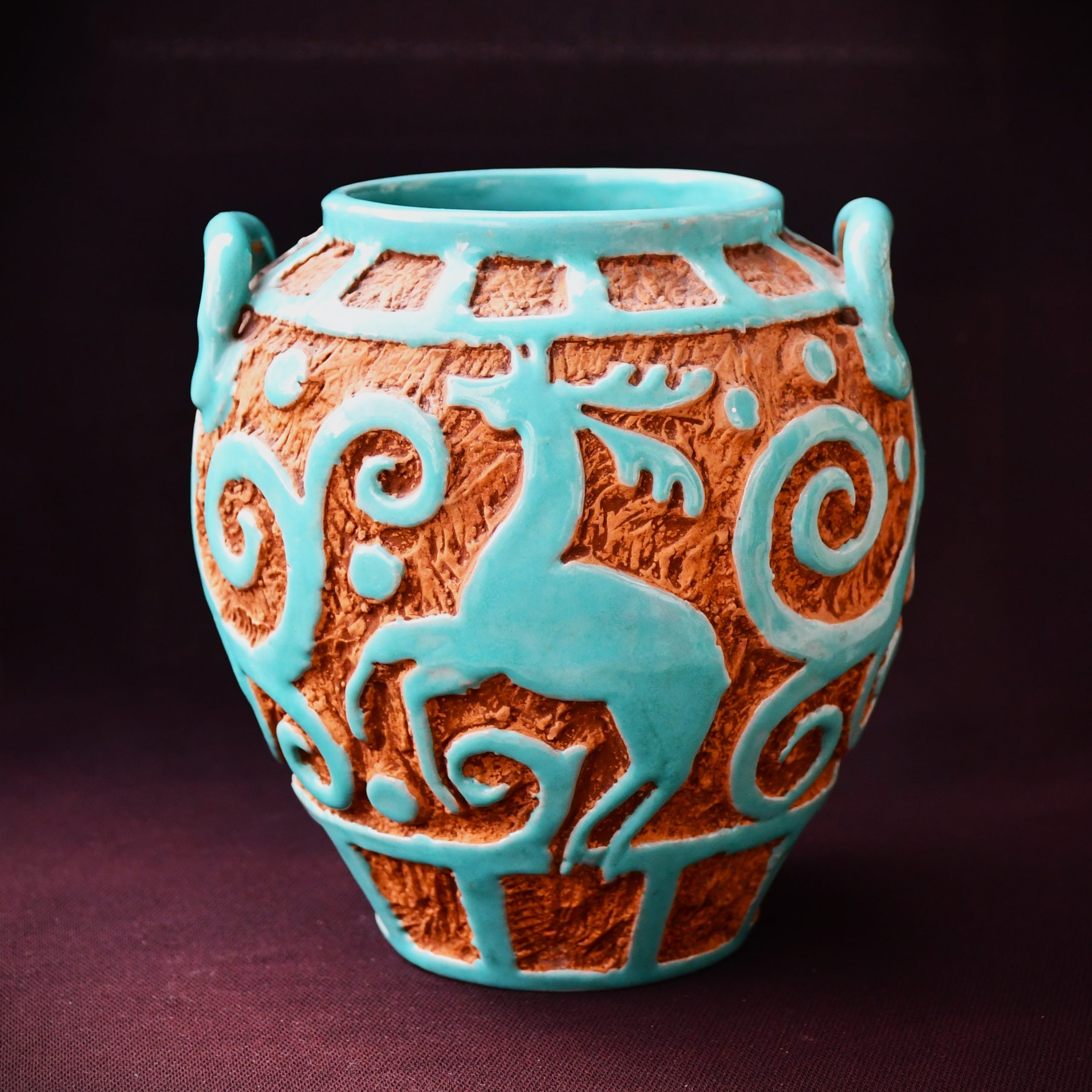 Прекрасно произведение на керамичното изкуство. С класическа форма и високо изпъкнали релефни изображения по външния периметър. Централните фигури са два елена, заедно с ренесансови орнаменти в стила на Албарело.