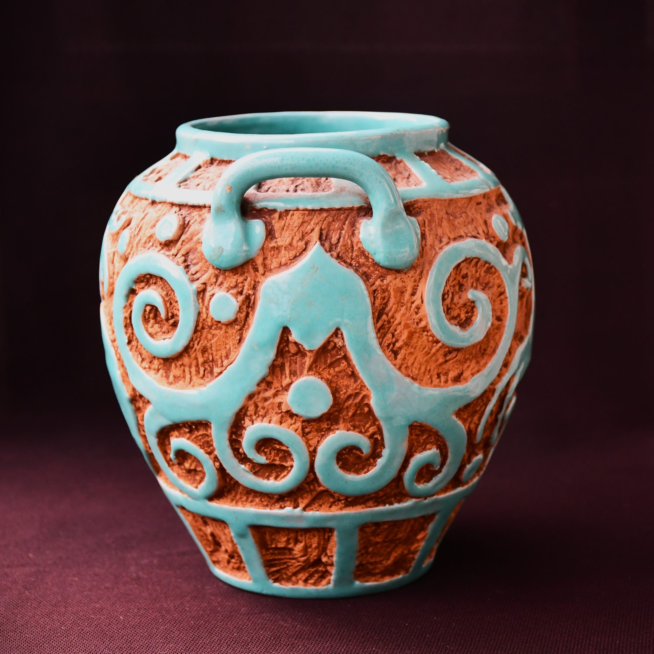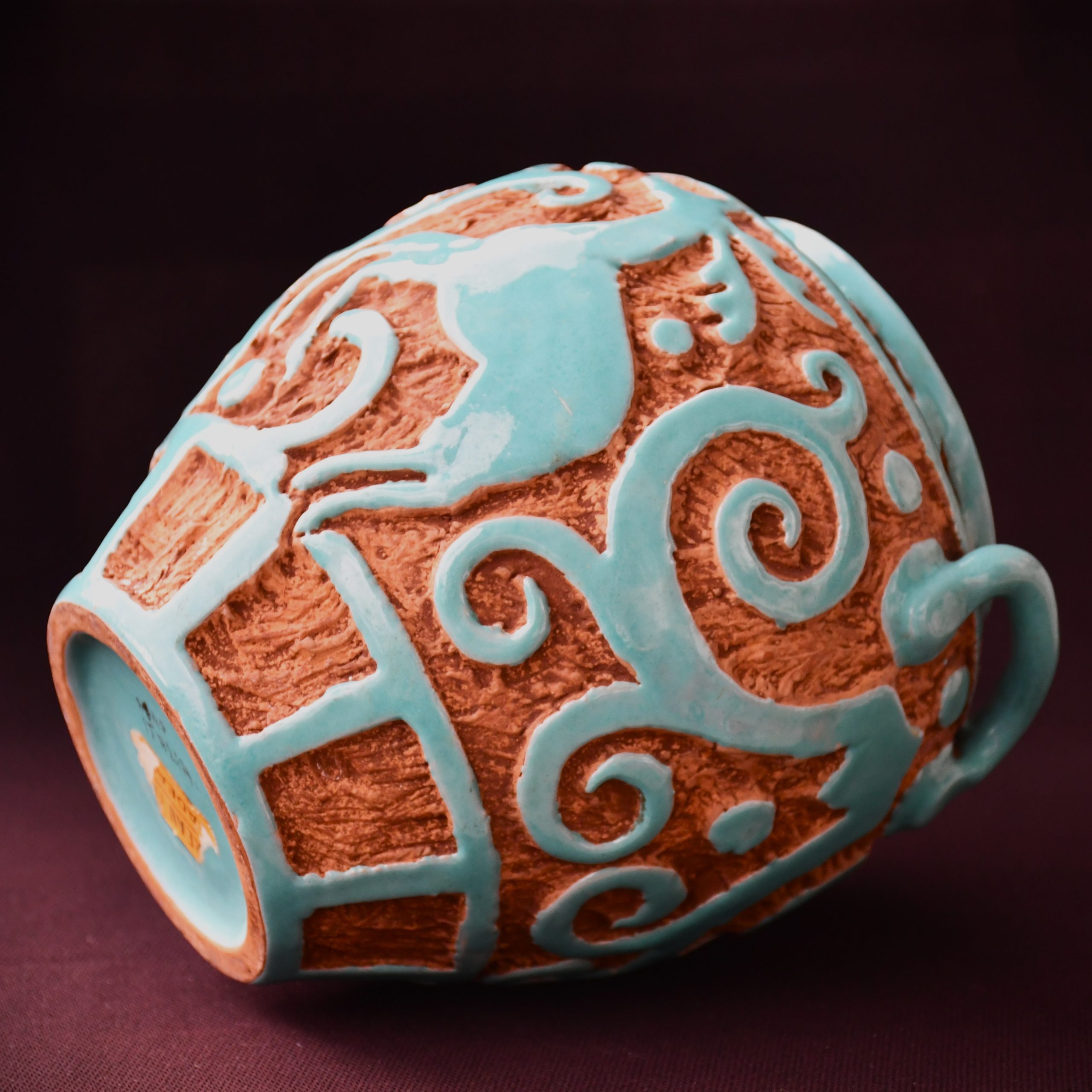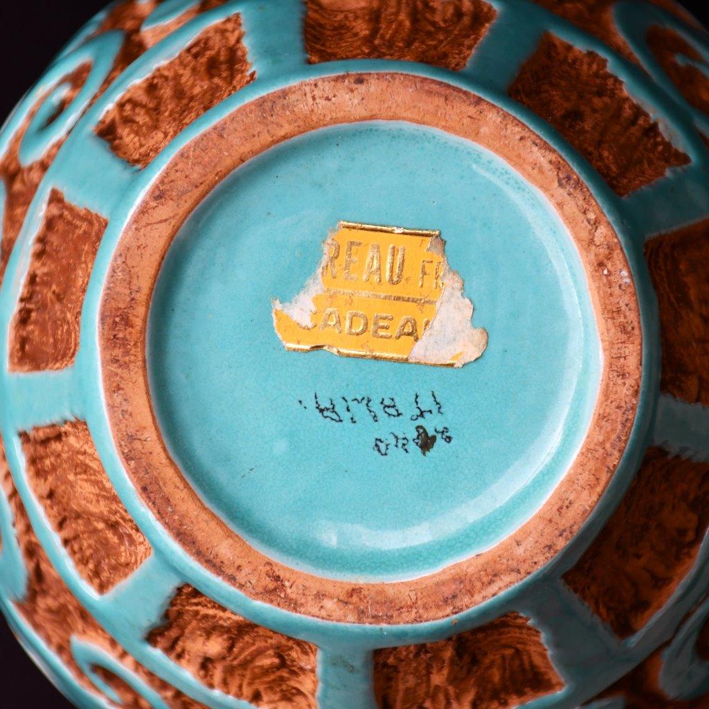 Изработена от червеникаво-оранжева глина (типична за итарлианската керамика) и глазирана в маниера на майоликата вътре и по най-външния слой с цвят на светъл тюркоаз. В отлично винтидж състояние. Няма сериозни забележки. Дребни следи от възрастта и употреба – незначителни. (Онова, което се вижда по снимките като бели петна по глазурата са отражения.)