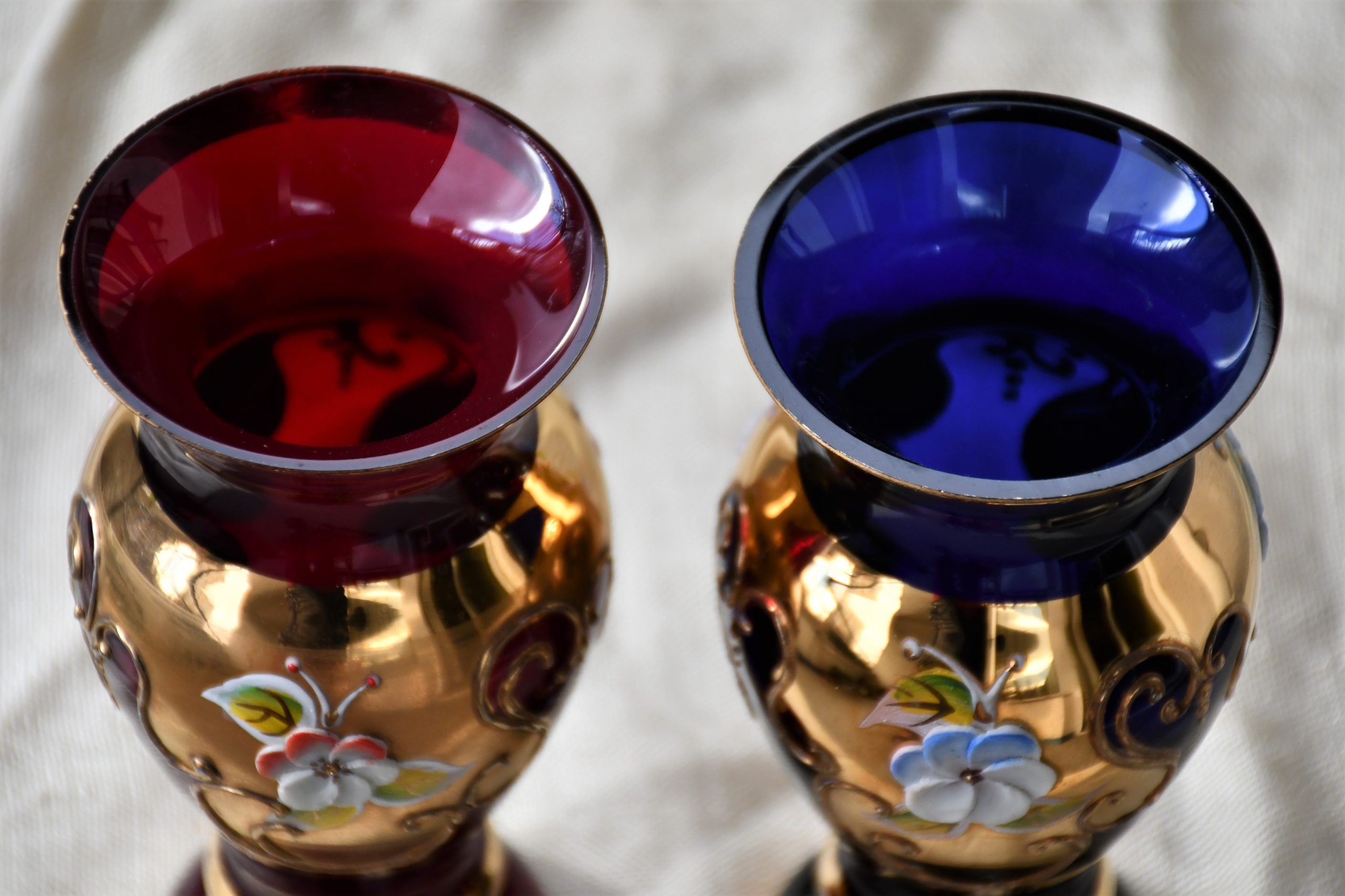 Червена и кобалт: Височина: 14 cm. Диаметър: 6. cm. Тегло: 238 g. всяка.