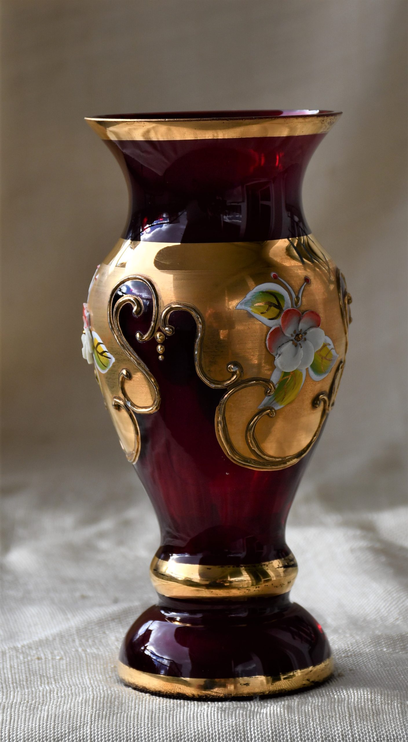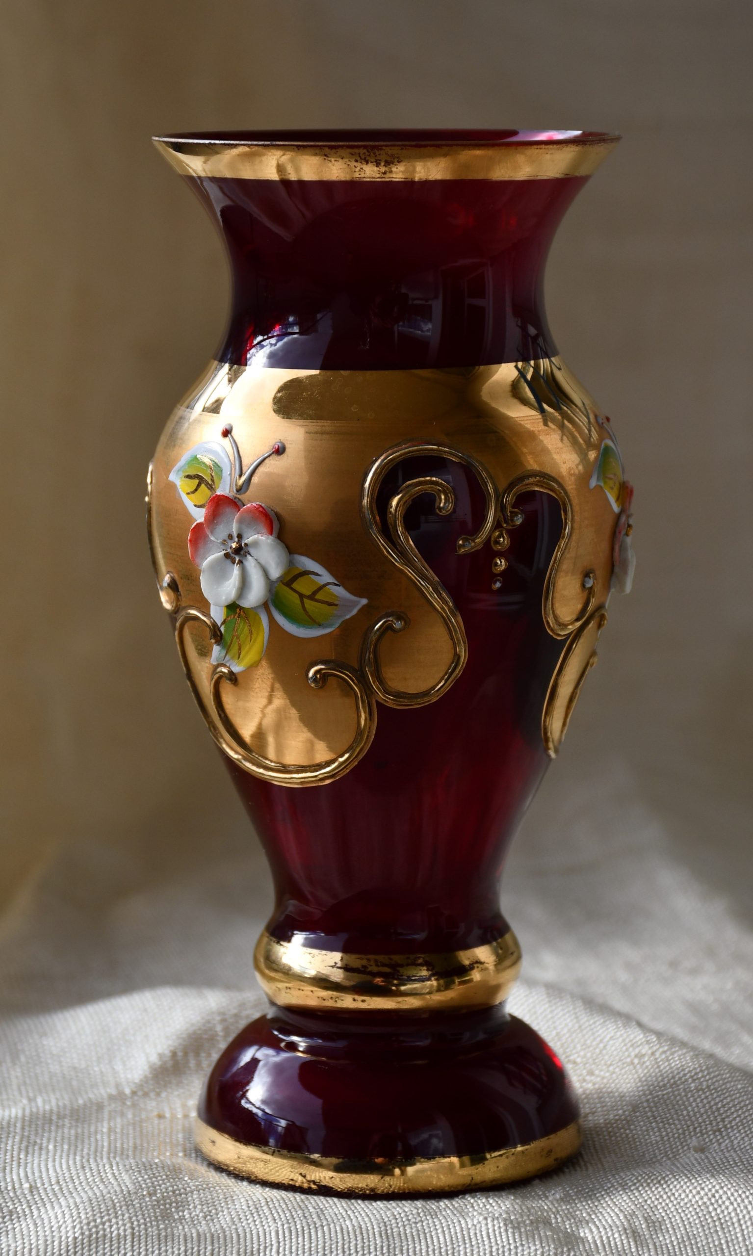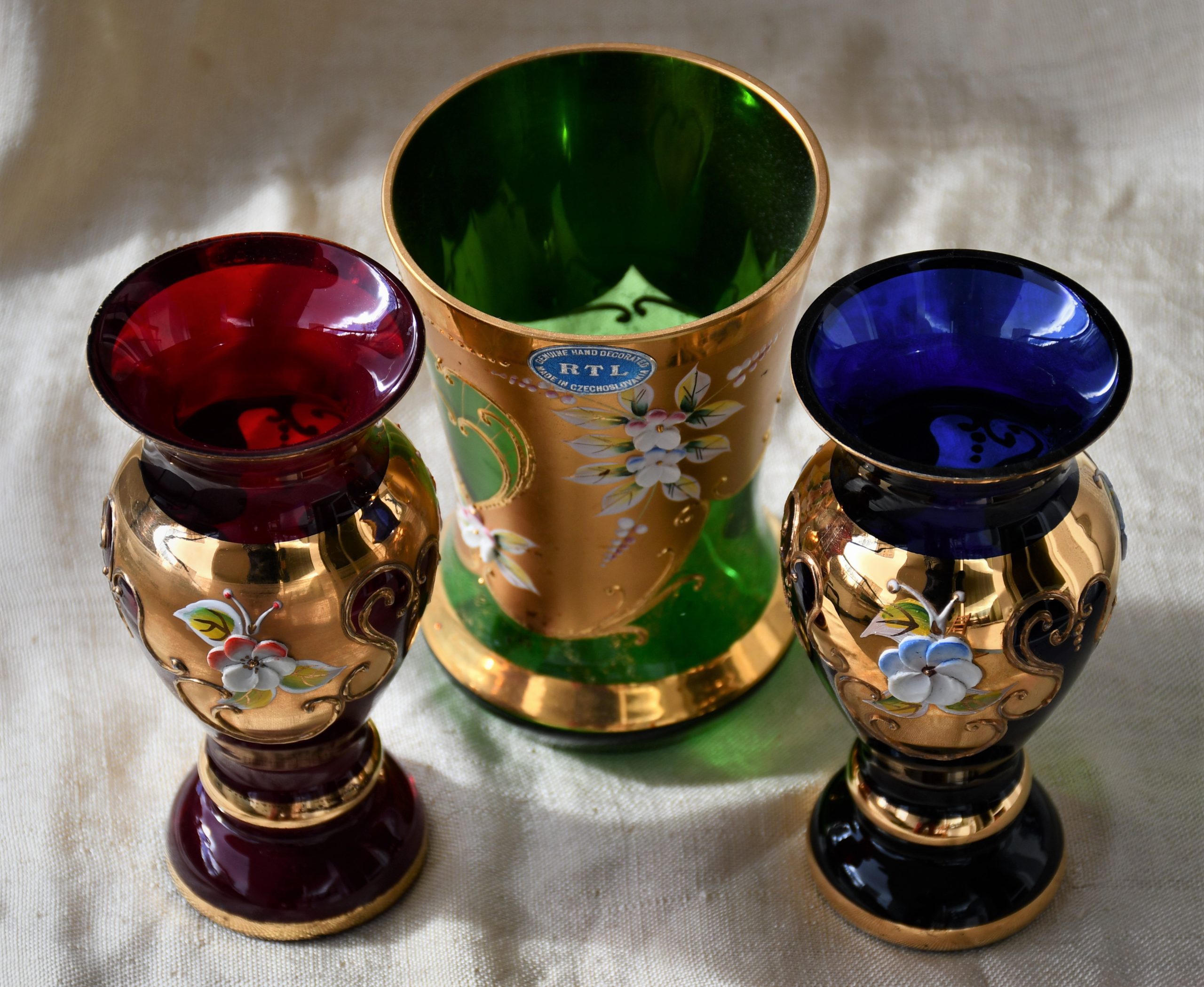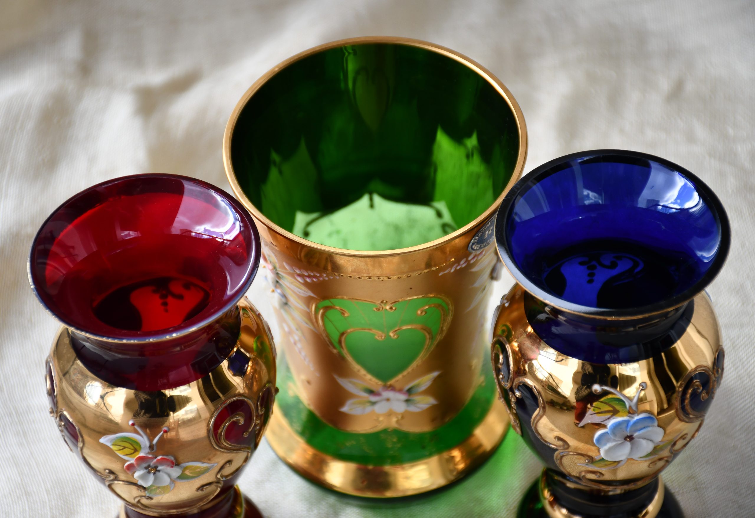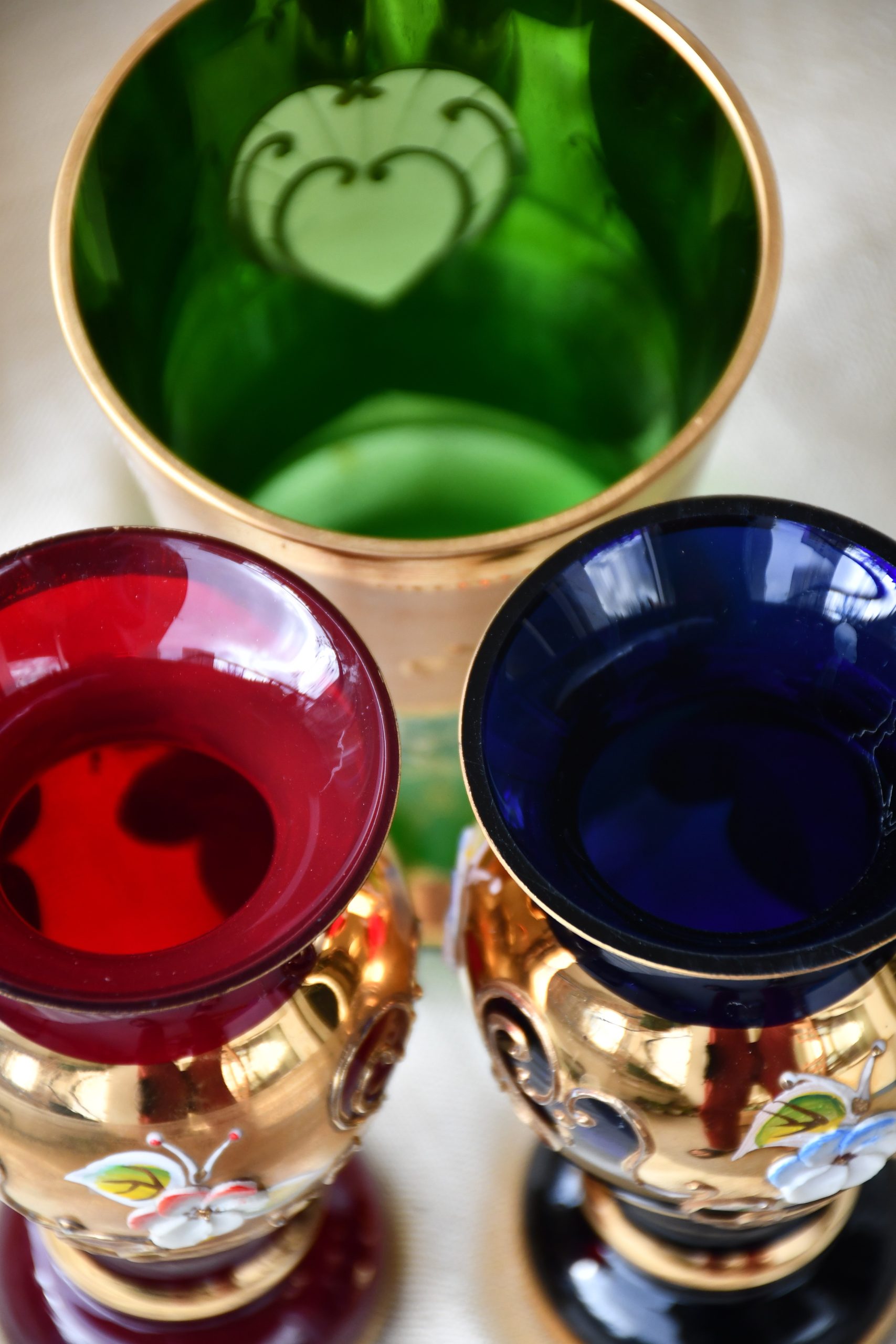 Комплект от 3 сходни по стил вази (зелена, кобалтова и червена), декорирани с полихромен емайл и злато. Прекрасни, цветни, неустоими.