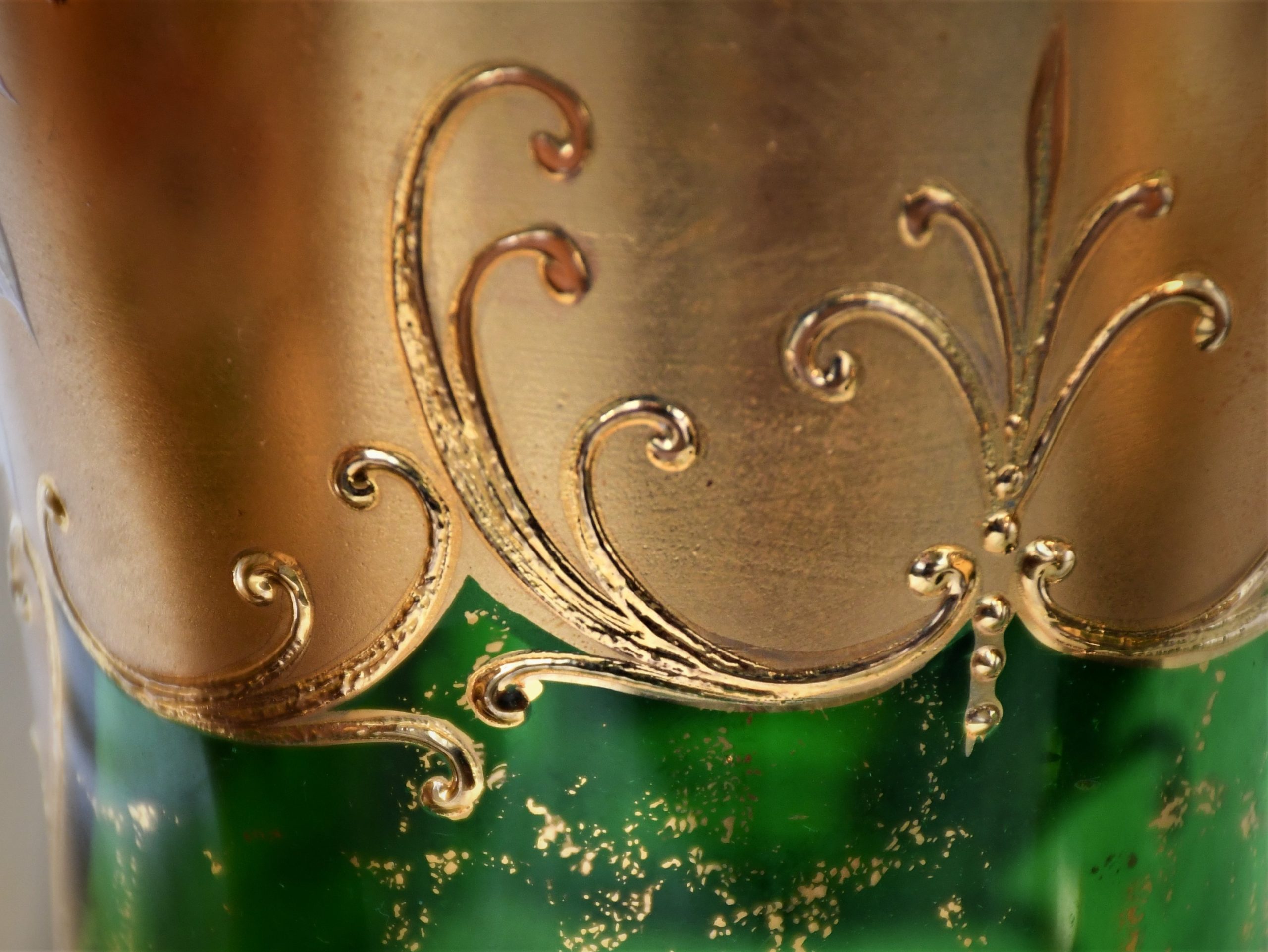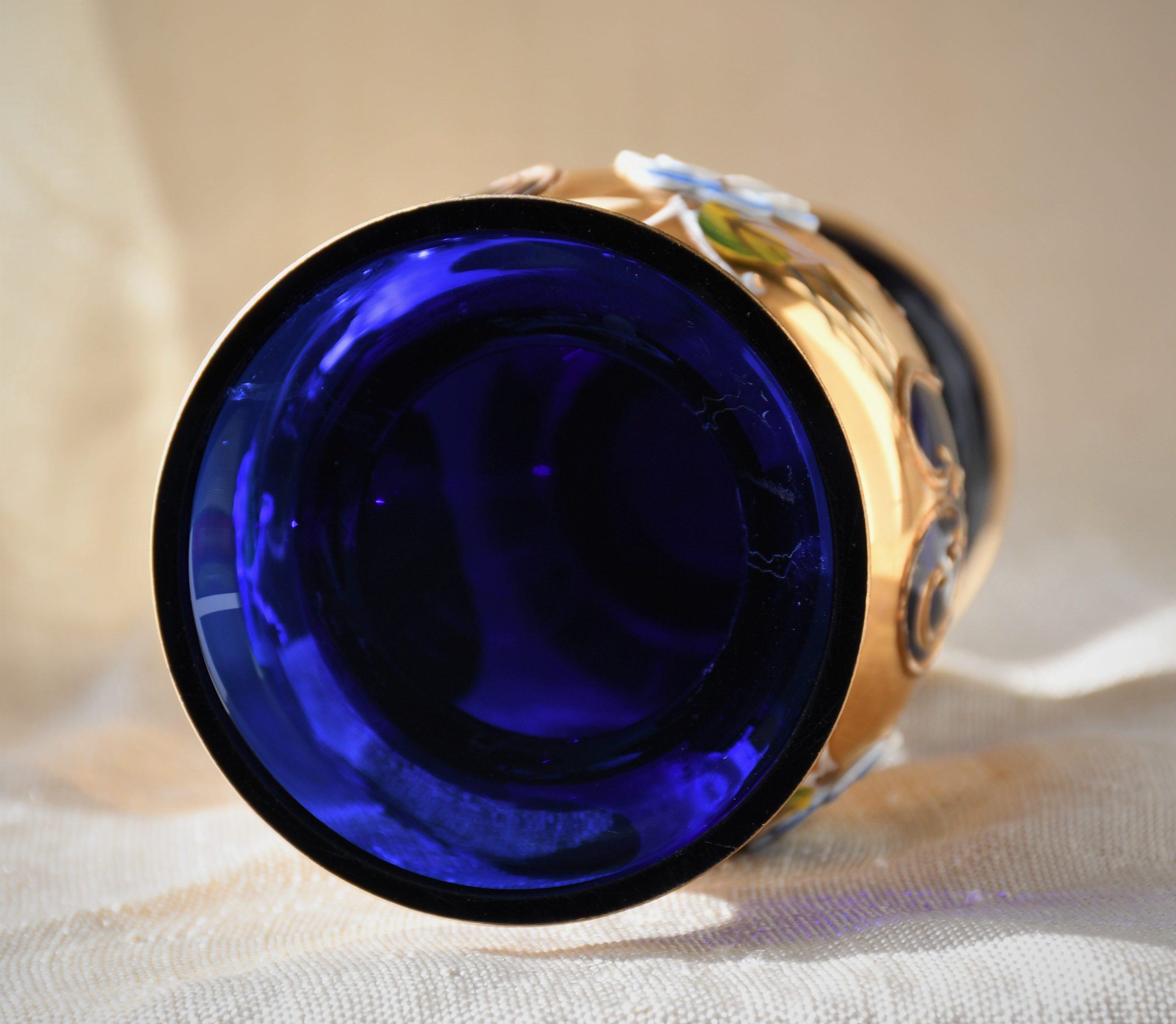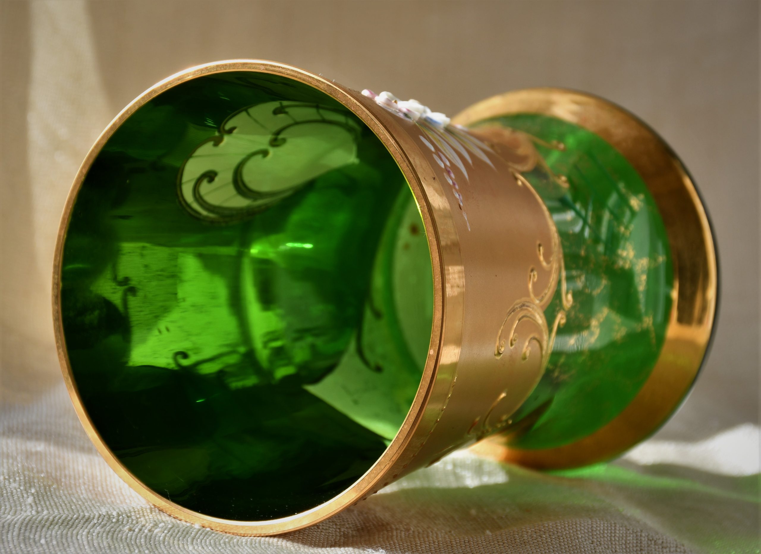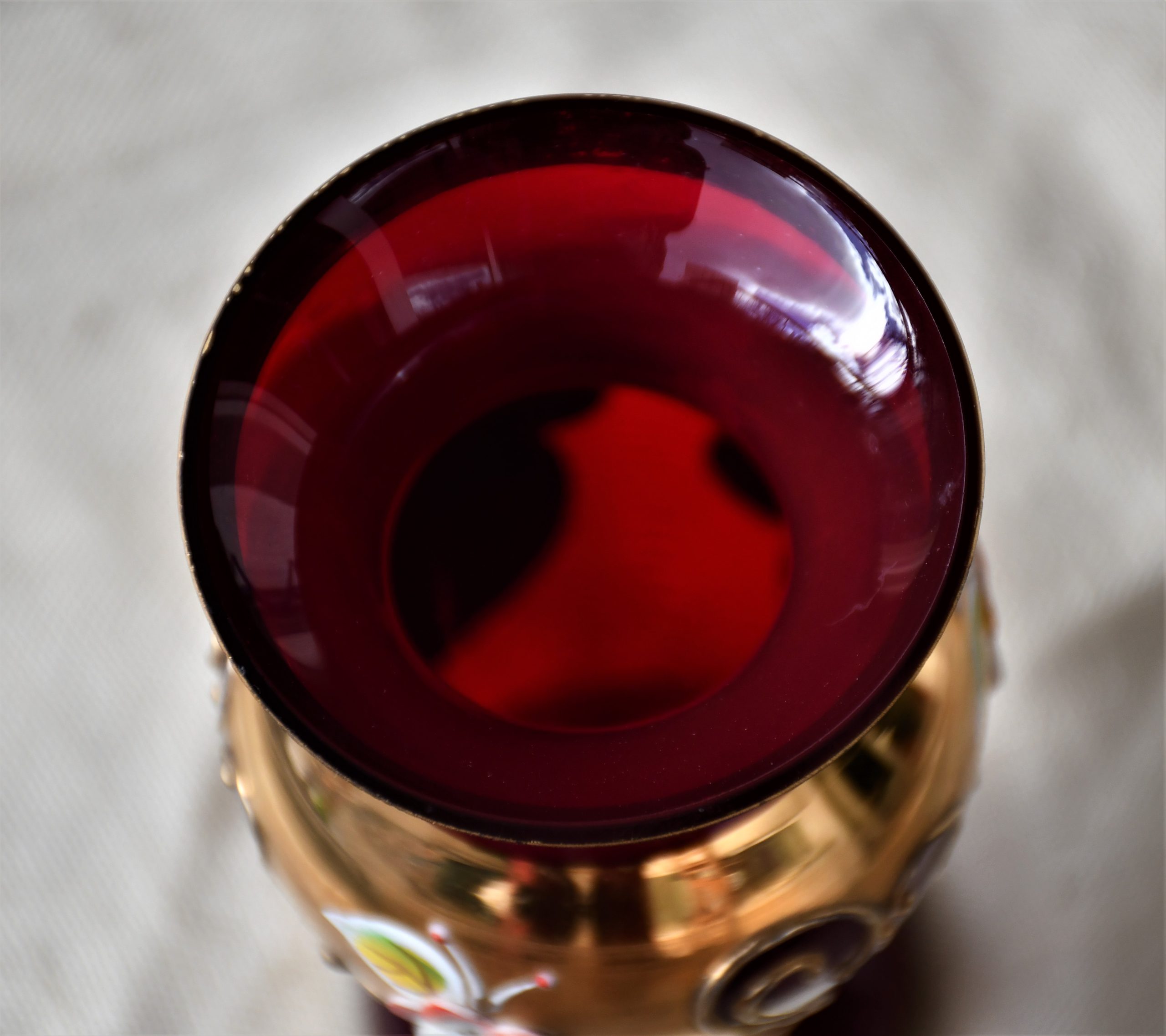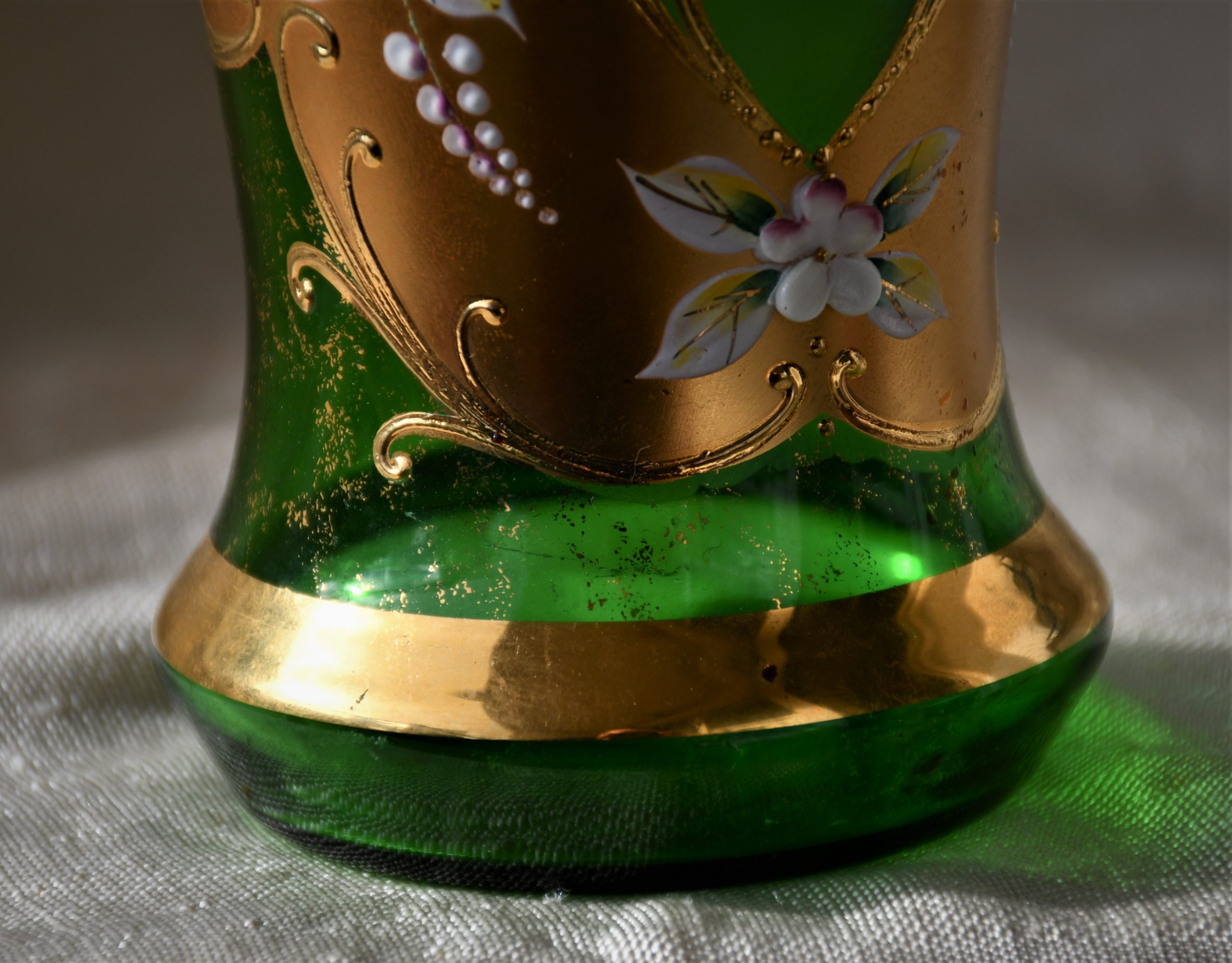 Комплект от 3 сходни по стил вази (зелена, кобалтова и червена), декорирани с полихромен емайл и злато. Прекрасни, цветни, неустоими.