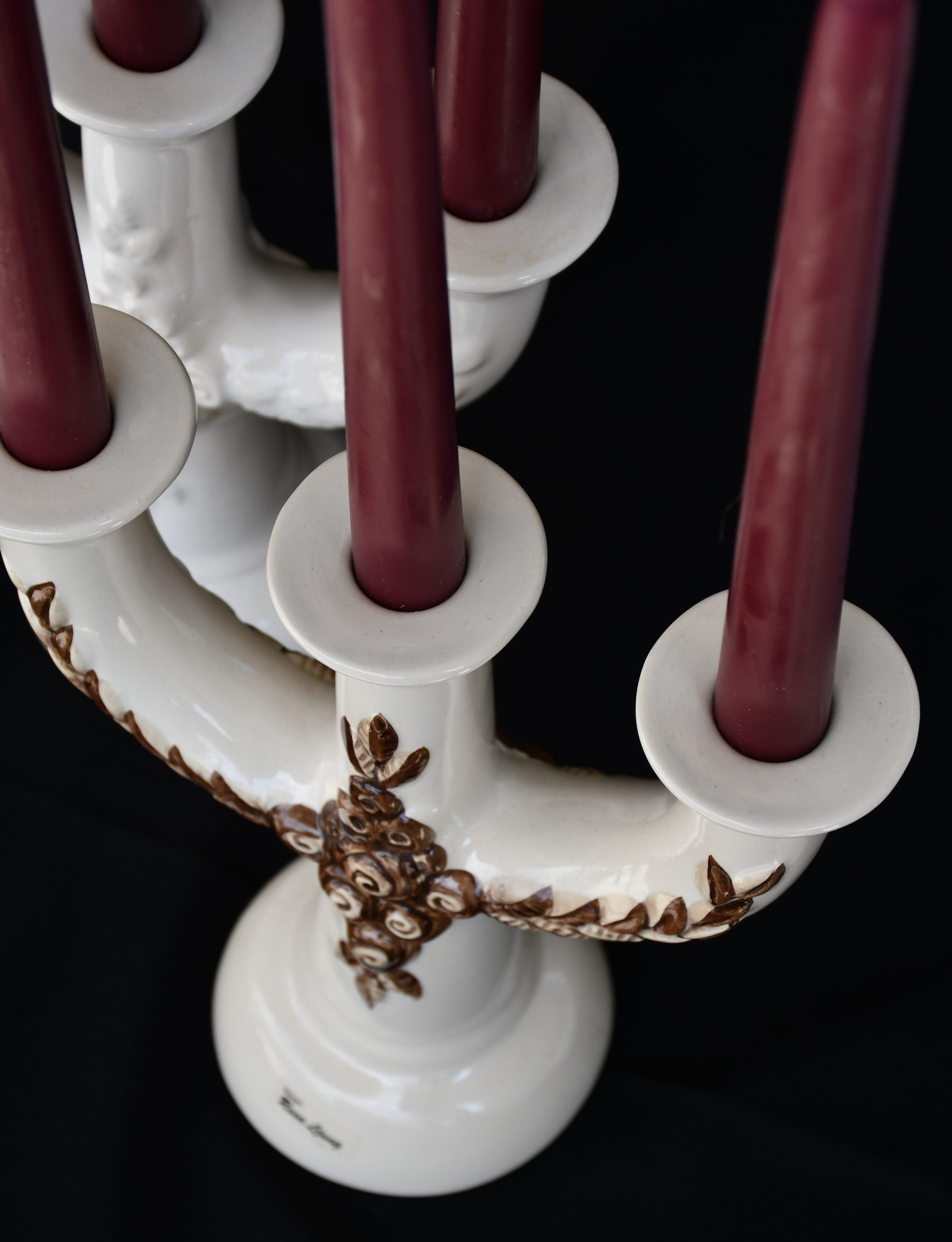 Авторски подпис върху дъното на ръчно оцветения свещник. Оригиналните стикери на производителя са по местата си.