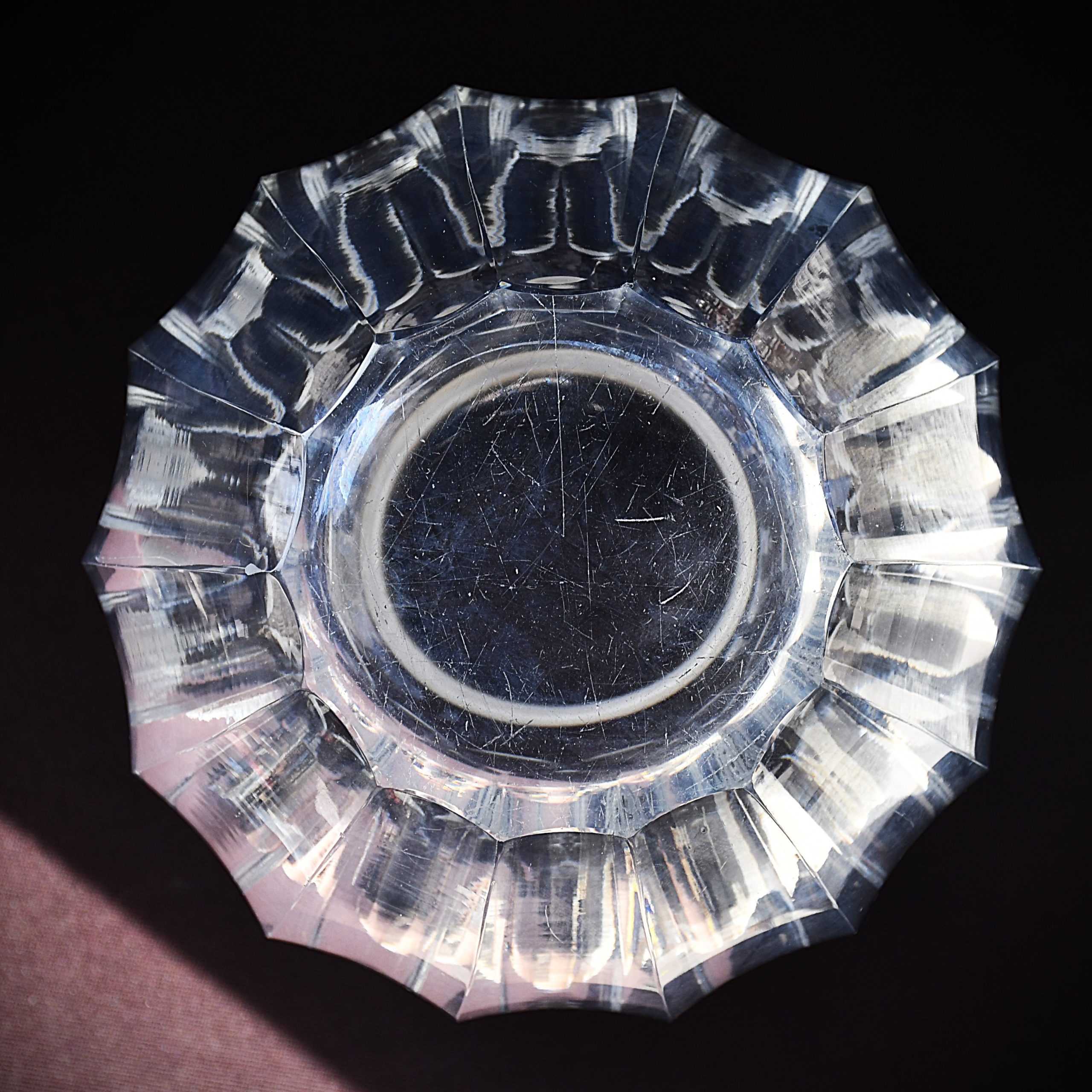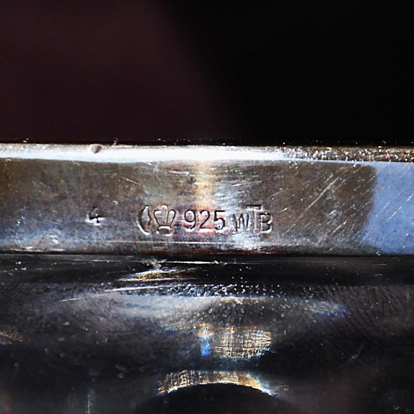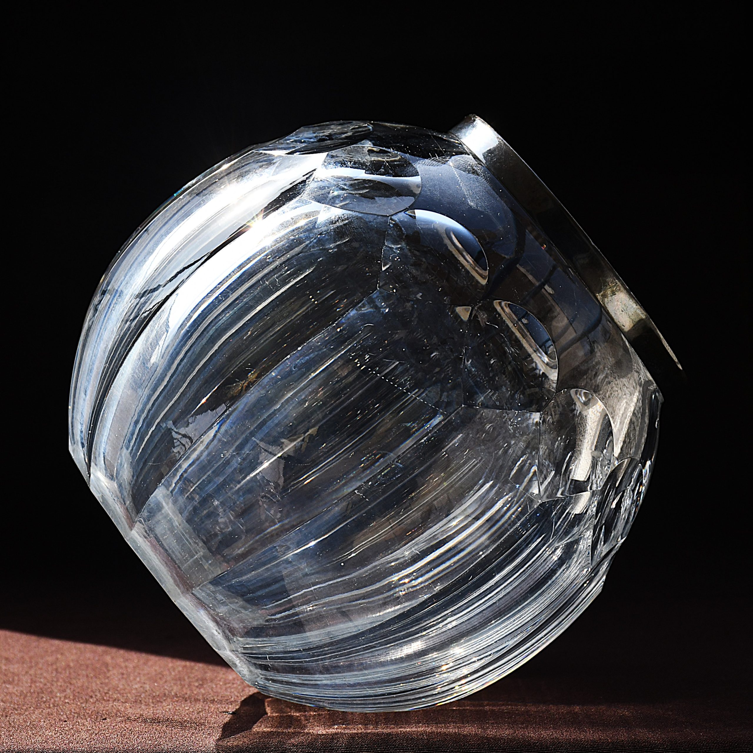 Невероятно красива ваза в стил оп-арт (оптично изкуство) – ръчно гравирана. Кристал с гърло от стерлингово сребро. Западна Германия – между 1955 и 1965-а. Много рядка находка. Маркирана на гърлото с корона, 925 и WTB за Wilhelm Binder Silberwarenfabrik Schwäbisch Gmünd (съществувала от1868 до 1979-а.) Кристалната част е изработена от друг производител, вероятно Nachtmann, Joska-Glas или Friedrich-Glas. При Wilhelm Binder е извършено сглобяването със сребърната яка.