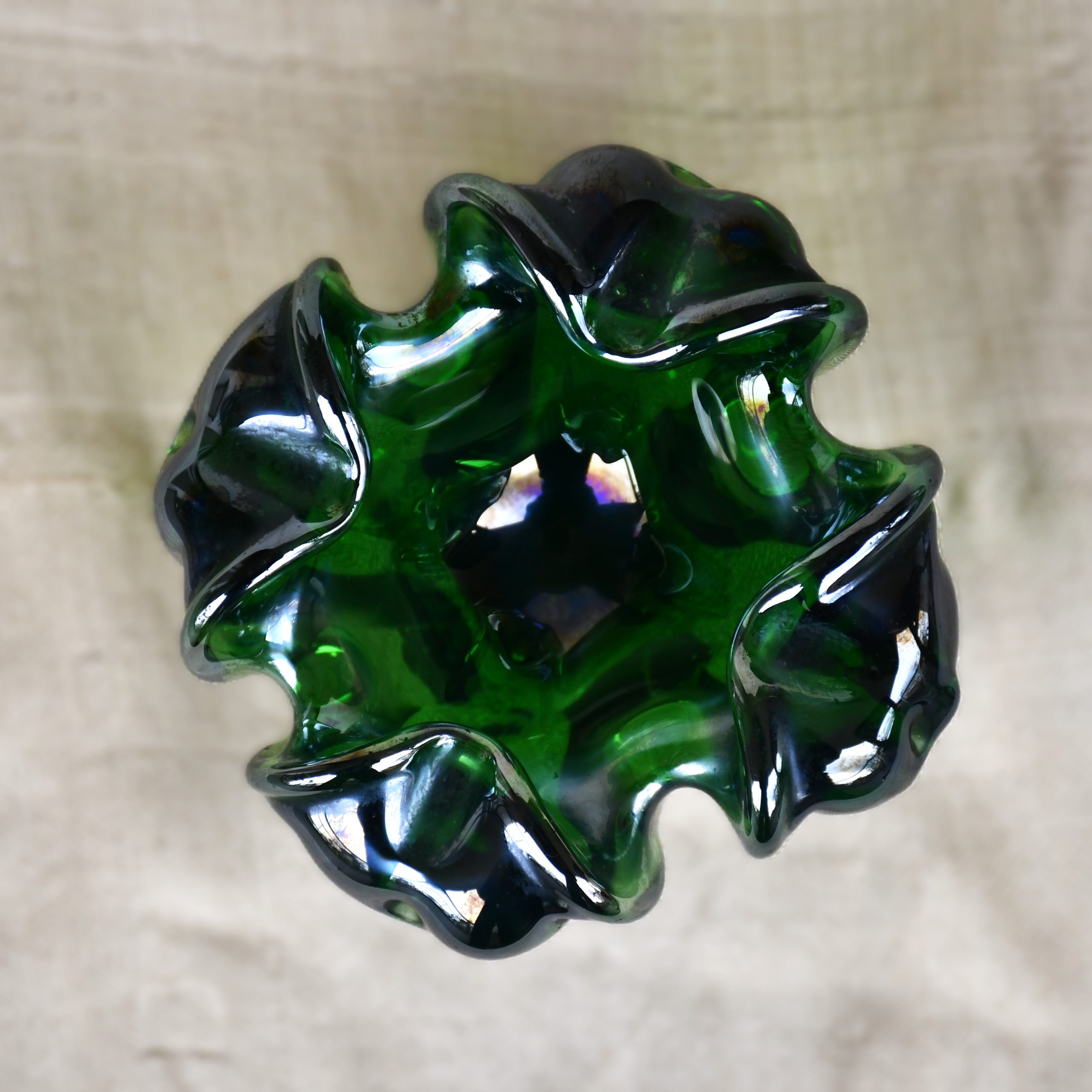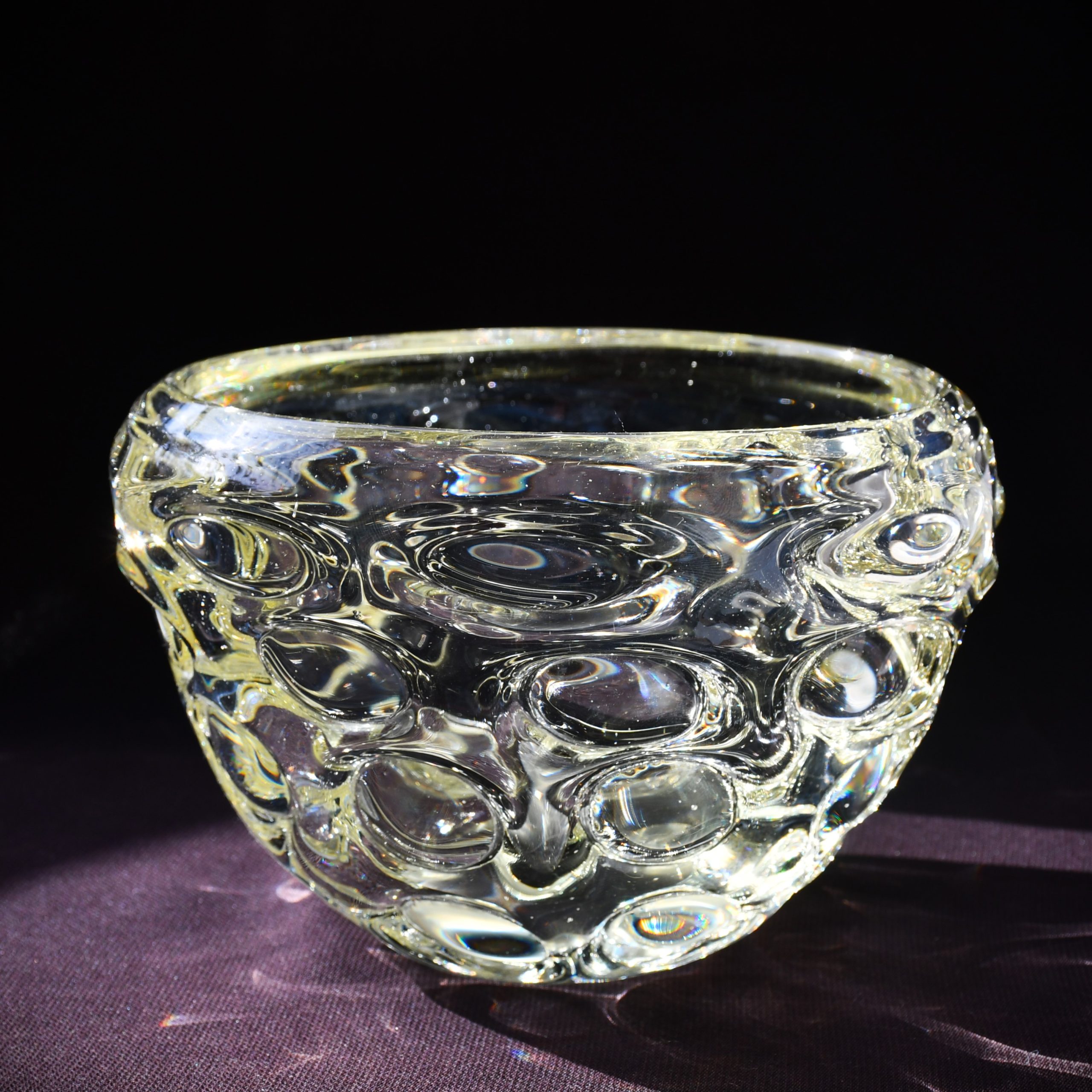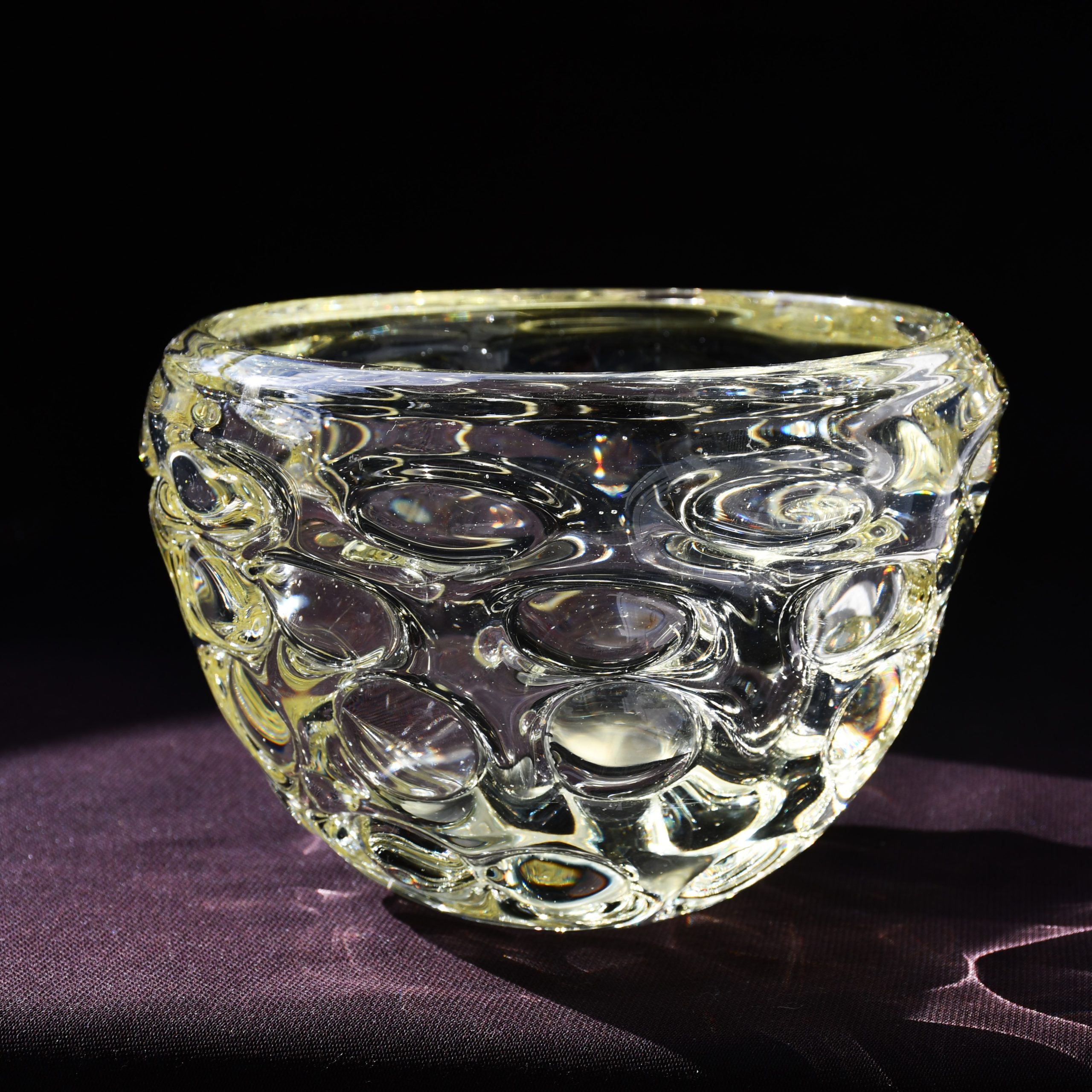 Прекрасно произведение на стъкларското изкуство. С органична кръгла форма и изпъкнали модули по външния периметър. Стабилни стени, тежка основа. Ръчна полировка на дъното.