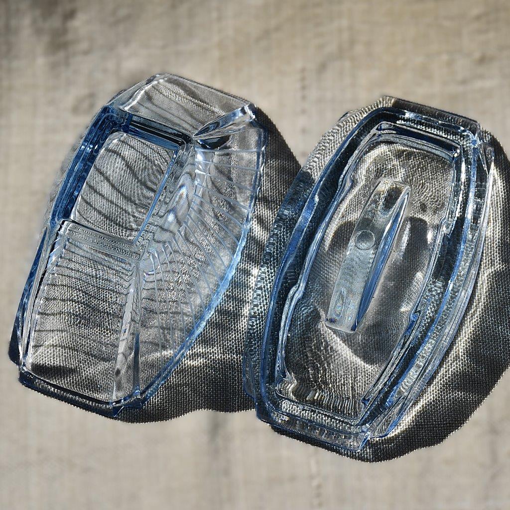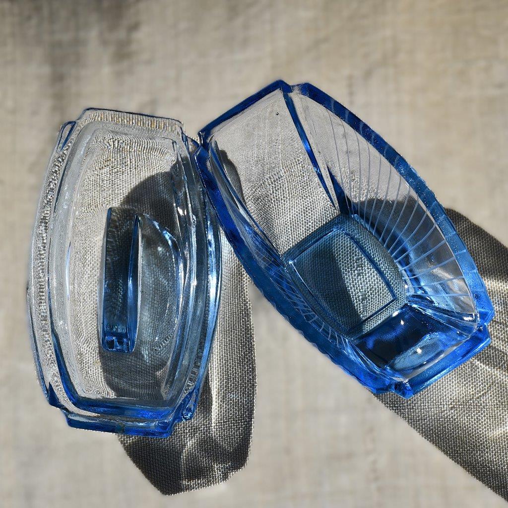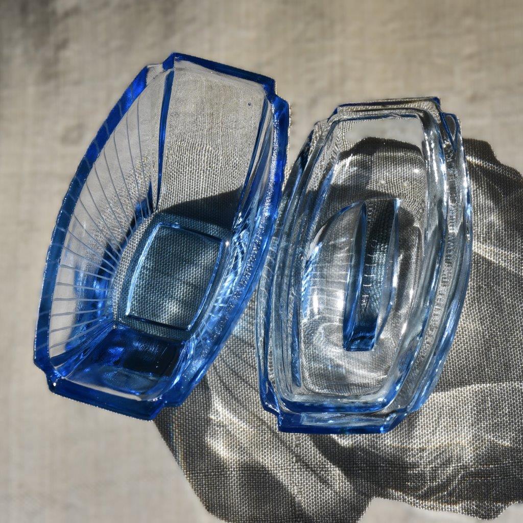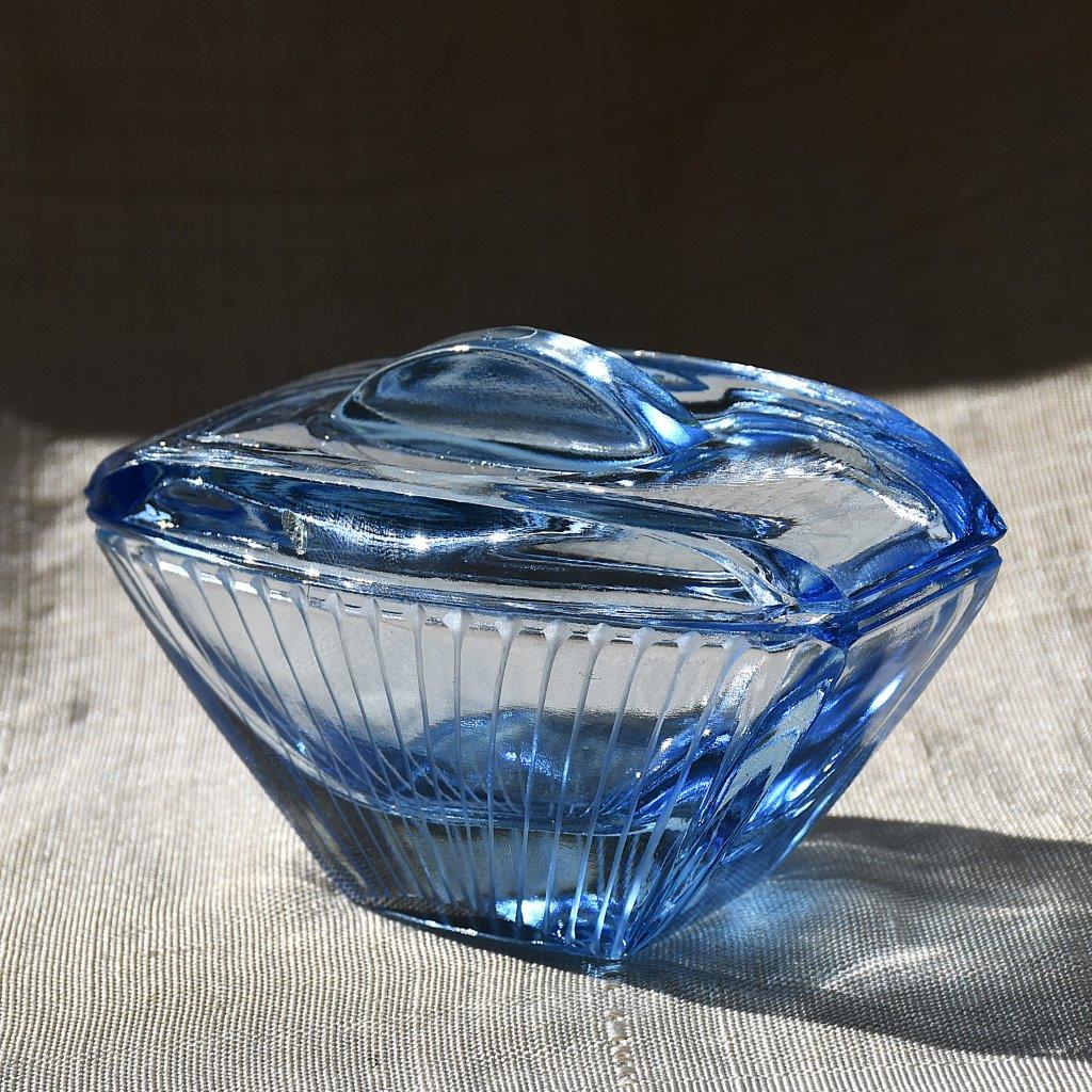Кутия за бижута в стил Art Deco, пресовано сапфирено стъкло. Ръчна гравировка. Вероятно от австрийската кампания Stölzle и завода им в Hermanova Hut, Чехословакия – 30-те години на 20-и век.
