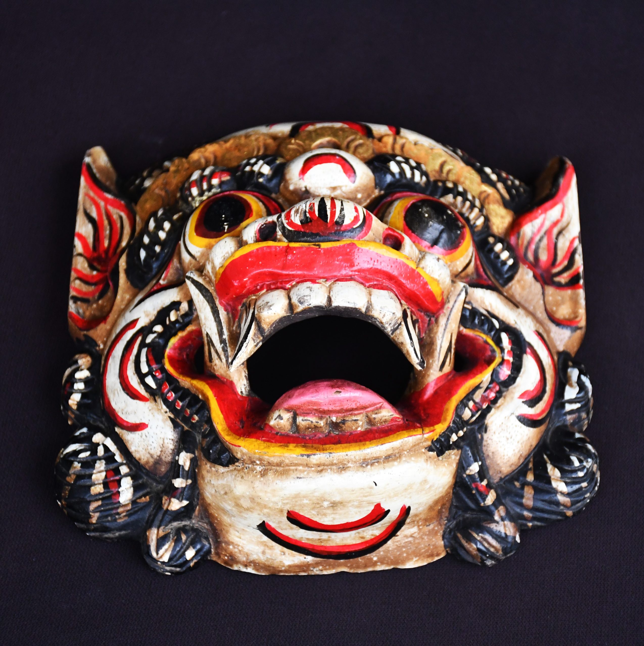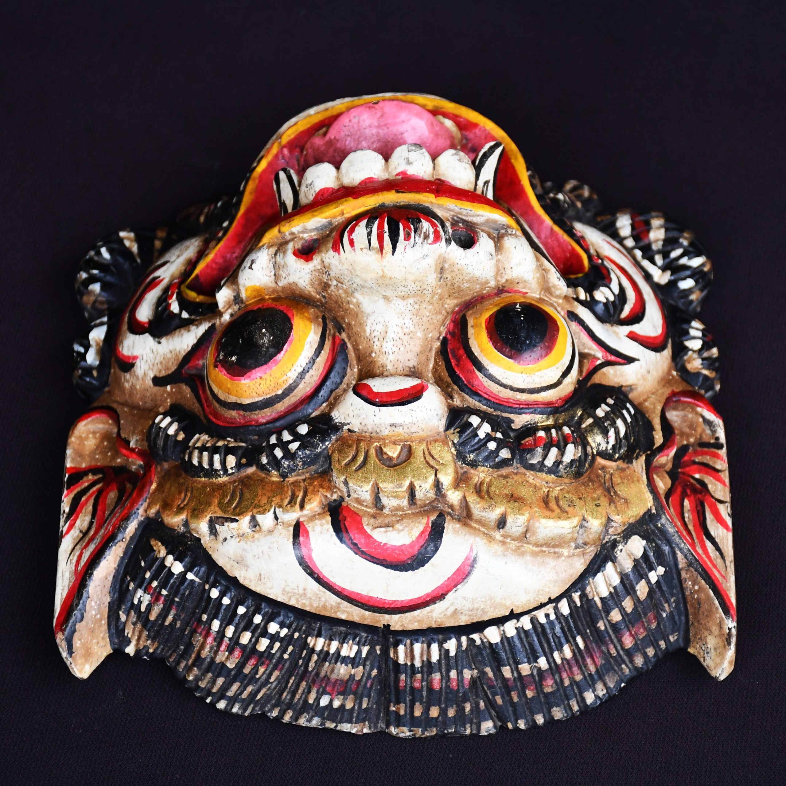 Чудесна vintage маска Barong от Бали. Датировка – втората половина на 20ти век. Ръчно скулптирана от едно парче дърво. (Дървото е леко, най-вероятно балса.) Богата ръчна декорация в полихромия и позлата. С множество майсторски изработени детайли.