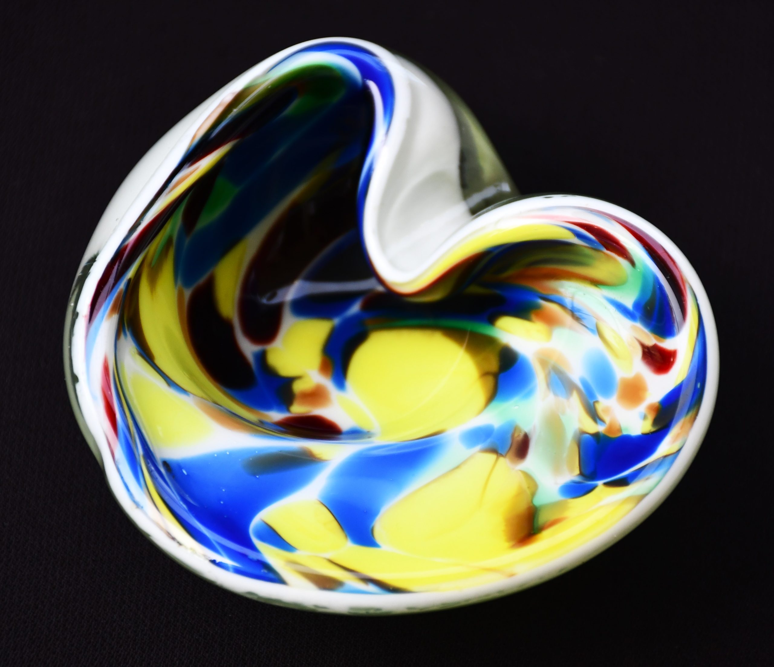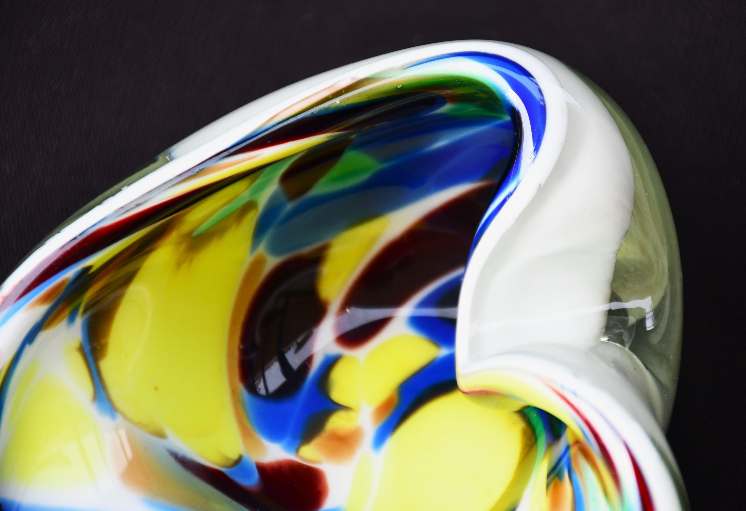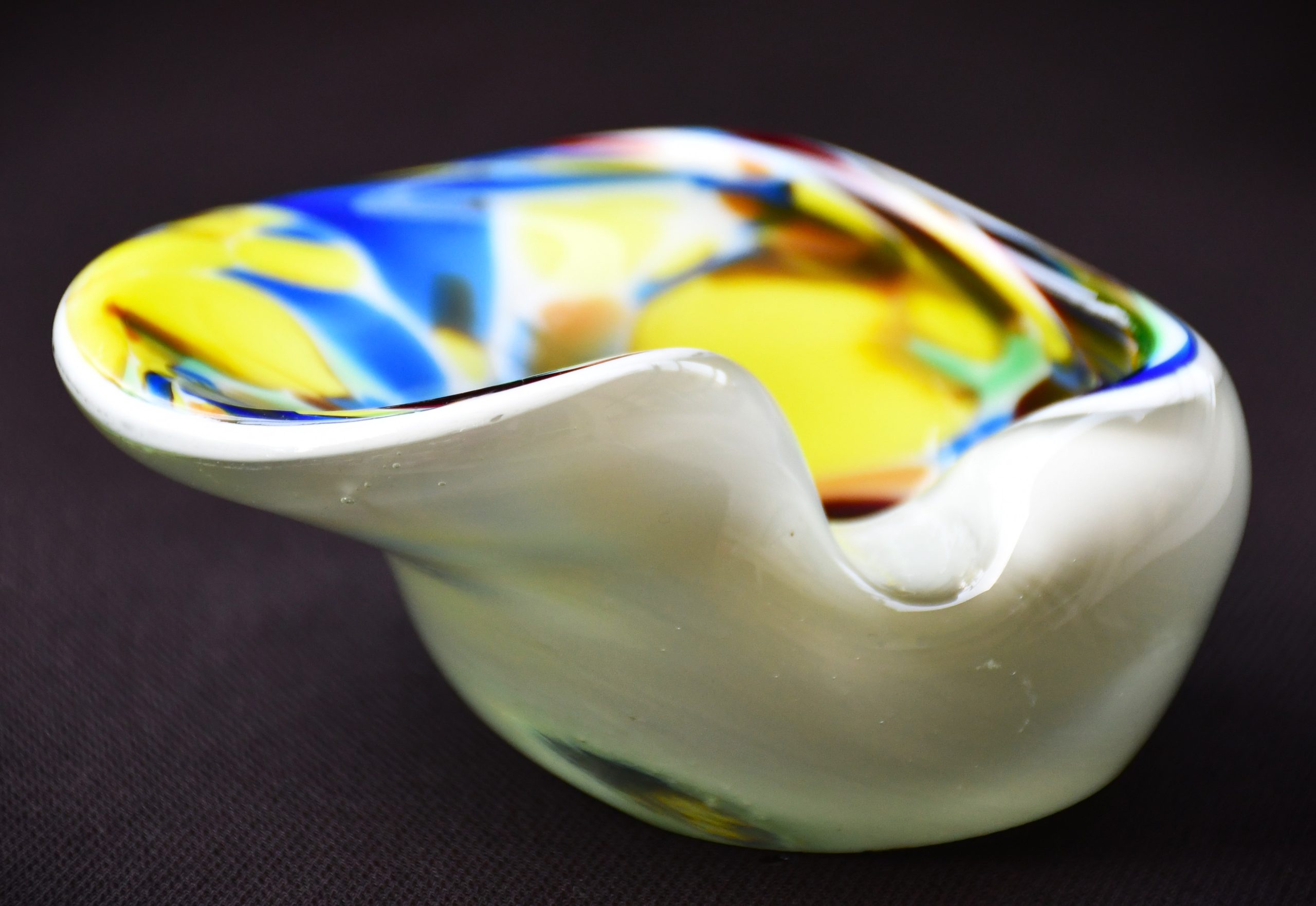 Заоблена органична форма, много декоративна и стилна. Прозрачно стъкло обхваща бяла база, изпъстрена с многоцветни петна. Полирано дъно. Използвана е венецианската „сомерсо“ технология. Перфектен екземпляр на mid century стила.