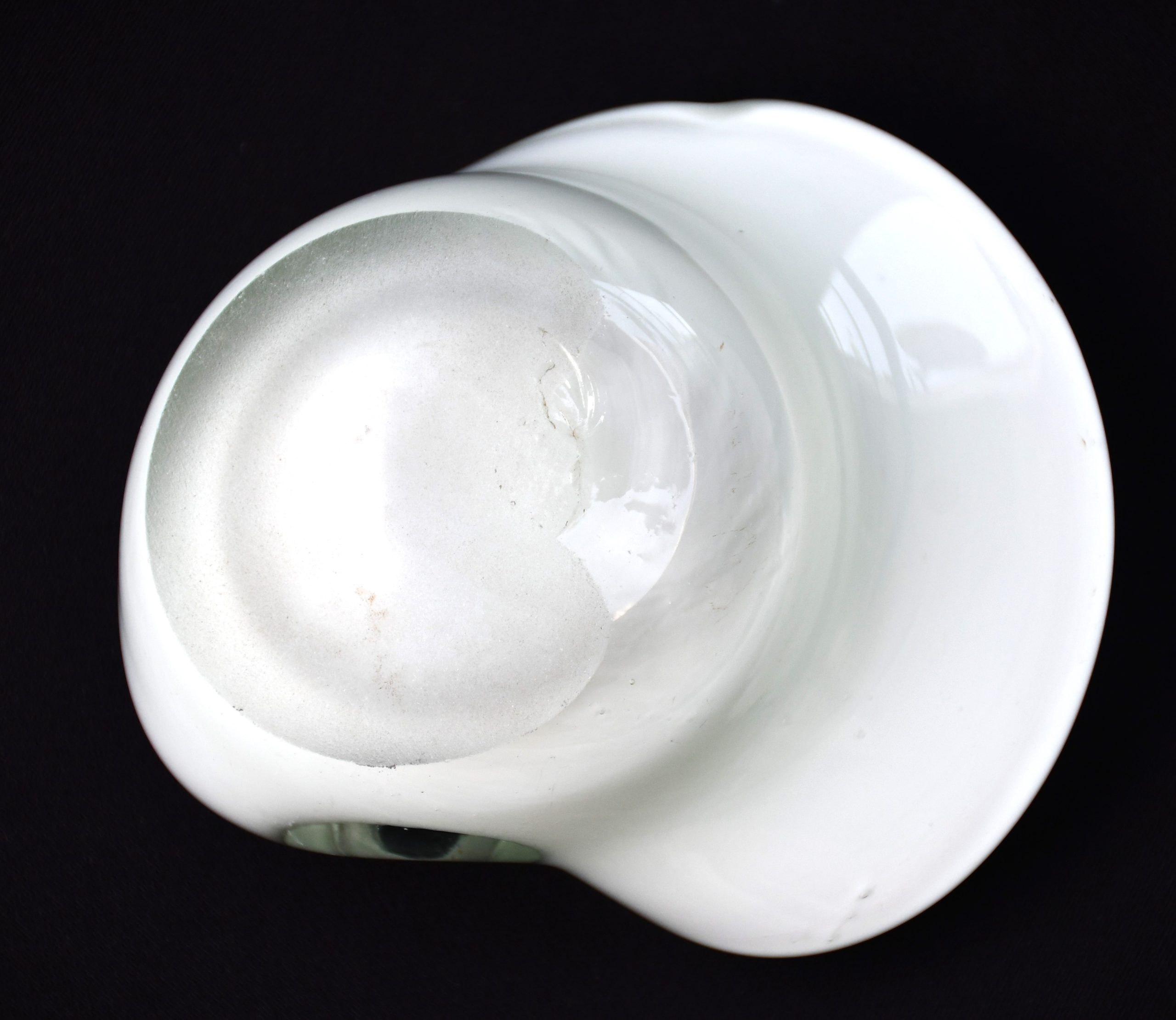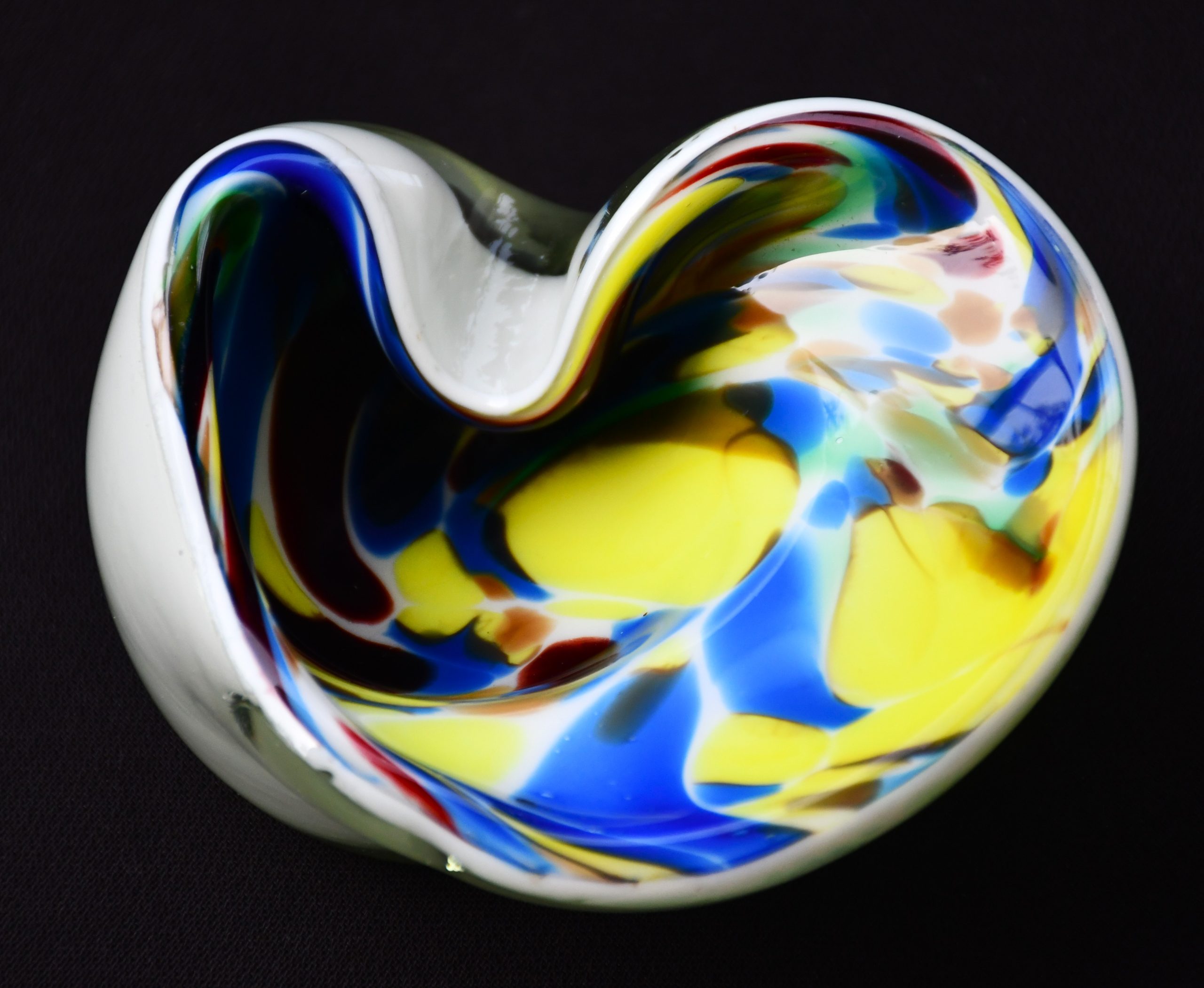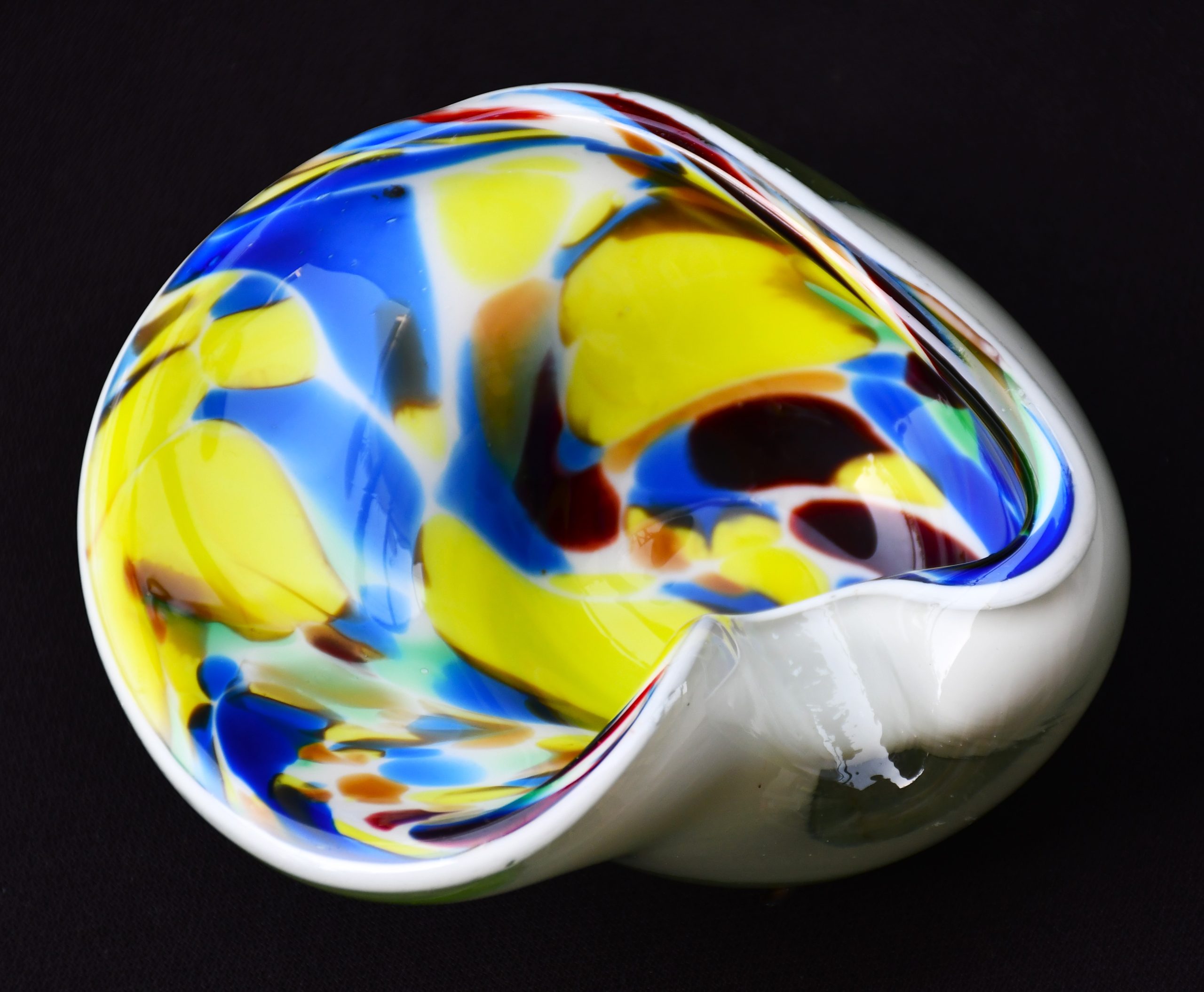 Заоблена органична форма, много декоративна и стилна. Прозрачно стъкло обхваща бяла база, изпъстрена с многоцветни петна. Полирано дъно. Използвана е венецианската „сомерсо“ технология. Перфектен екземпляр на mid century стила.