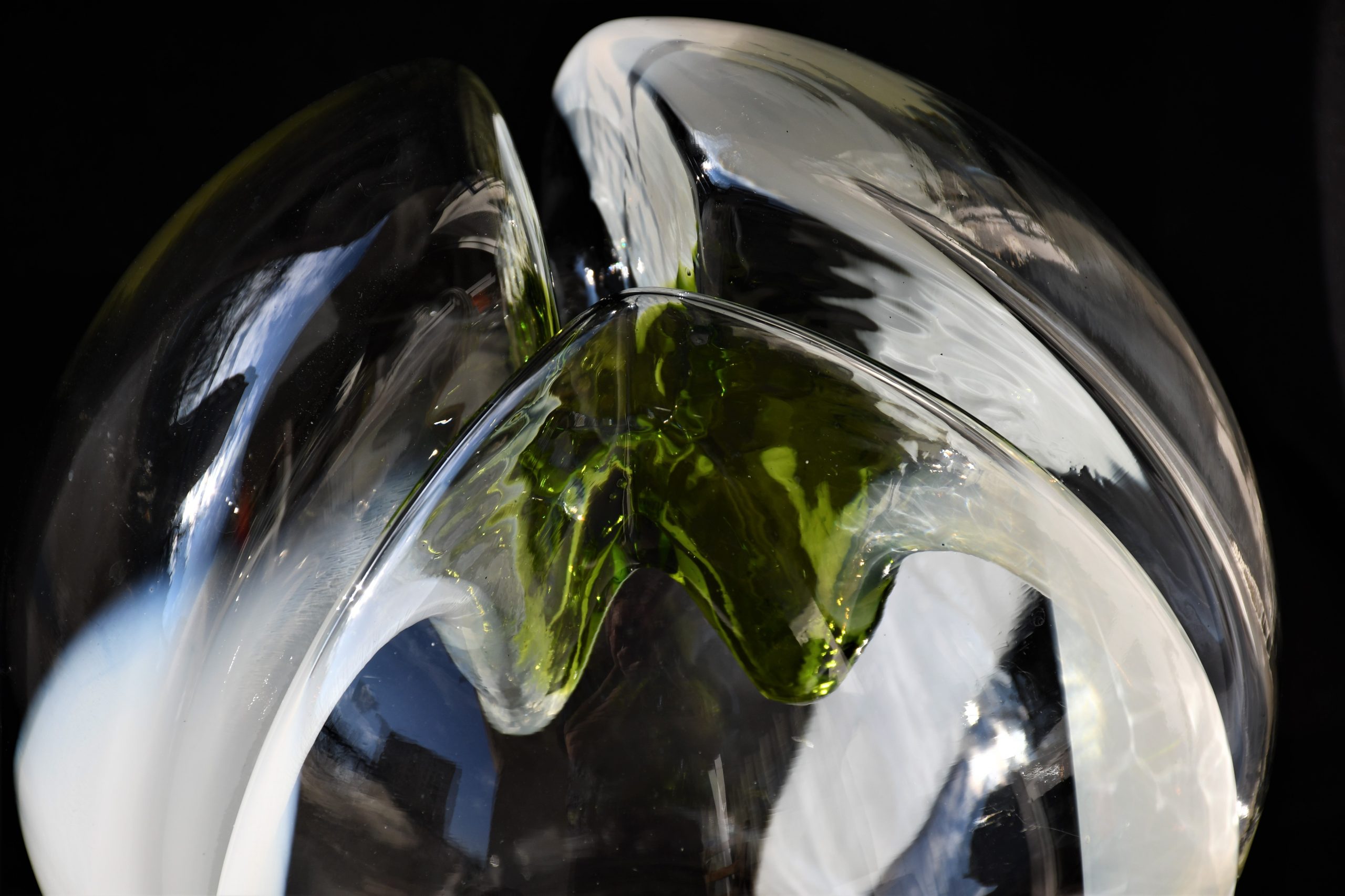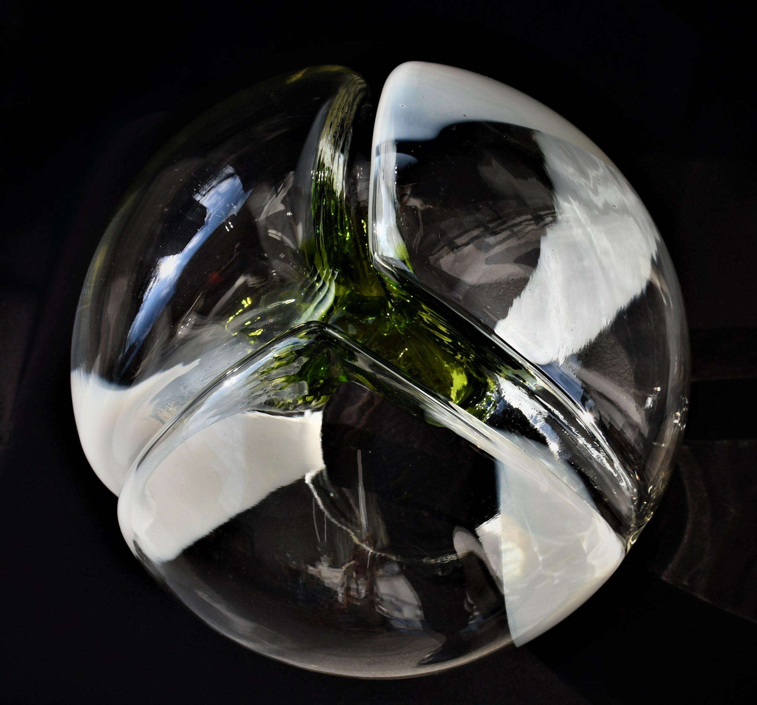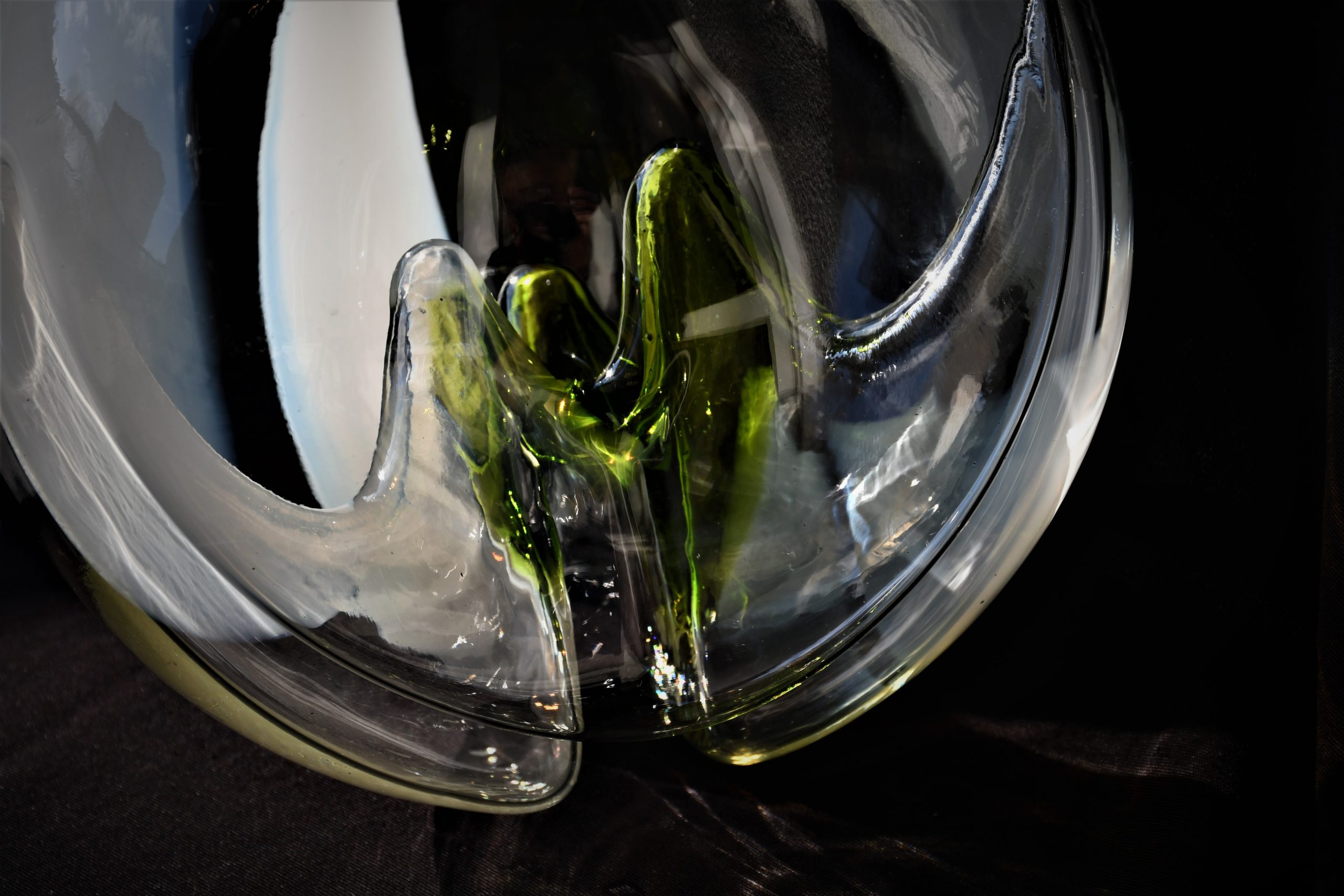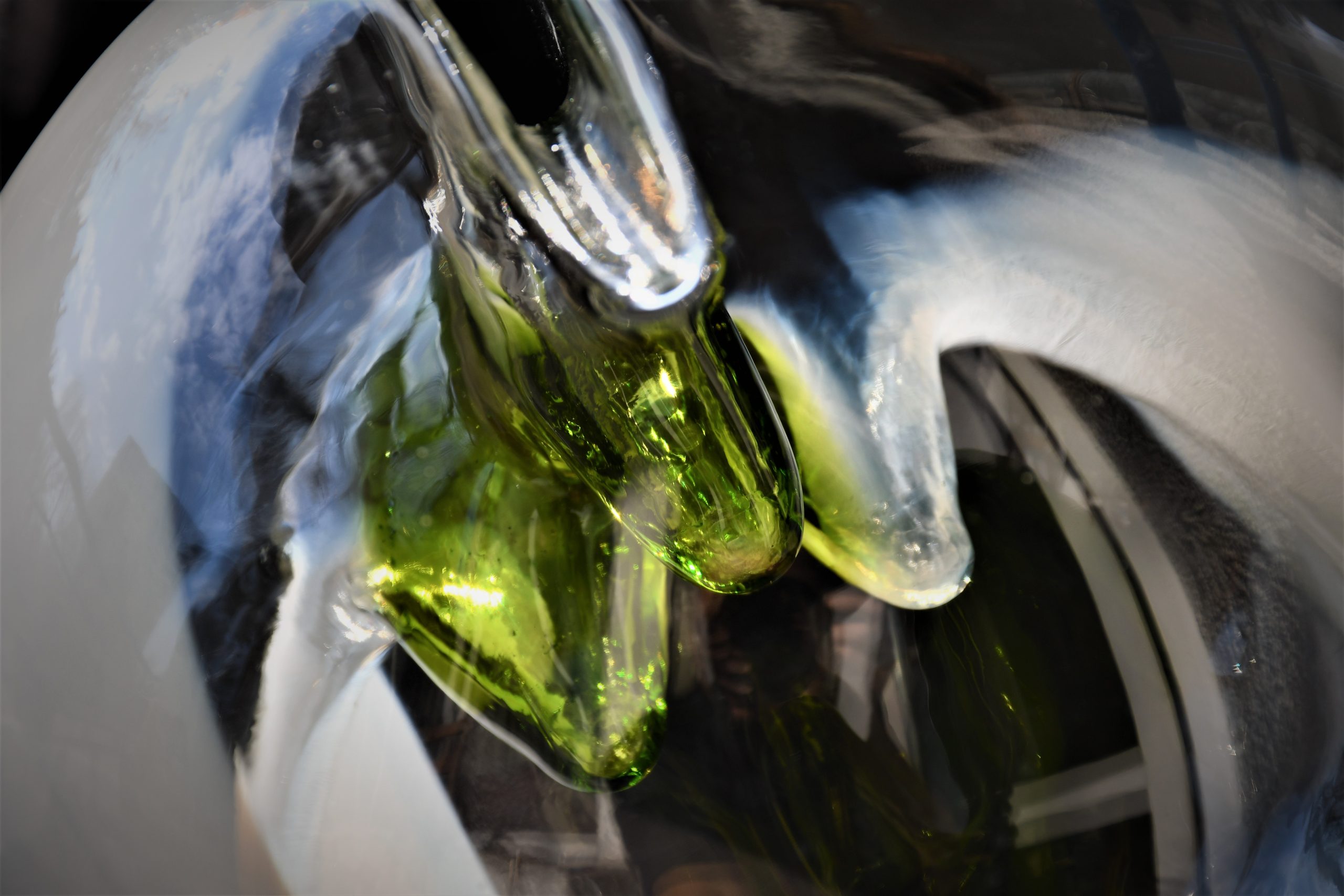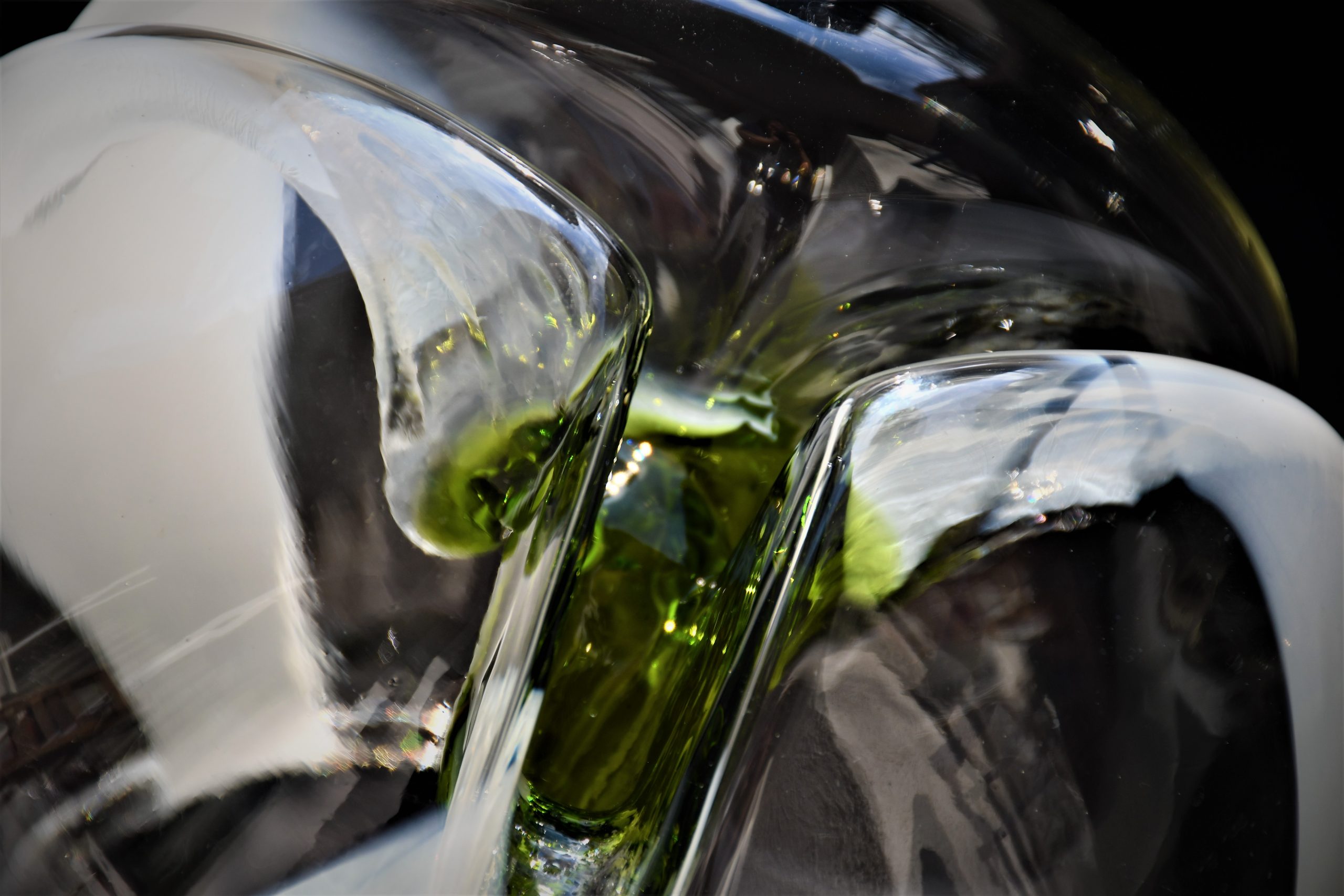 От здраво прозрачно стъкло с артистични мазки в млечно бяло и прозрачно смарагдово зелено. Добре представени чрез множество снимки.