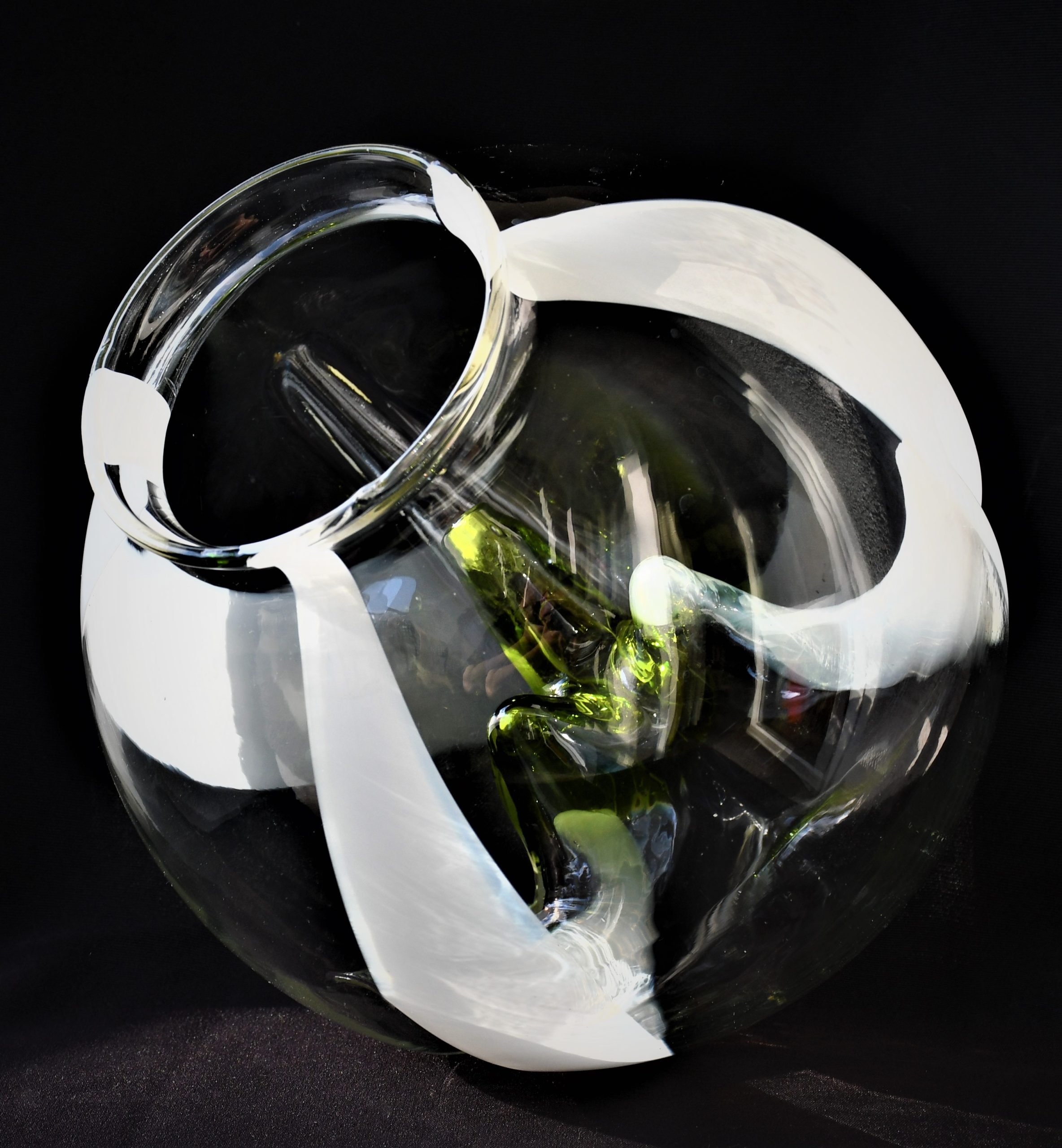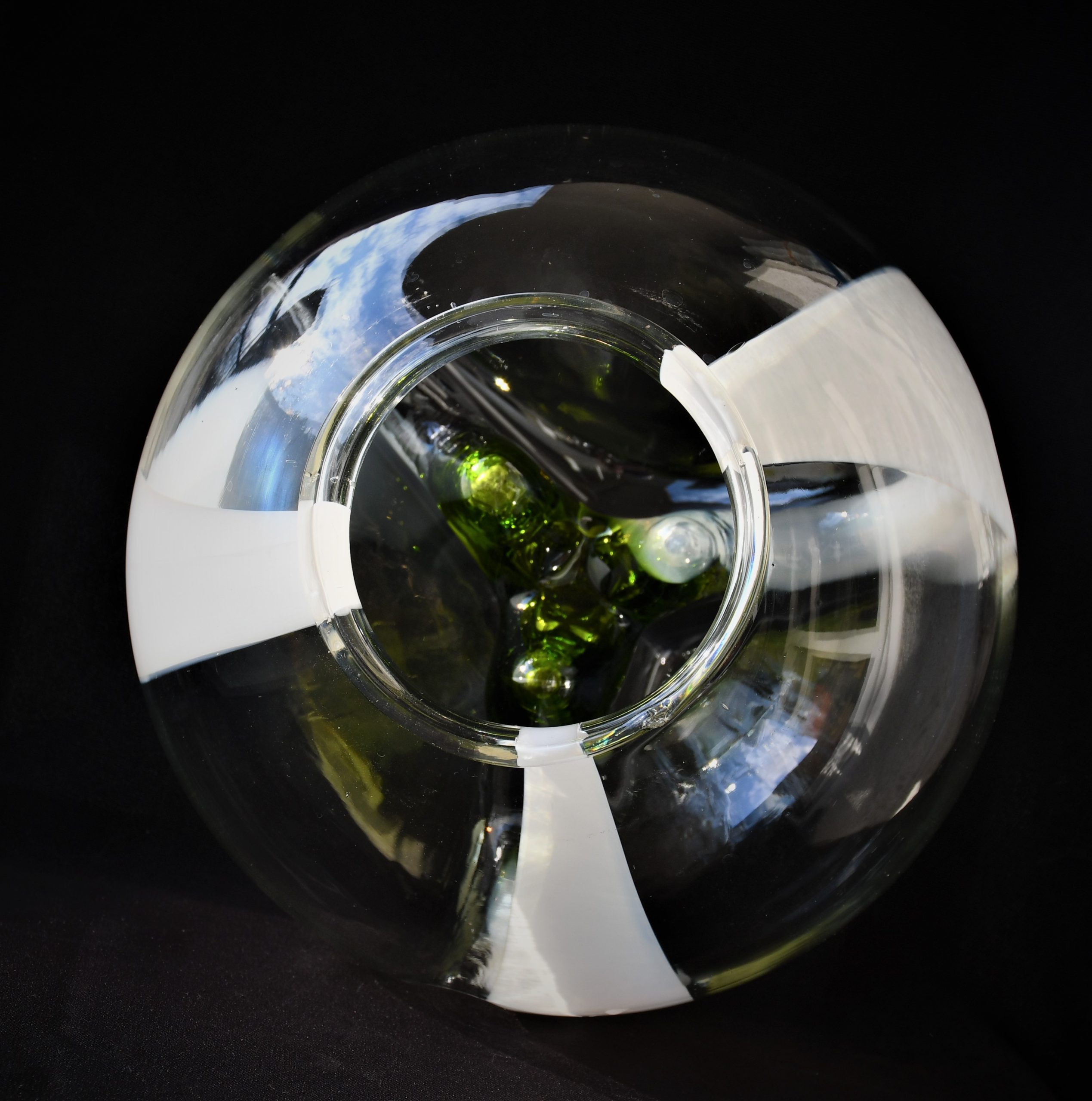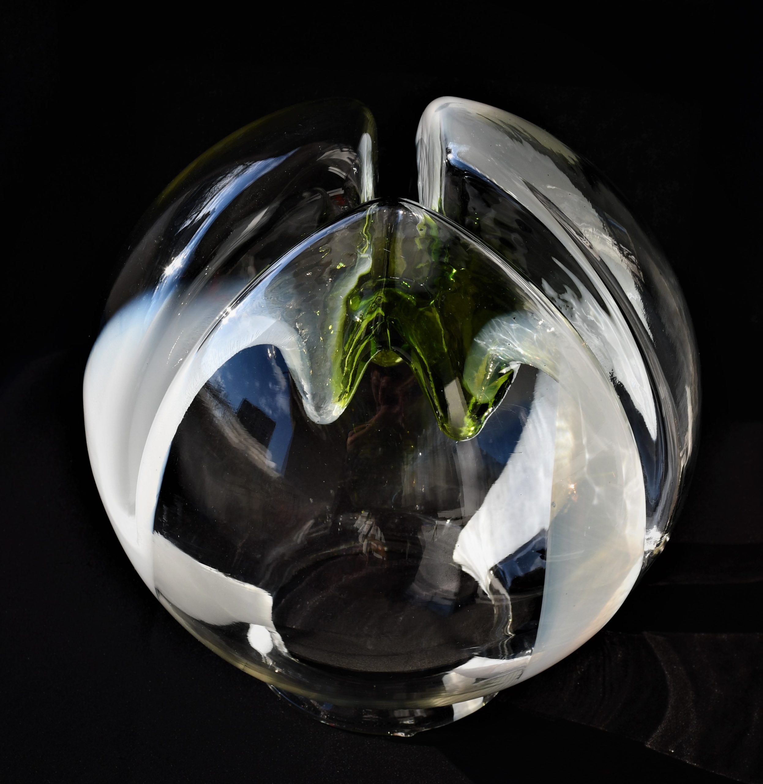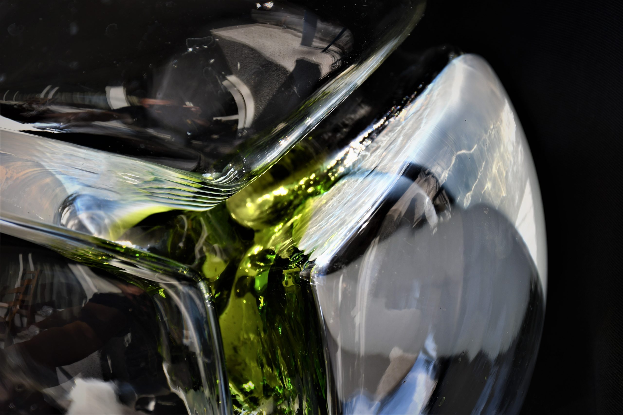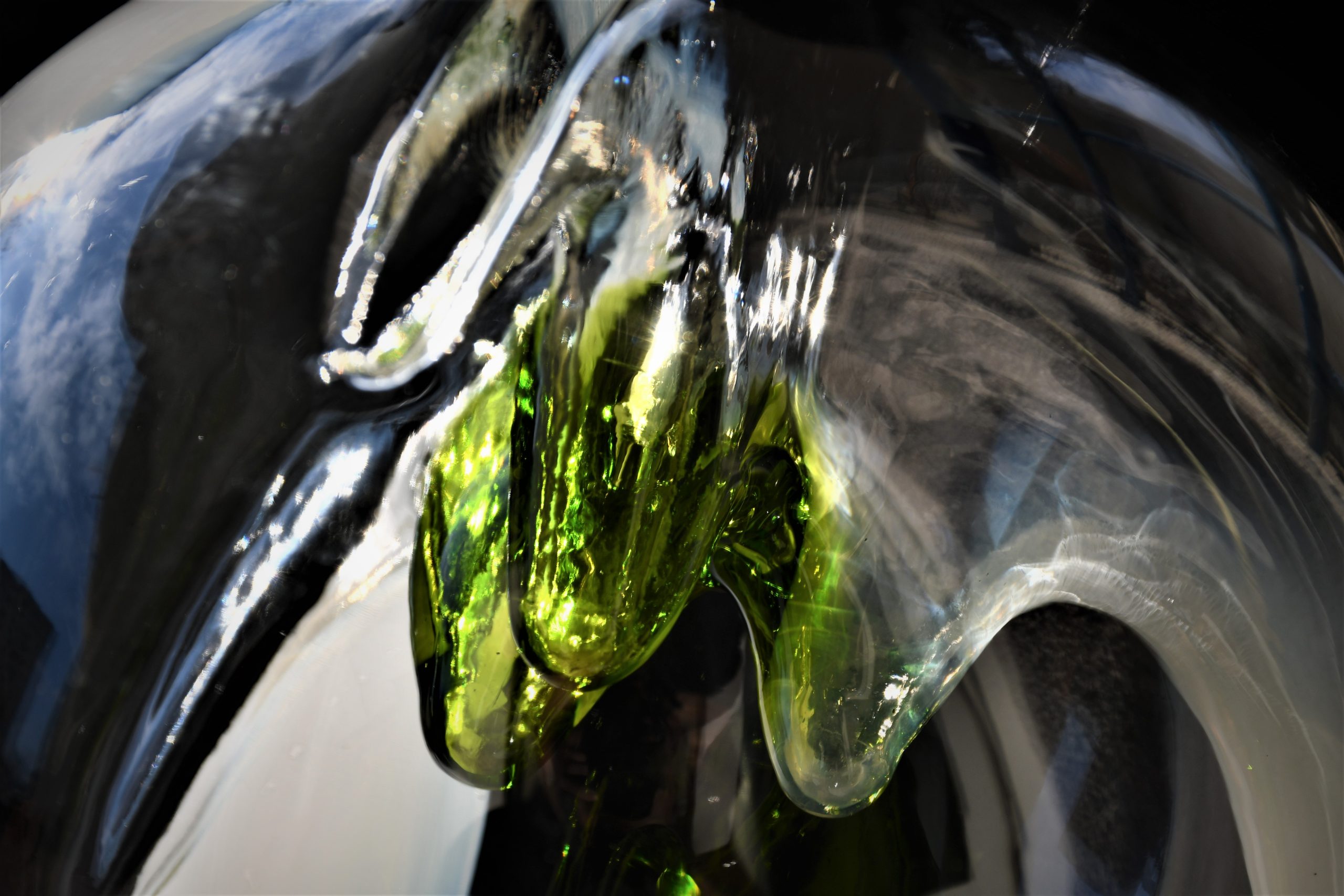 От здраво прозрачно стъкло с артистични мазки в млечно бяло и прозрачно смарагдово зелено. Добре представени чрез множество снимки.