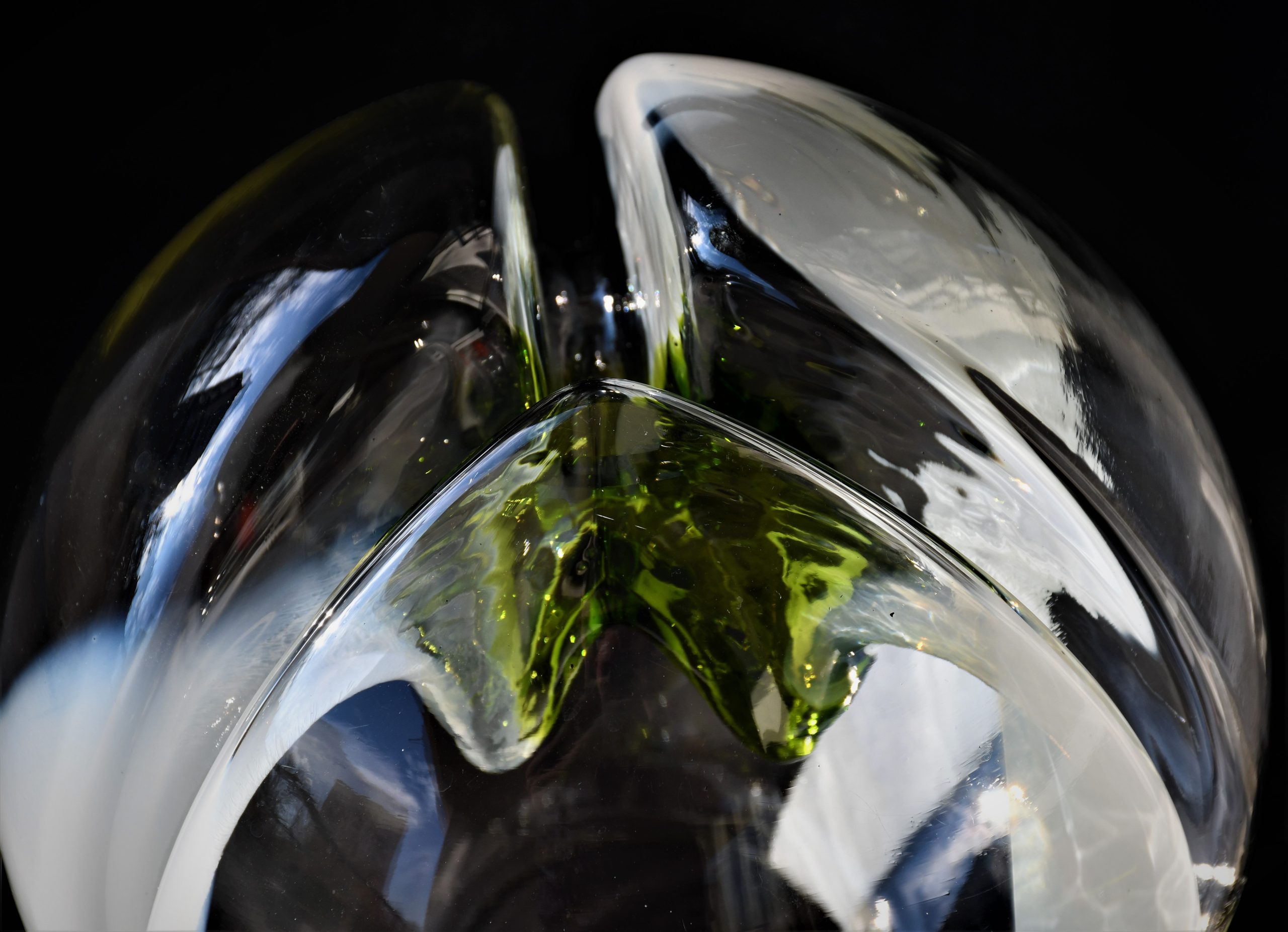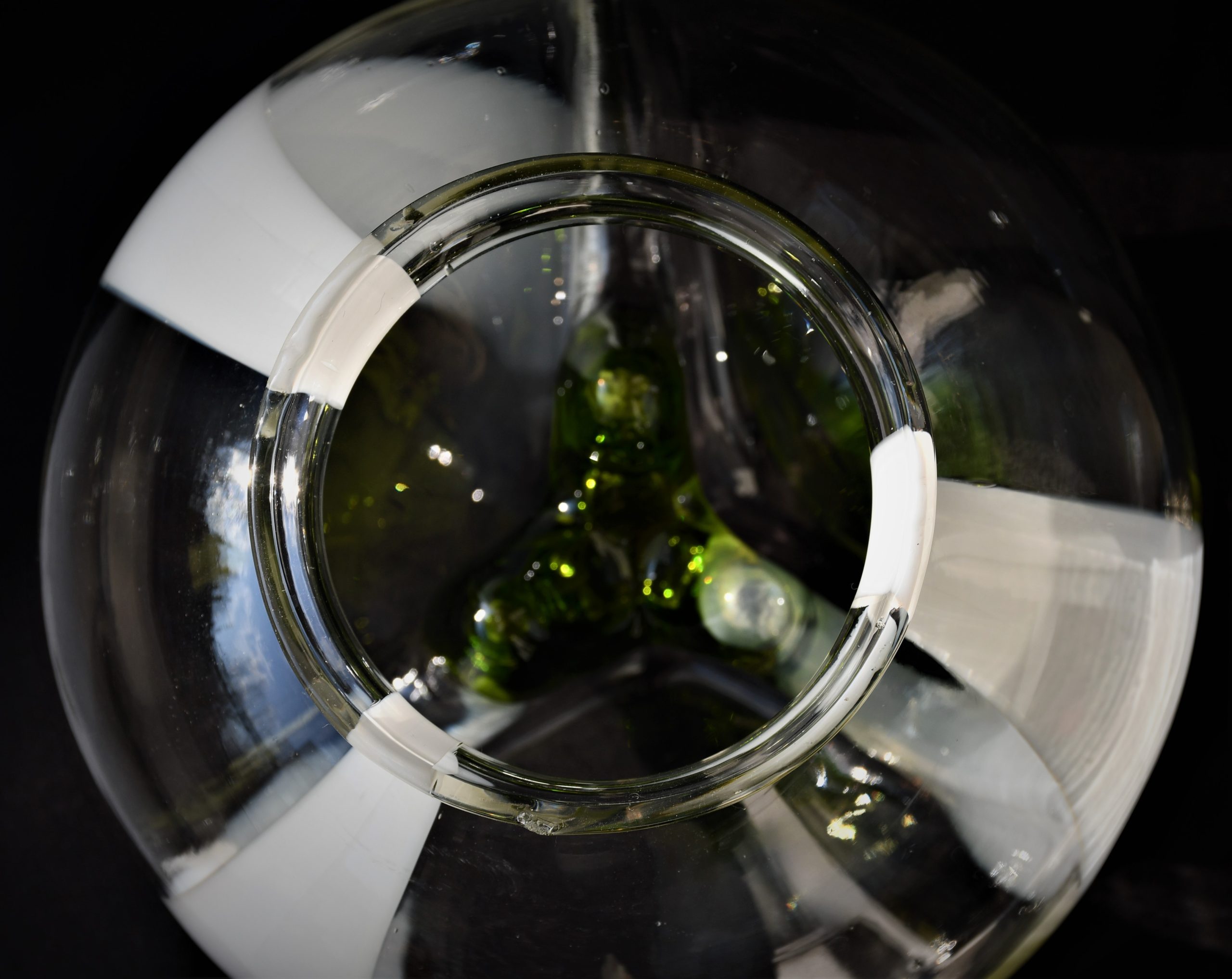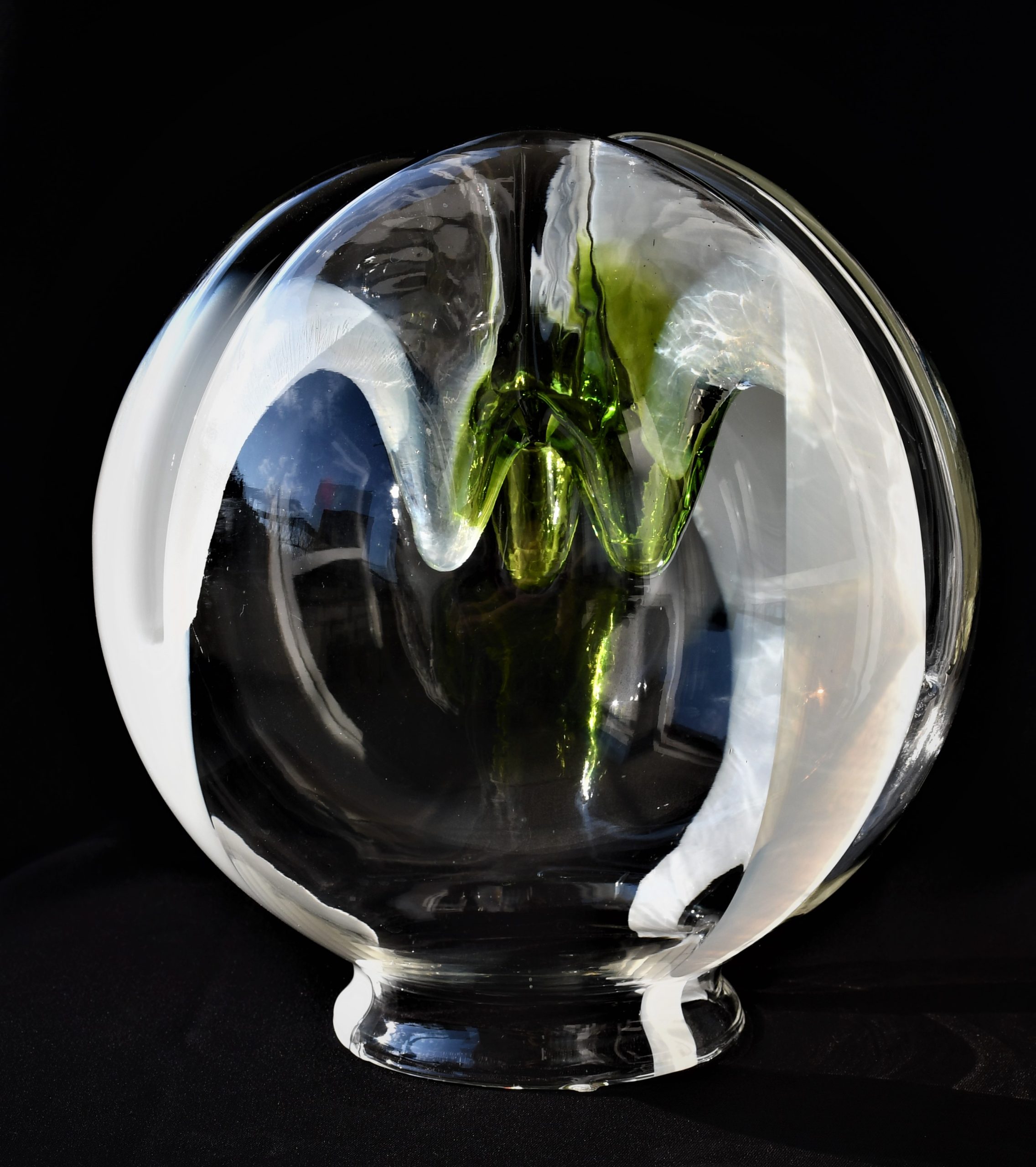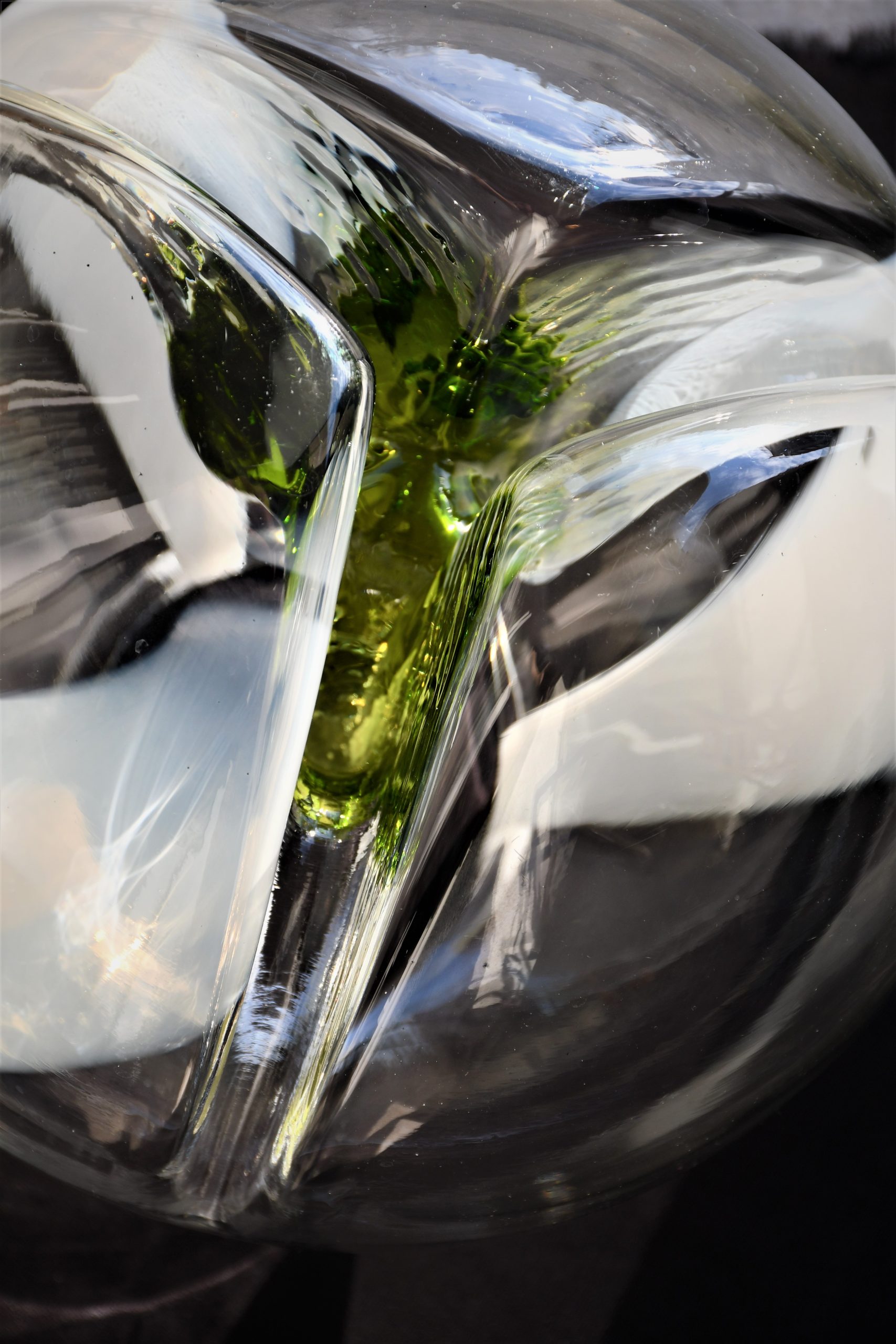 От здраво прозрачно стъкло с артистични мазки в млечно бяло и прозрачно смарагдово зелено. Добре представени чрез множество снимки.