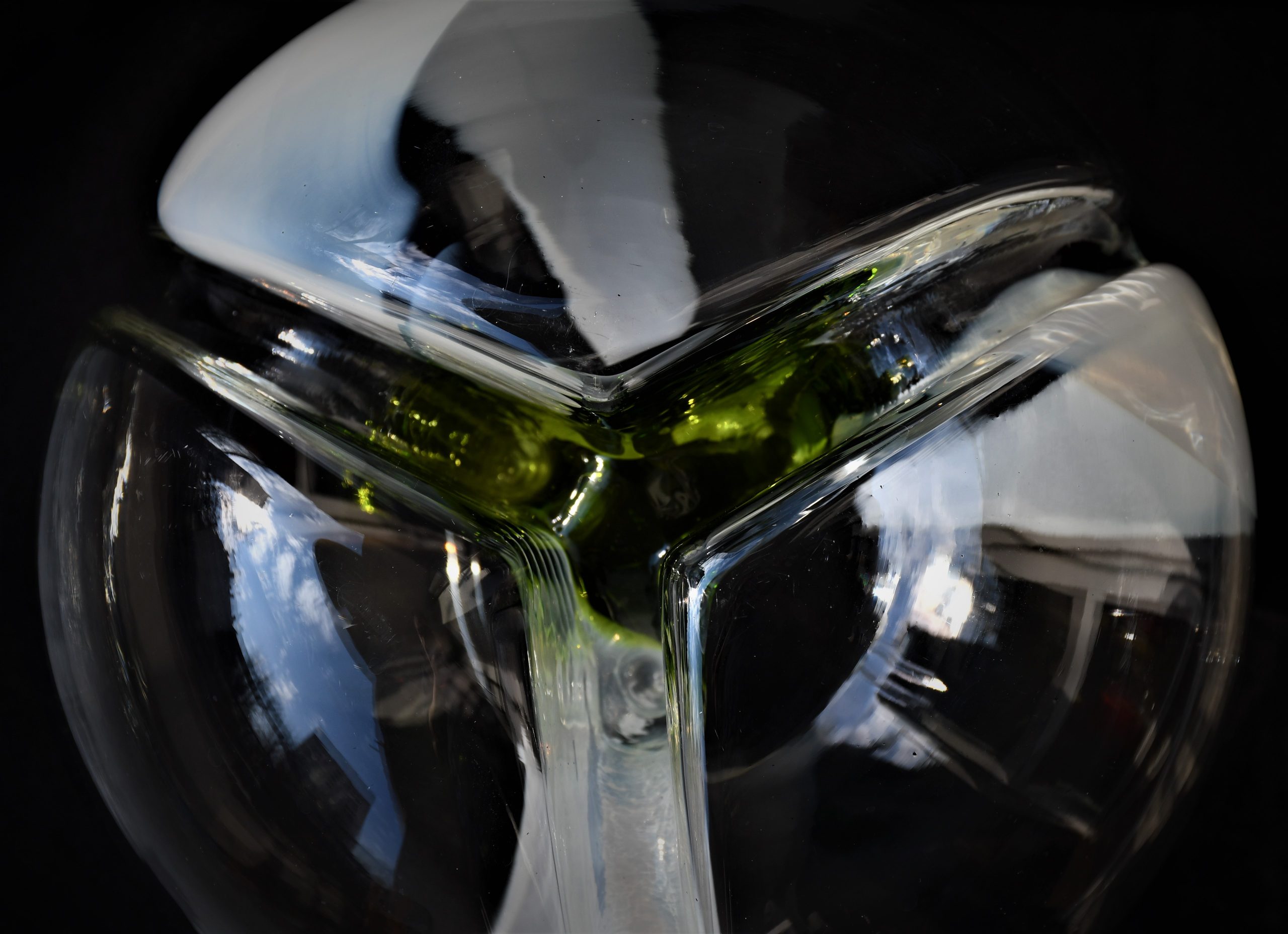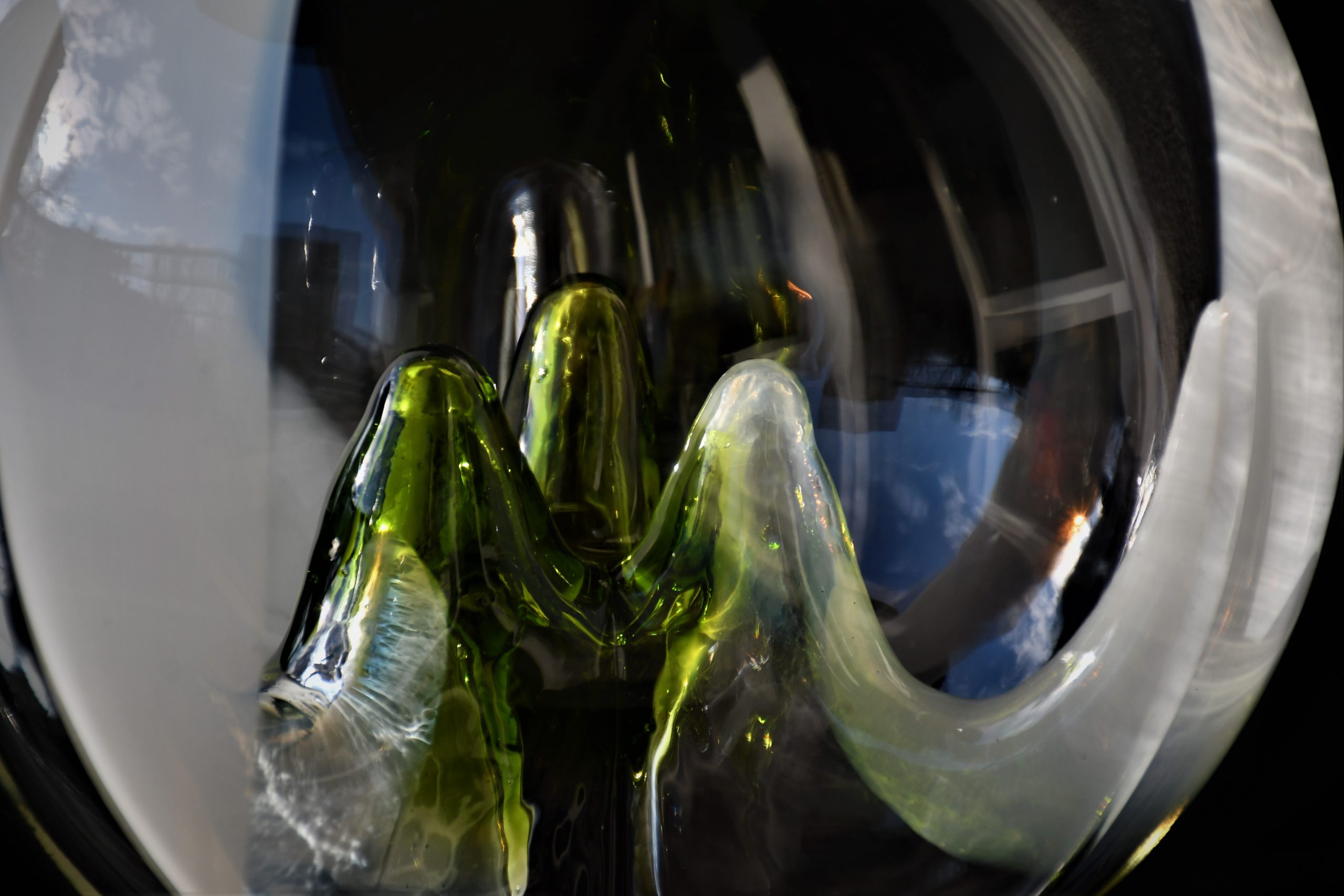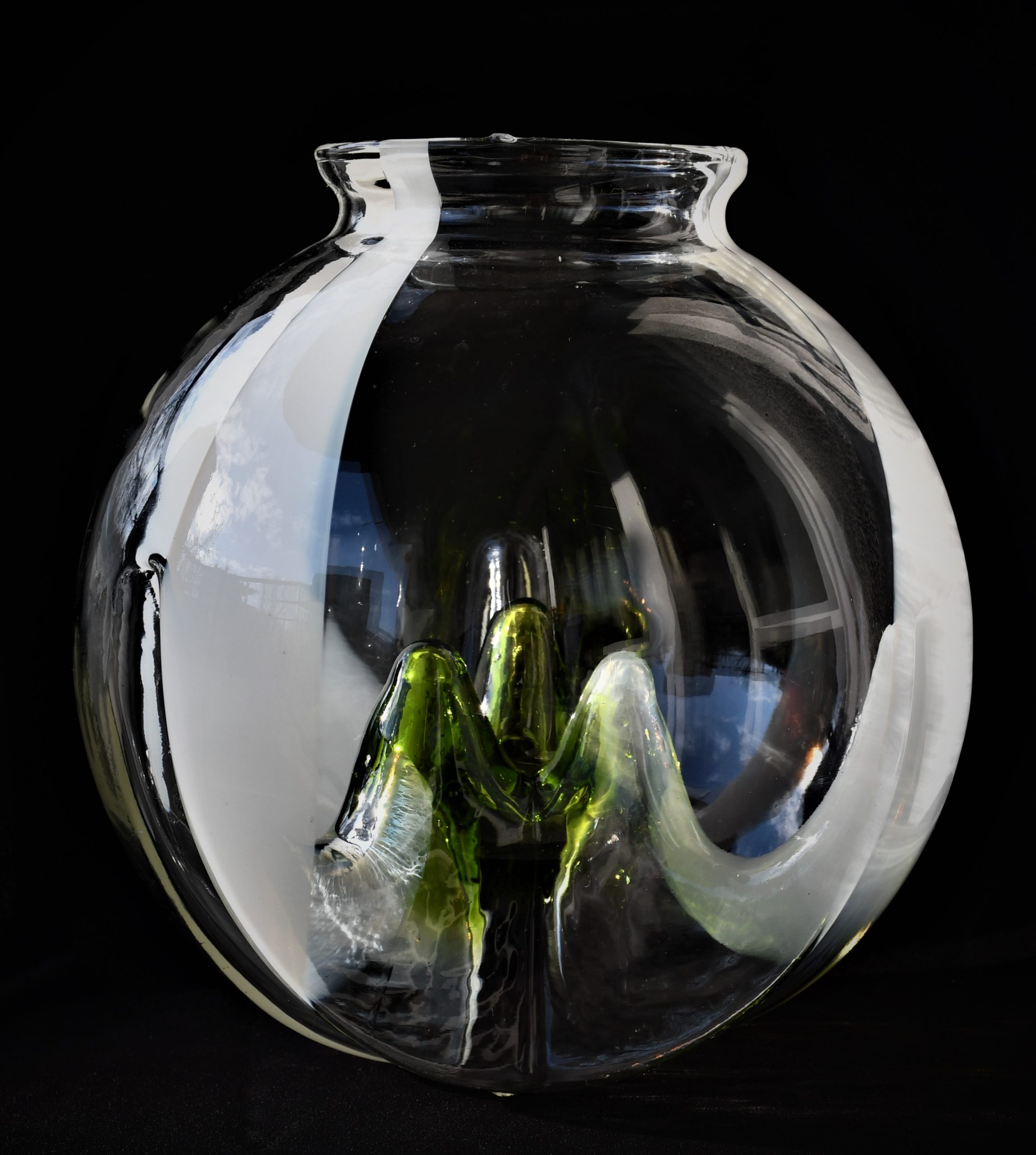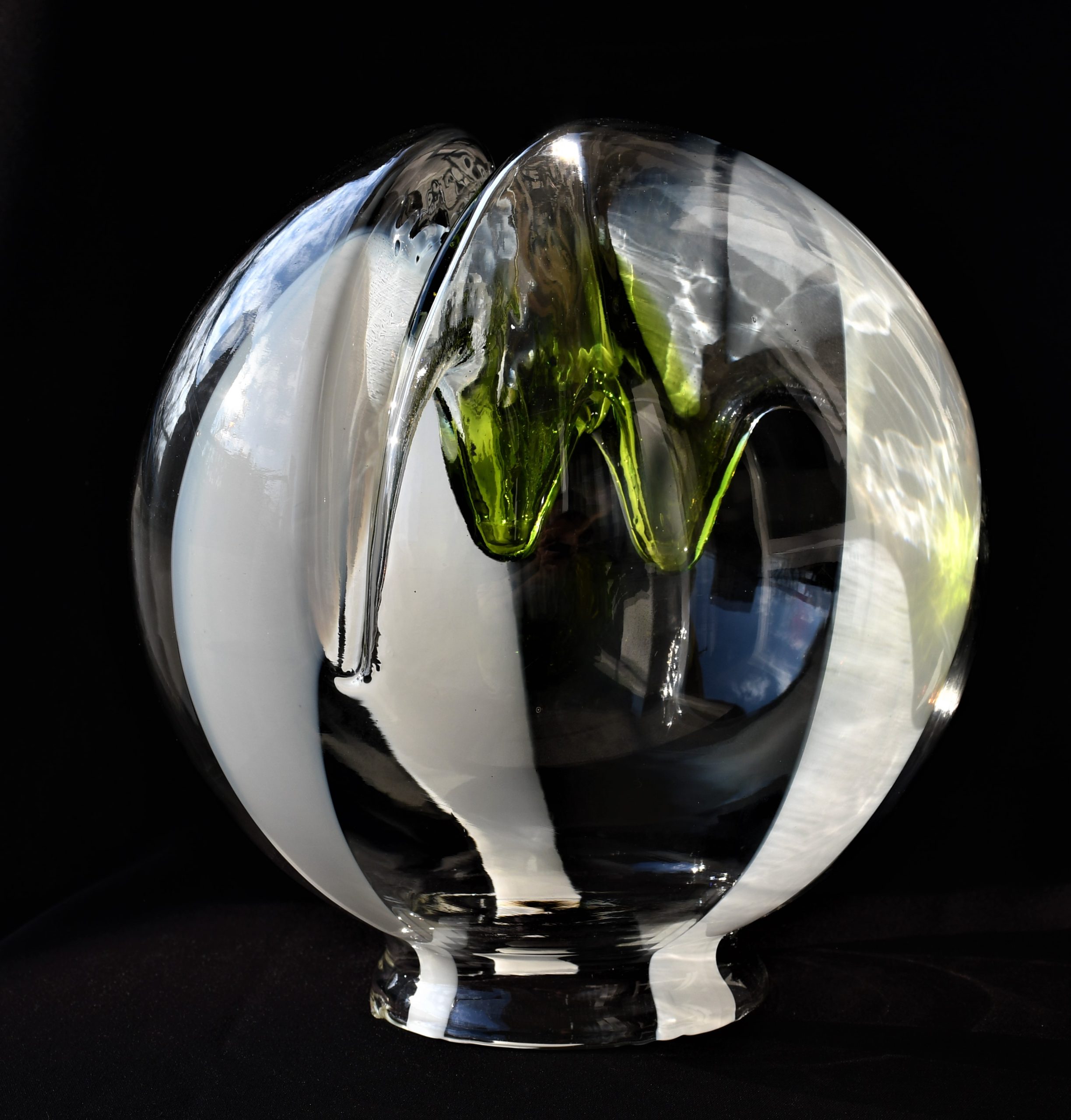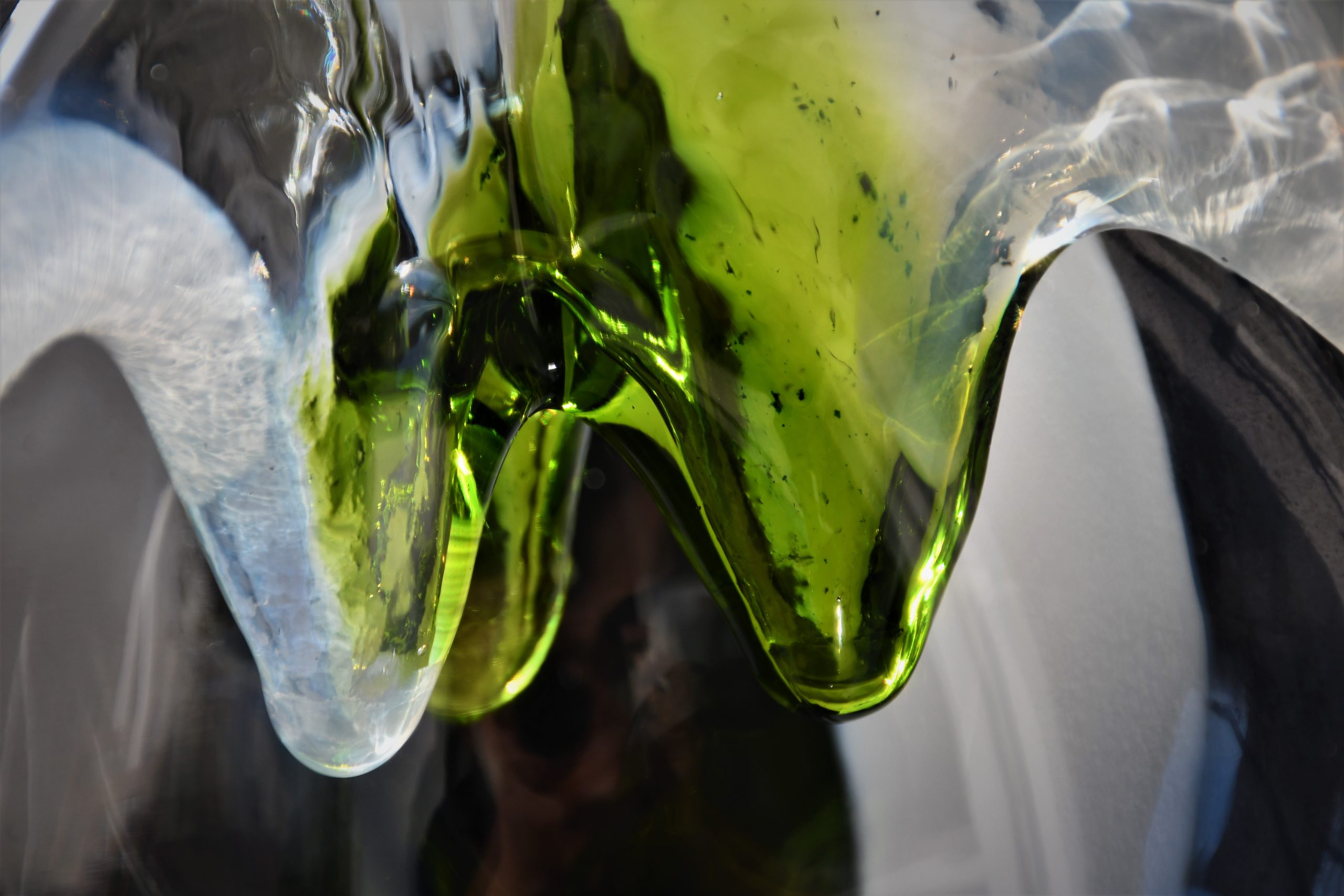От здраво прозрачно стъкло с артистични мазки в млечно бяло и прозрачно смарагдово зелено. Добре представени чрез множество снимки.