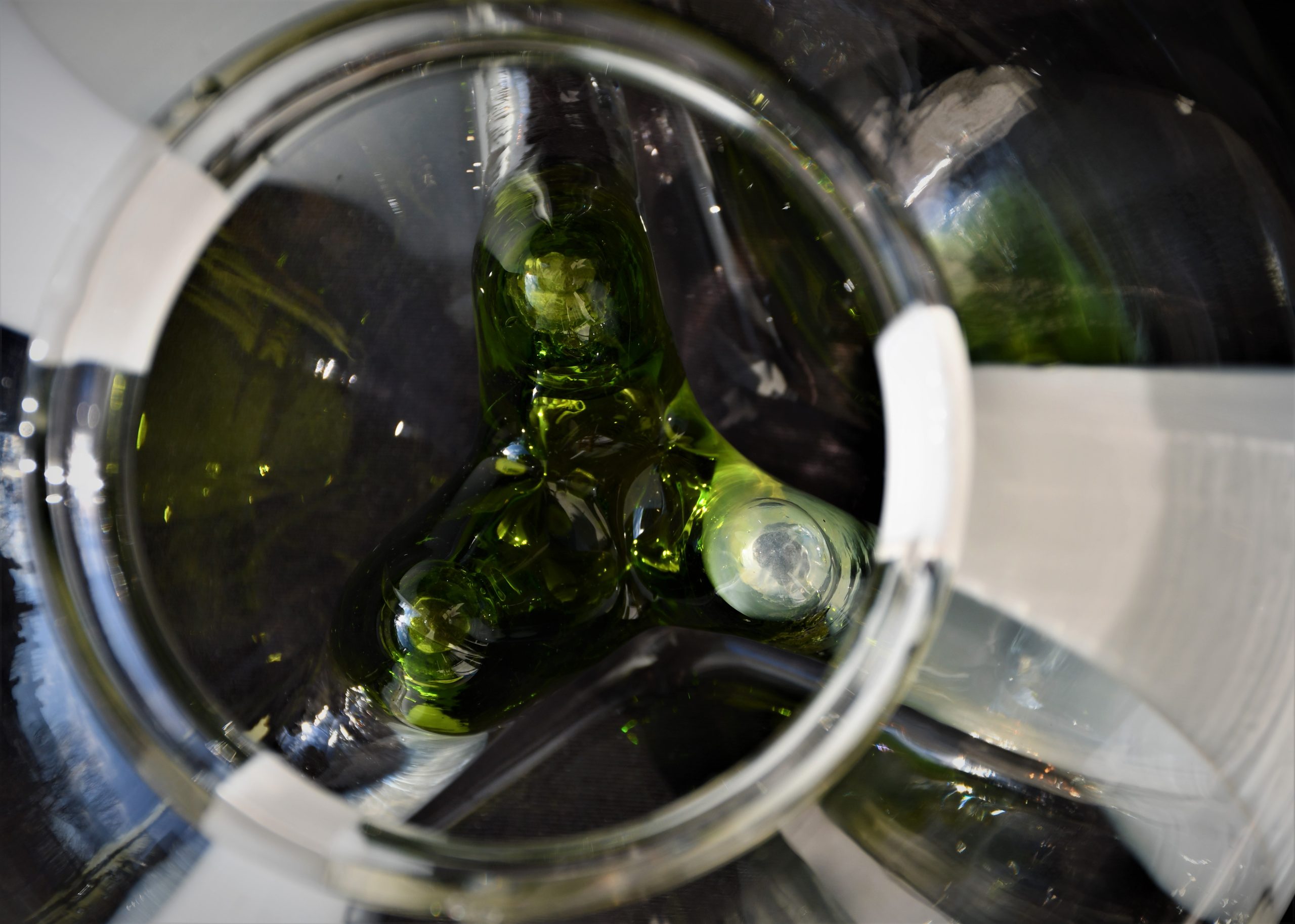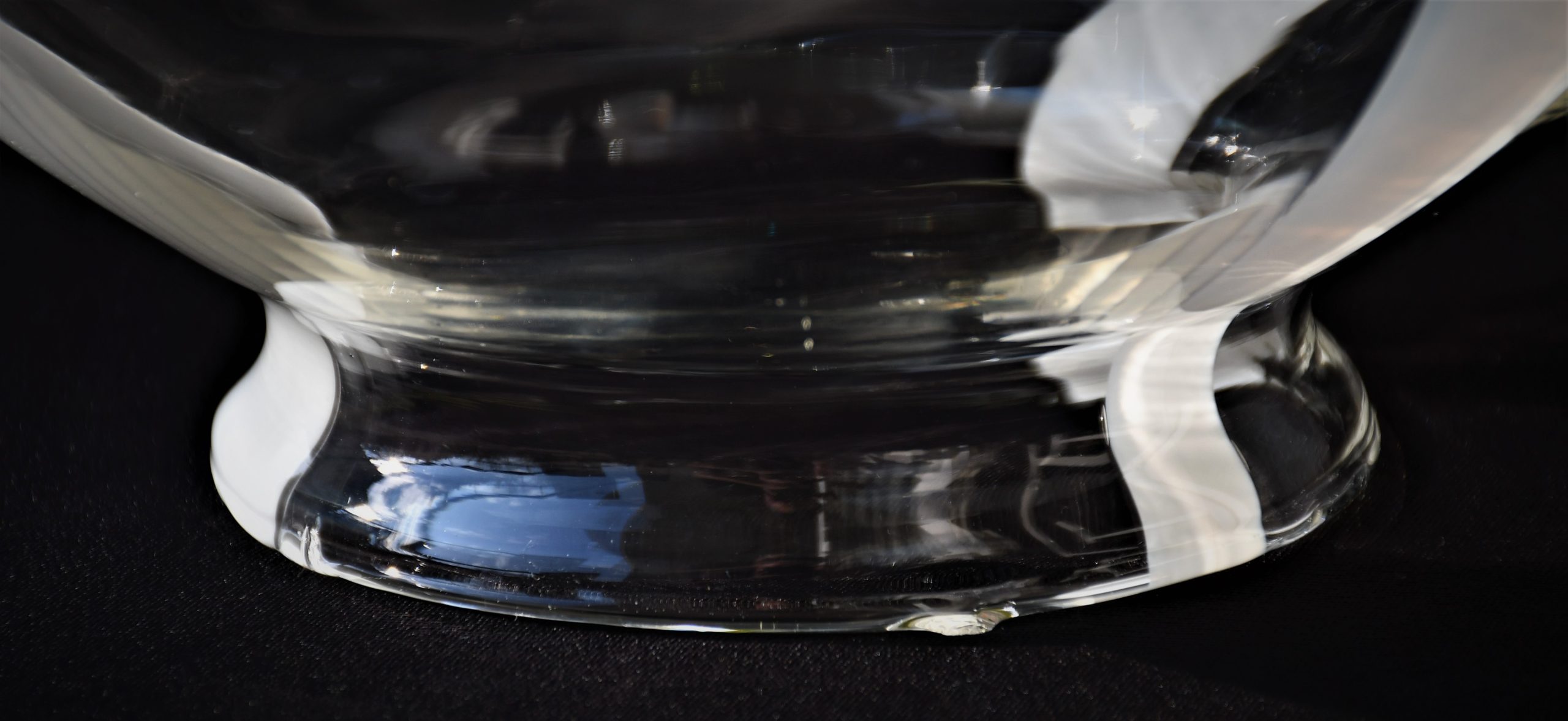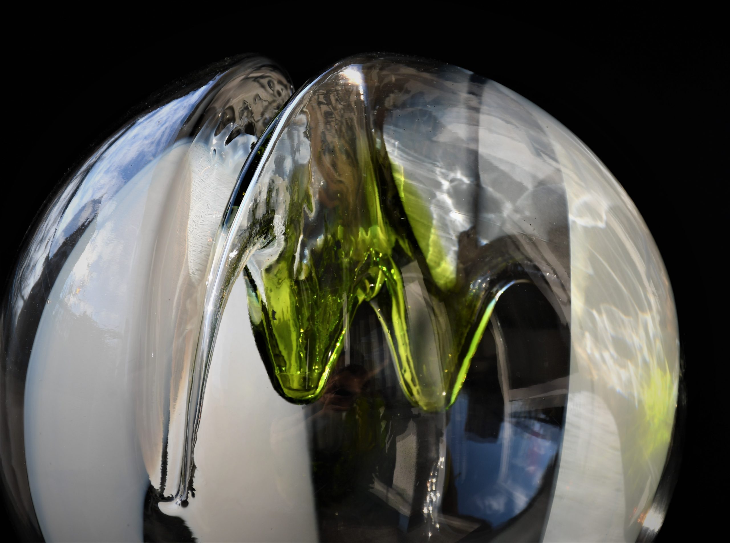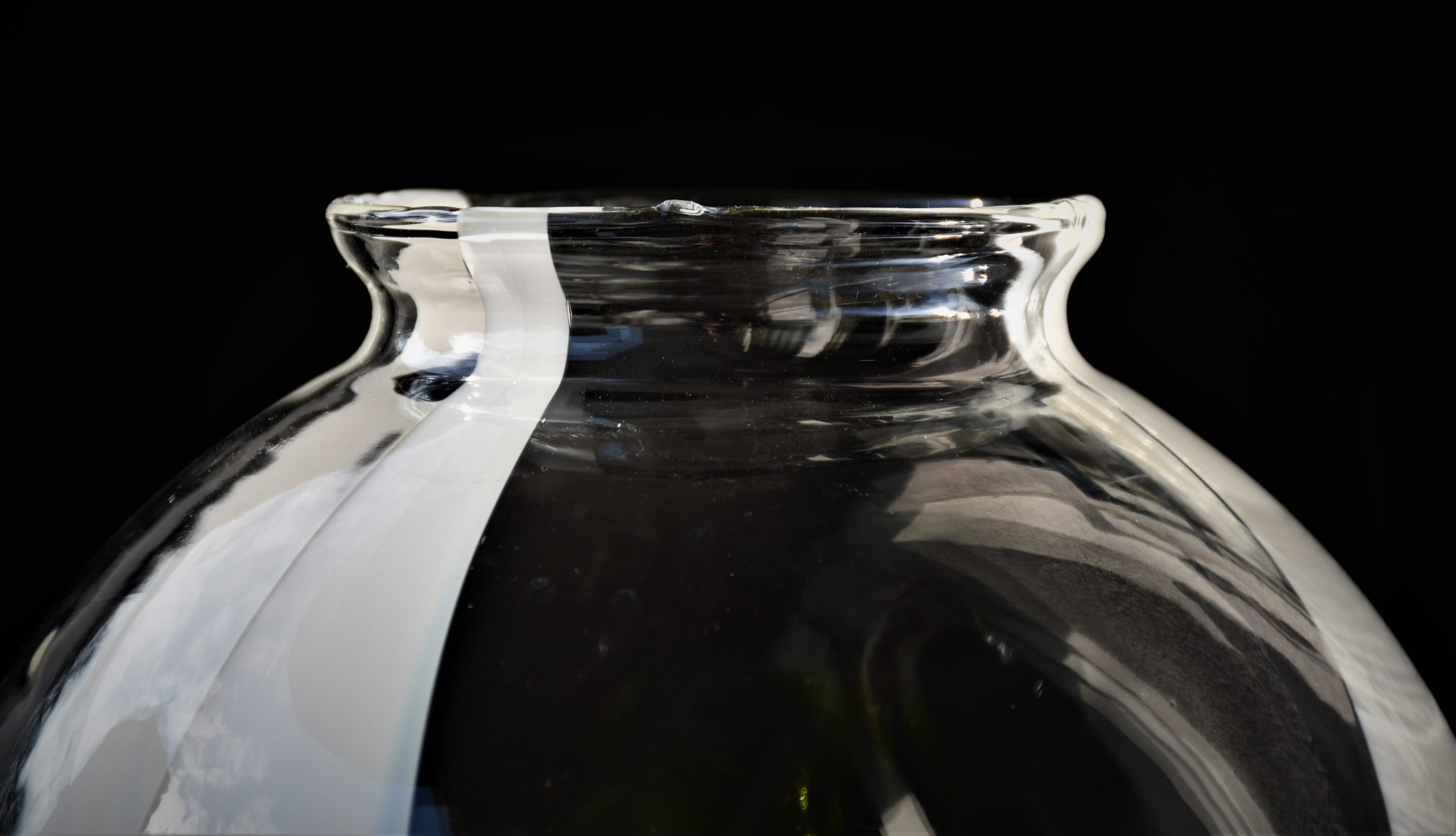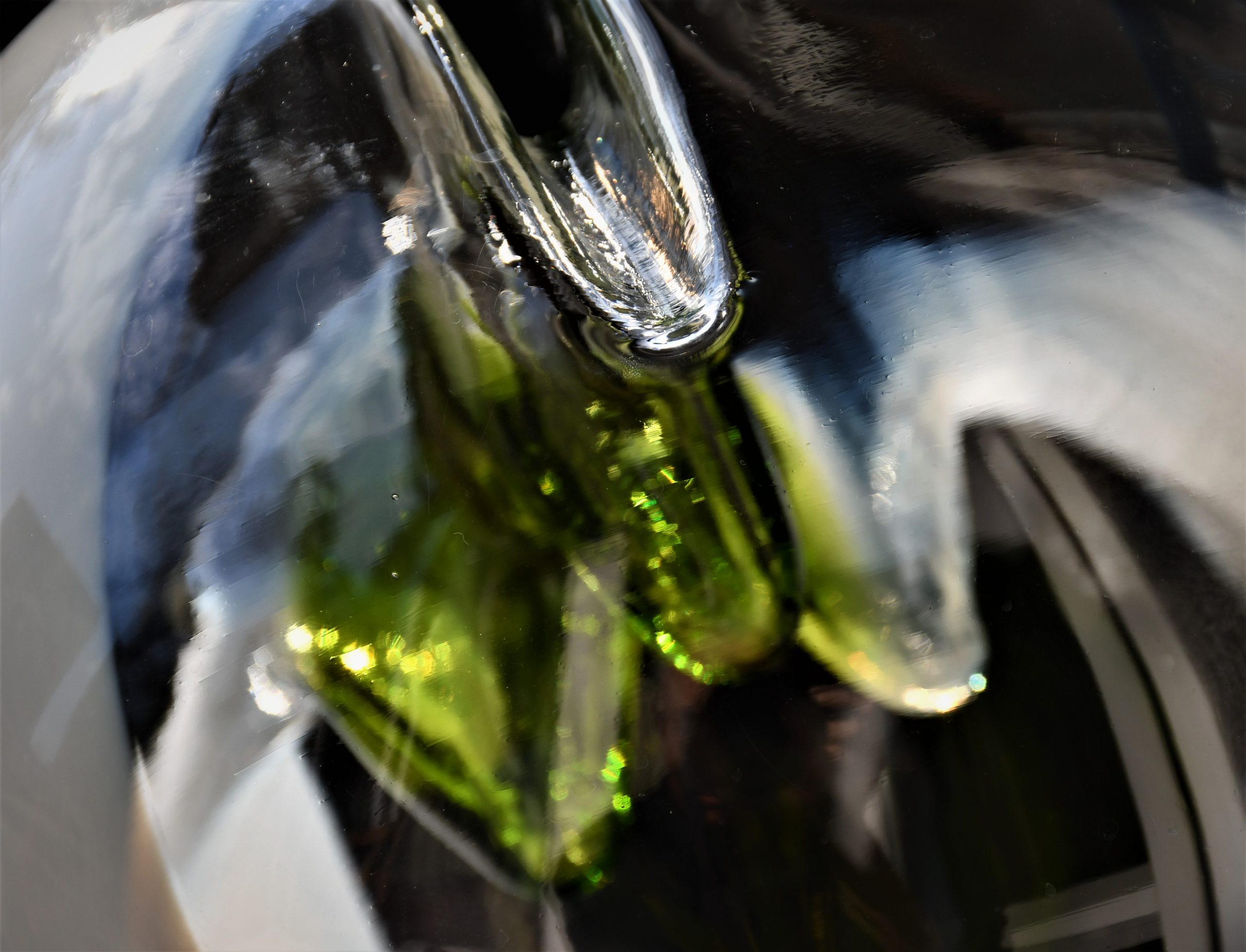 От здраво прозрачно стъкло с артистични мазки в млечно бяло и прозрачно смарагдово зелено. Добре представени чрез множество снимки.