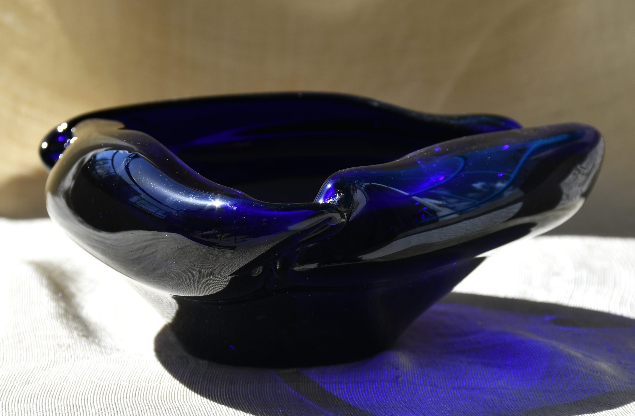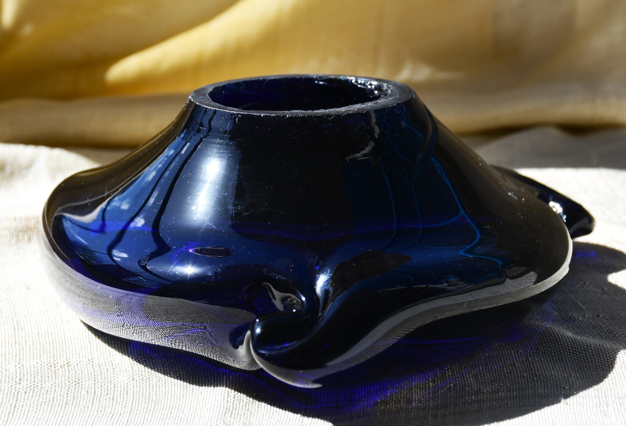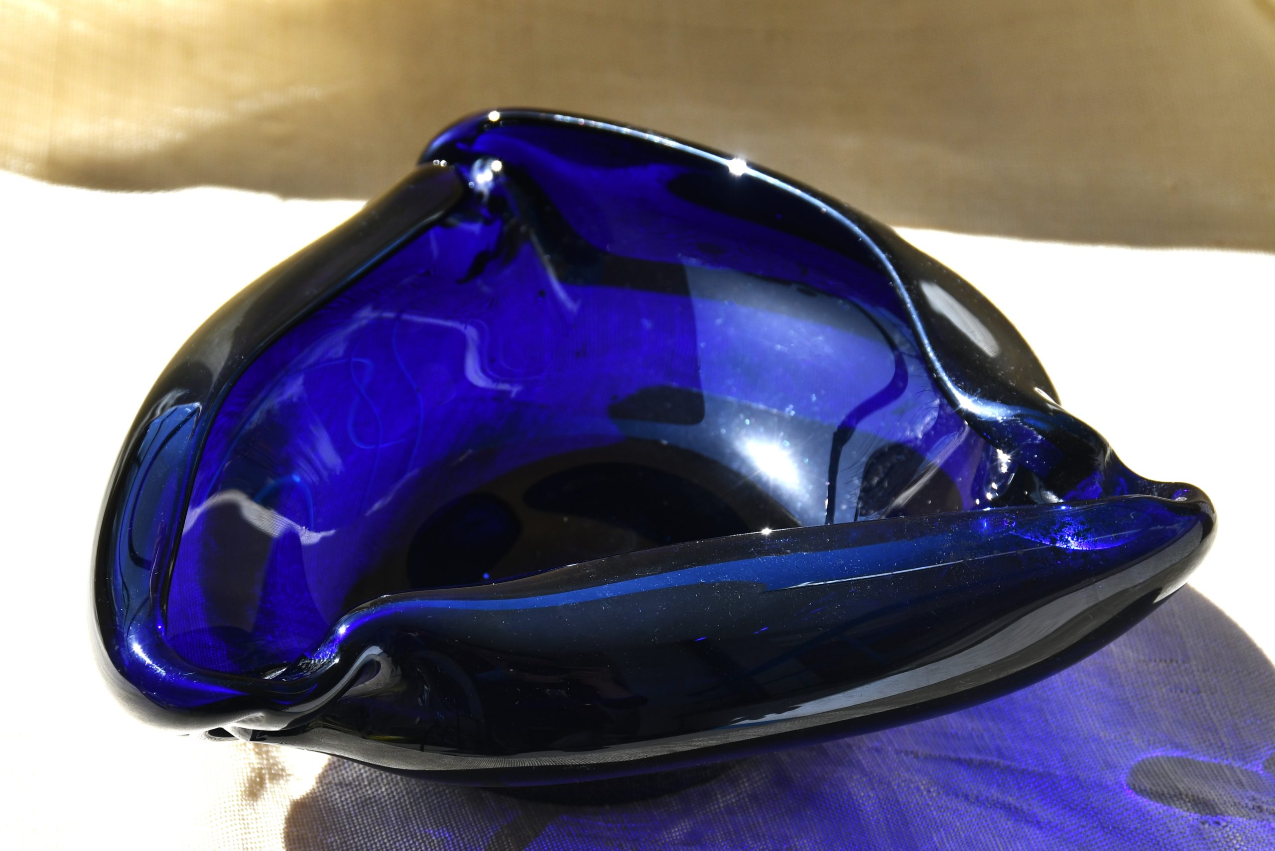 Мека, органична триъгълна форма, изключително декоративна, с открояващо се присъствие. От кобалтово синьо стъкло. С позиции за три цигари.