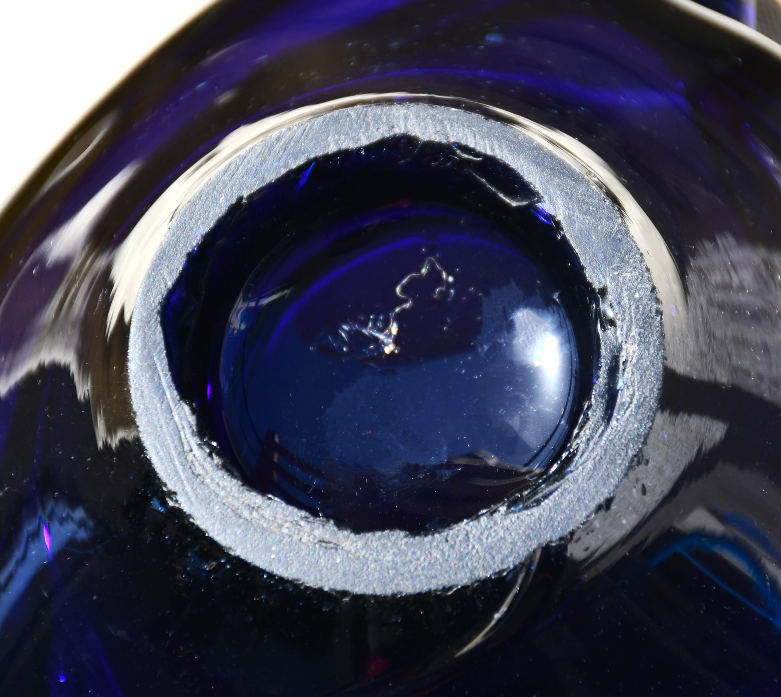 Употребавян предмет, но в отлично винтидж състояние. Ръбът на базата е грубо отрязан и доста зле шлайфан, показано в близък план. Малки несъвършенства вътре в стъклото, доказателство за ръчния метод на изработка.