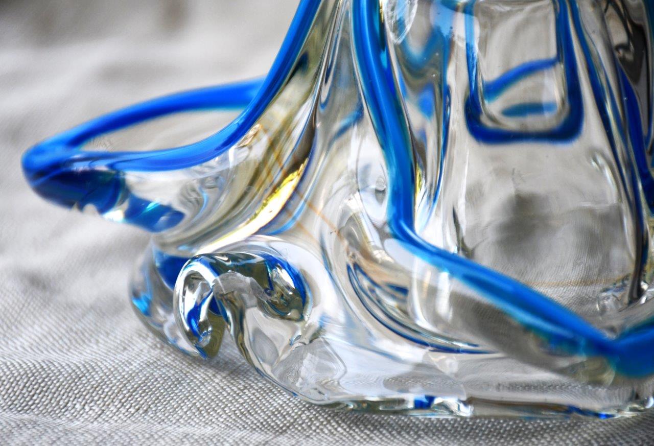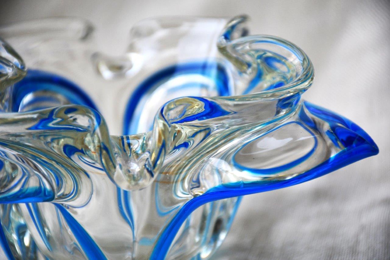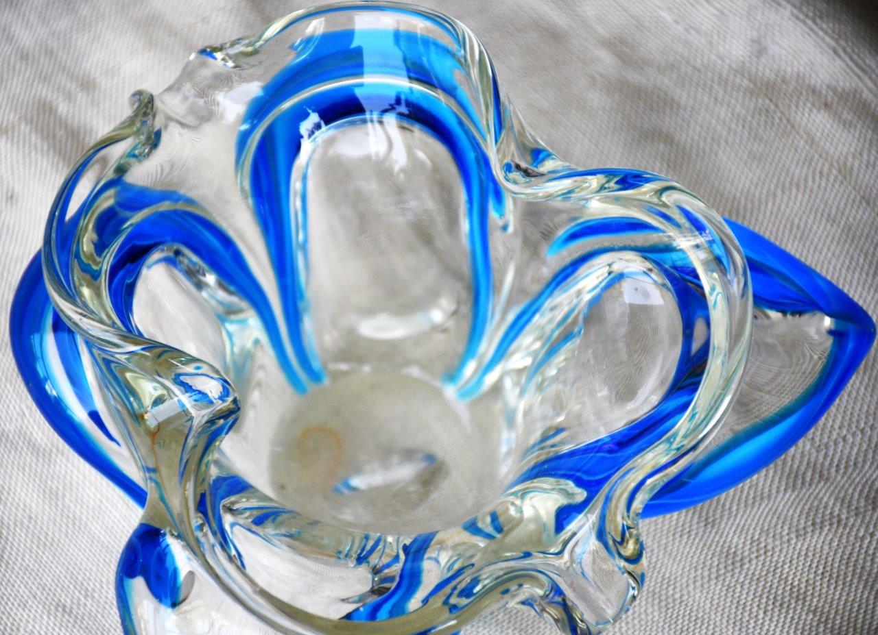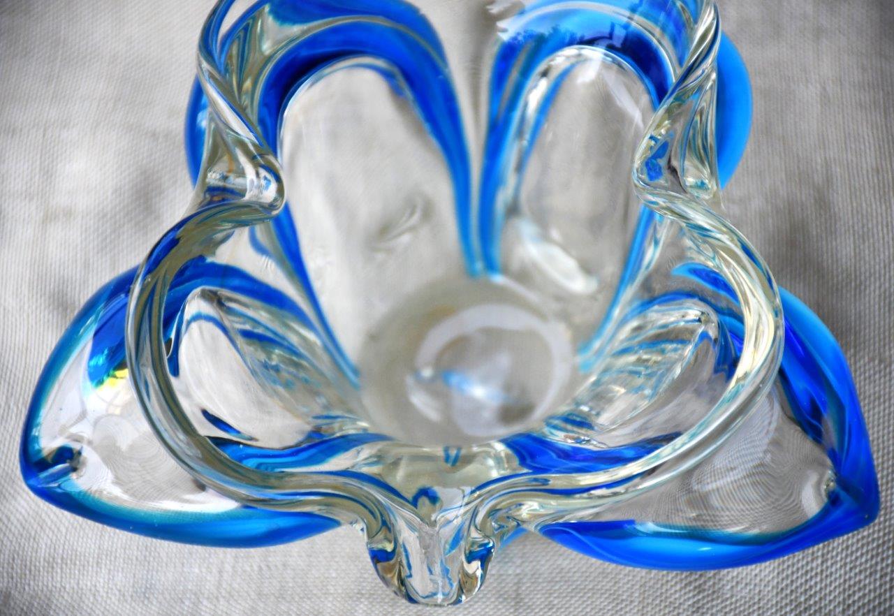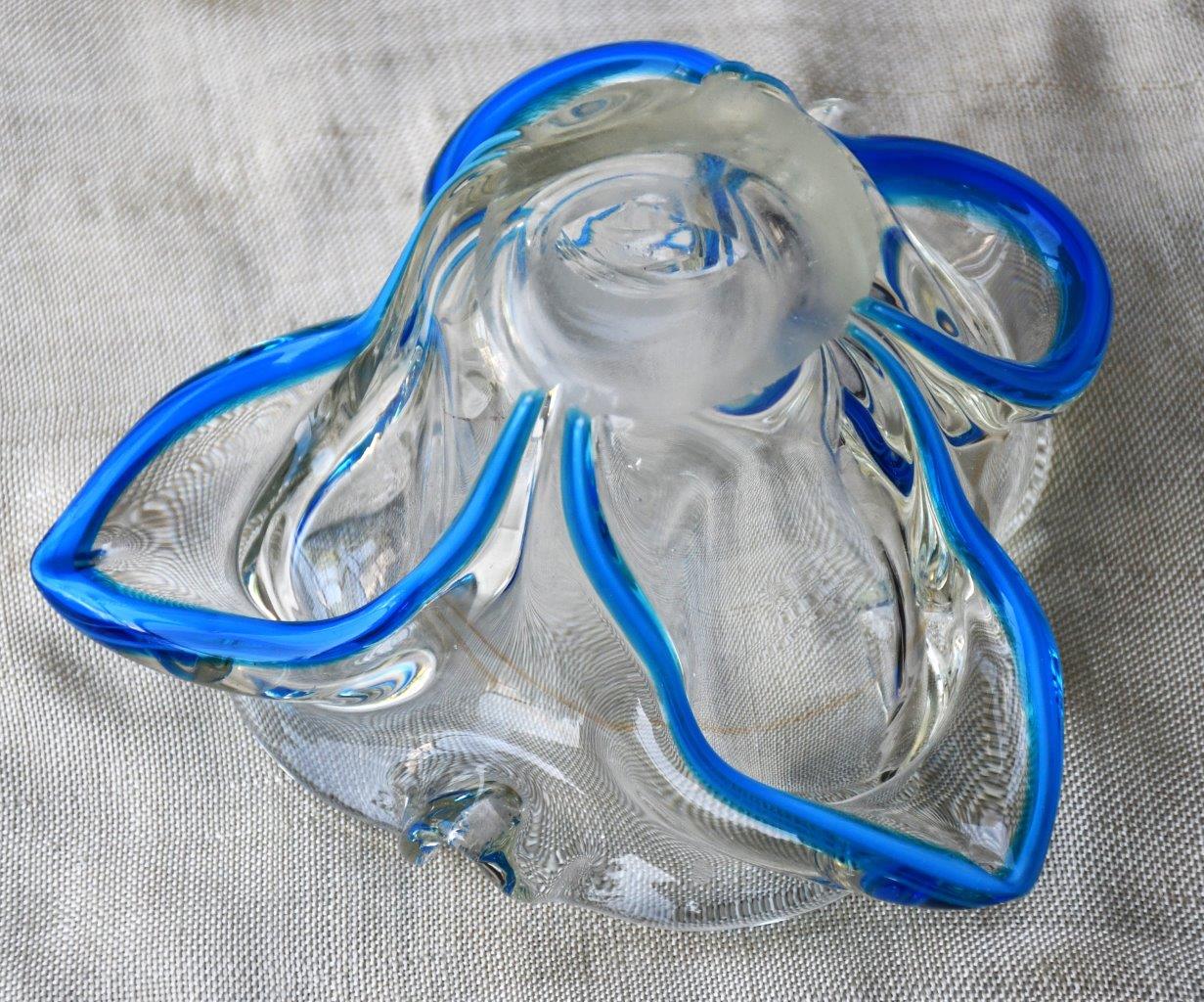Органична форма на цвете, много декоративна и стилна. Прозрачно стъкло, с ръбове от кралско синьо. Перфектен екземпляр на mid century стила.
