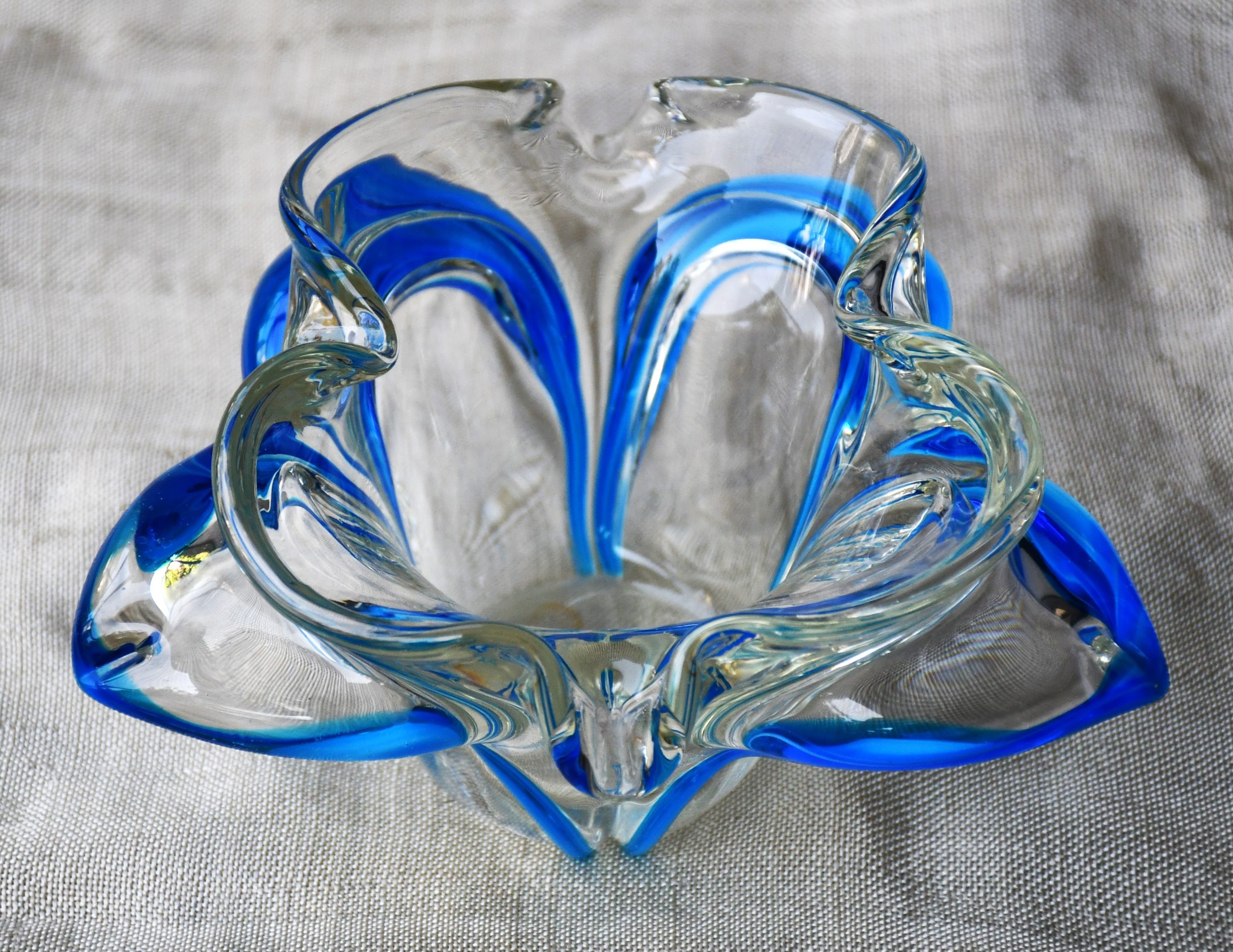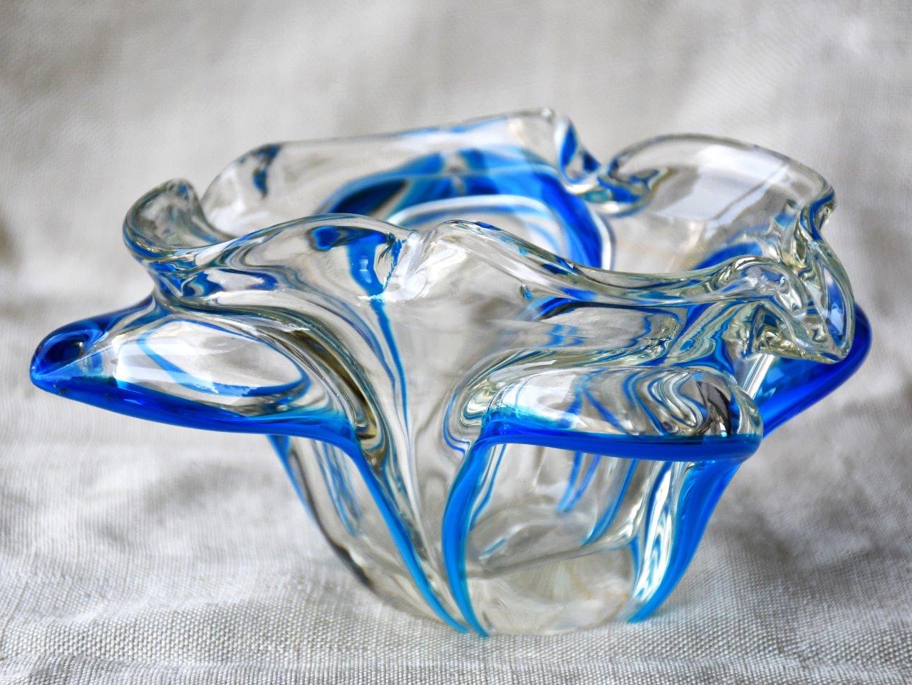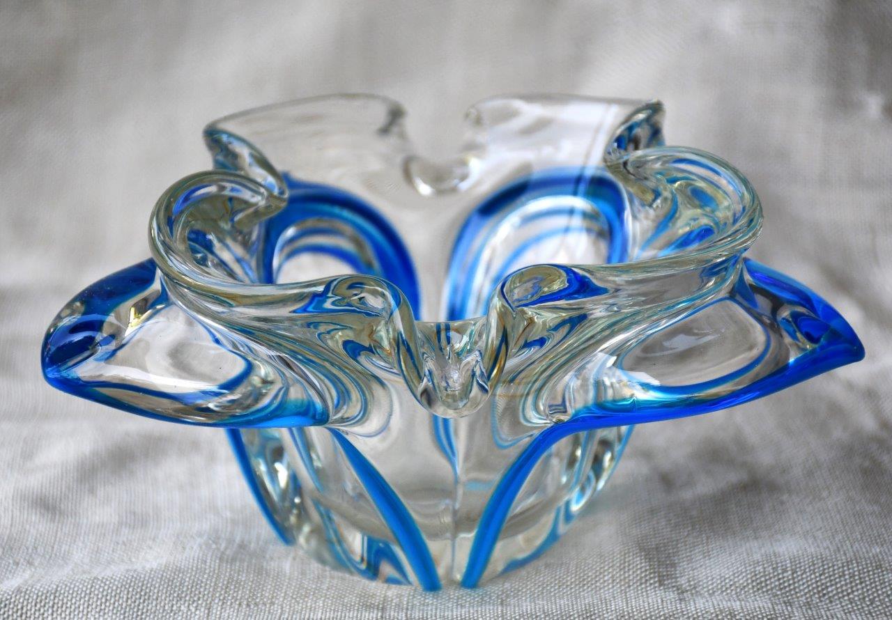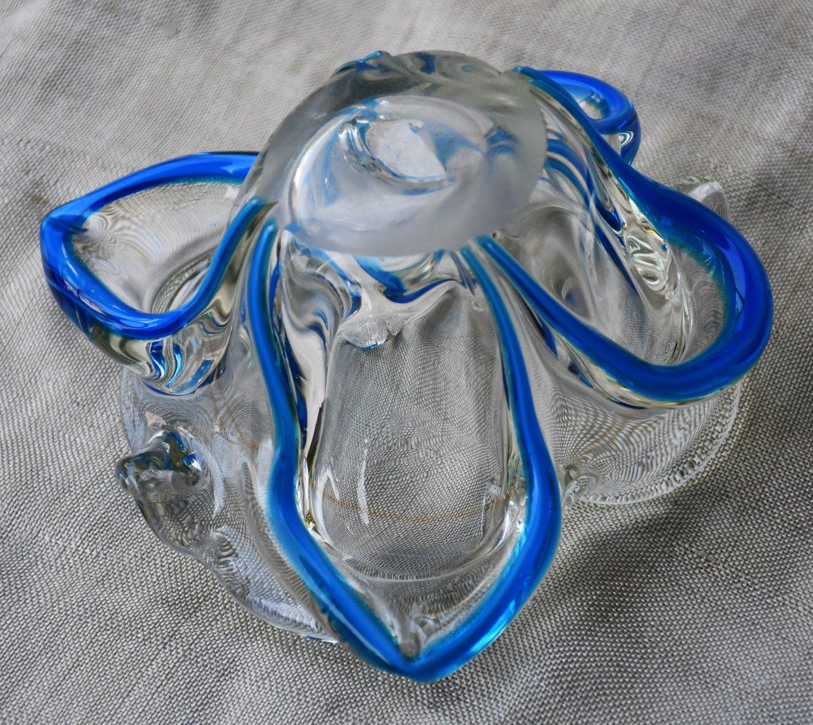 Органична форма на цвете, много декоративна и стилна. Прозрачно стъкло, с ръбове от кралско синьо. Перфектен екземпляр на mid century стила.