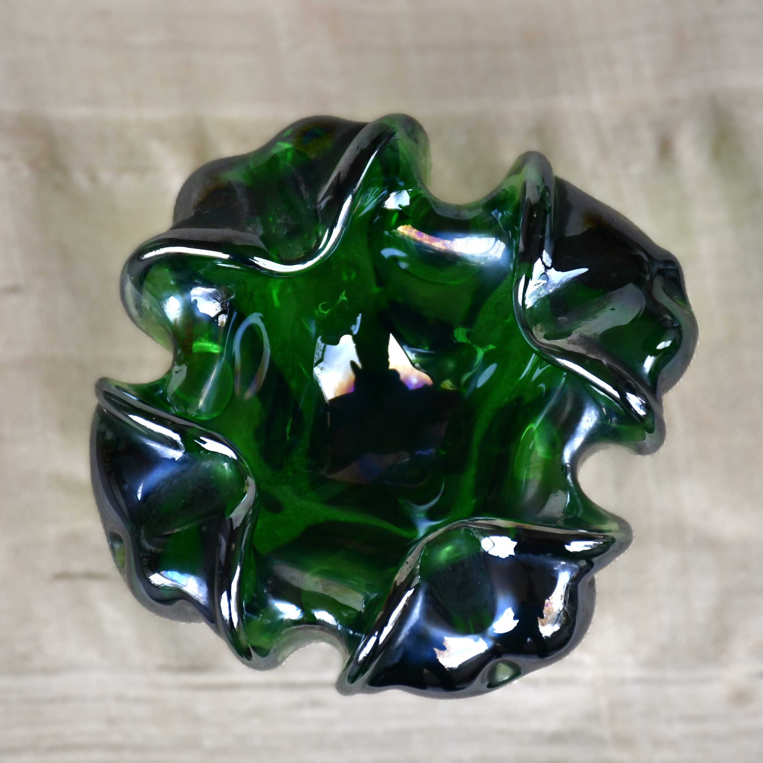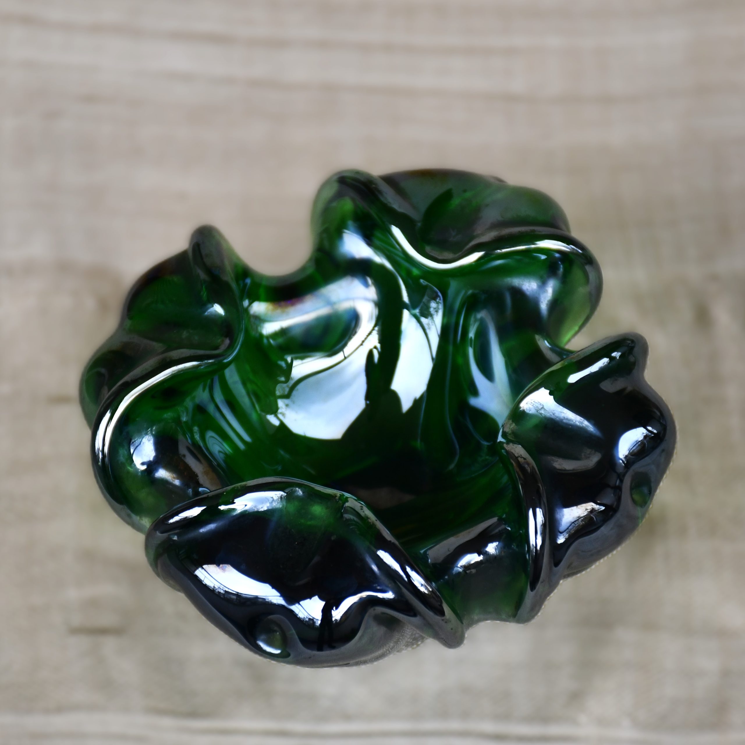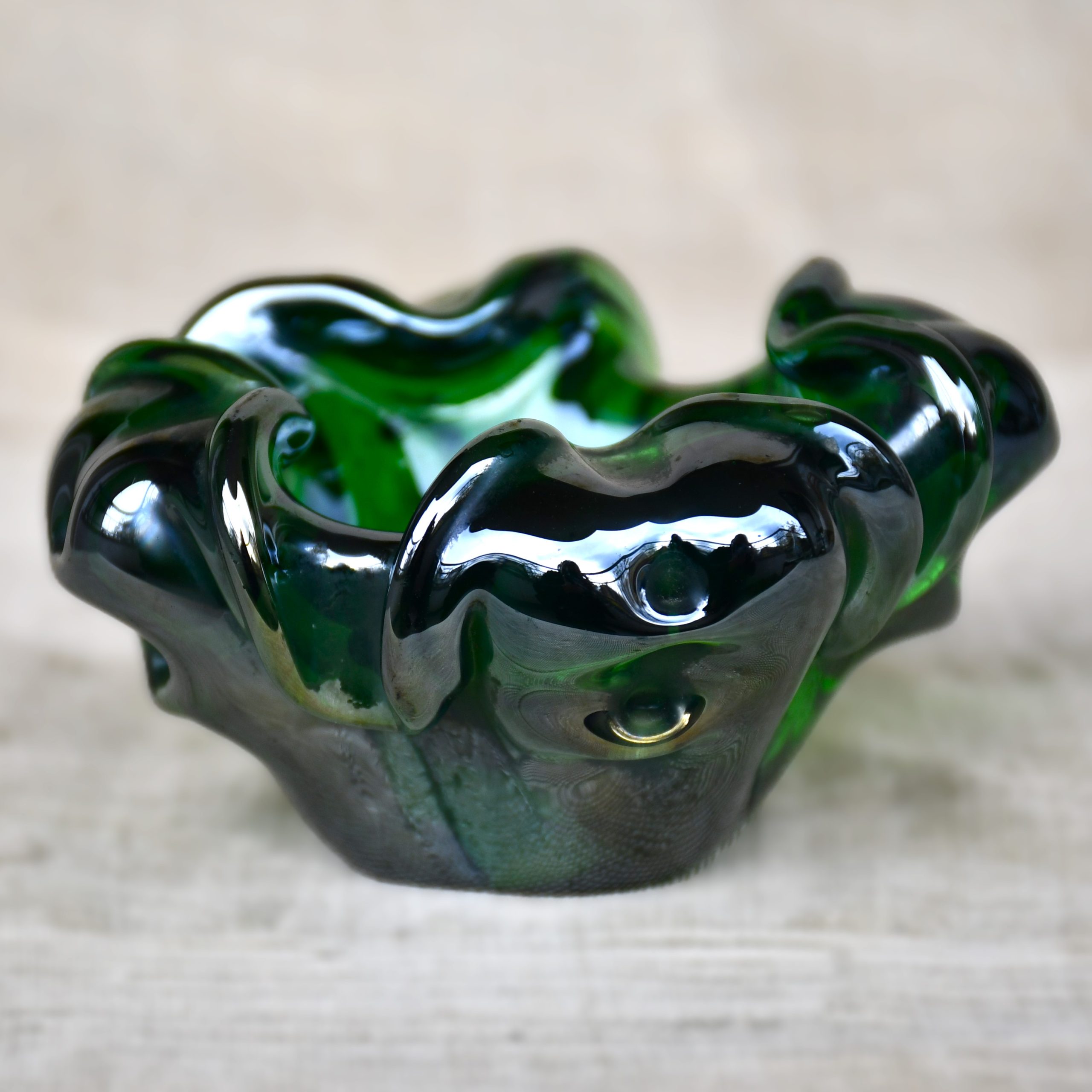 Красив стъклен пепелник от средата на 20 в., художествено стъкло – вер. Чехословакия. Неустановен дизайнер. Изцяло ръчна работа.