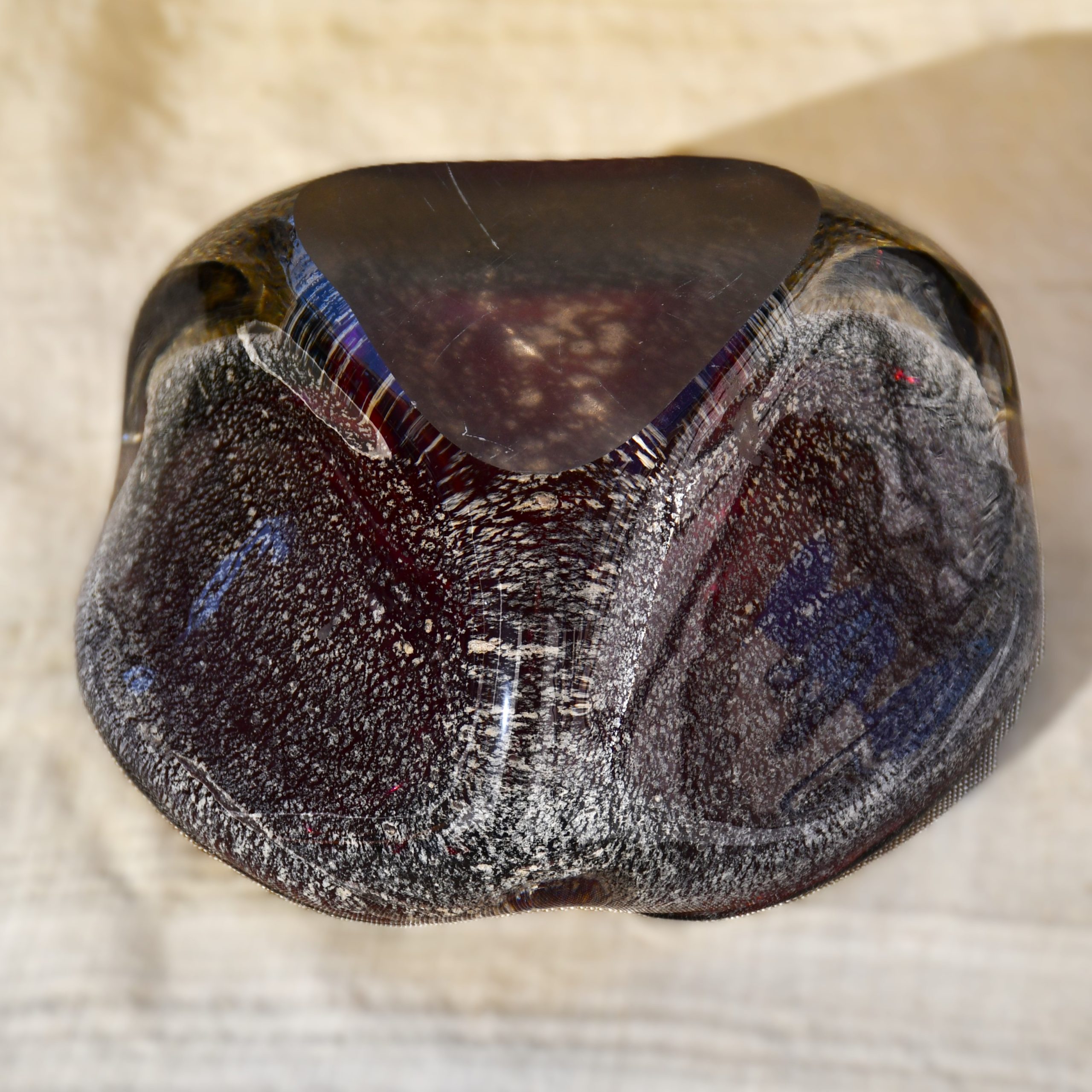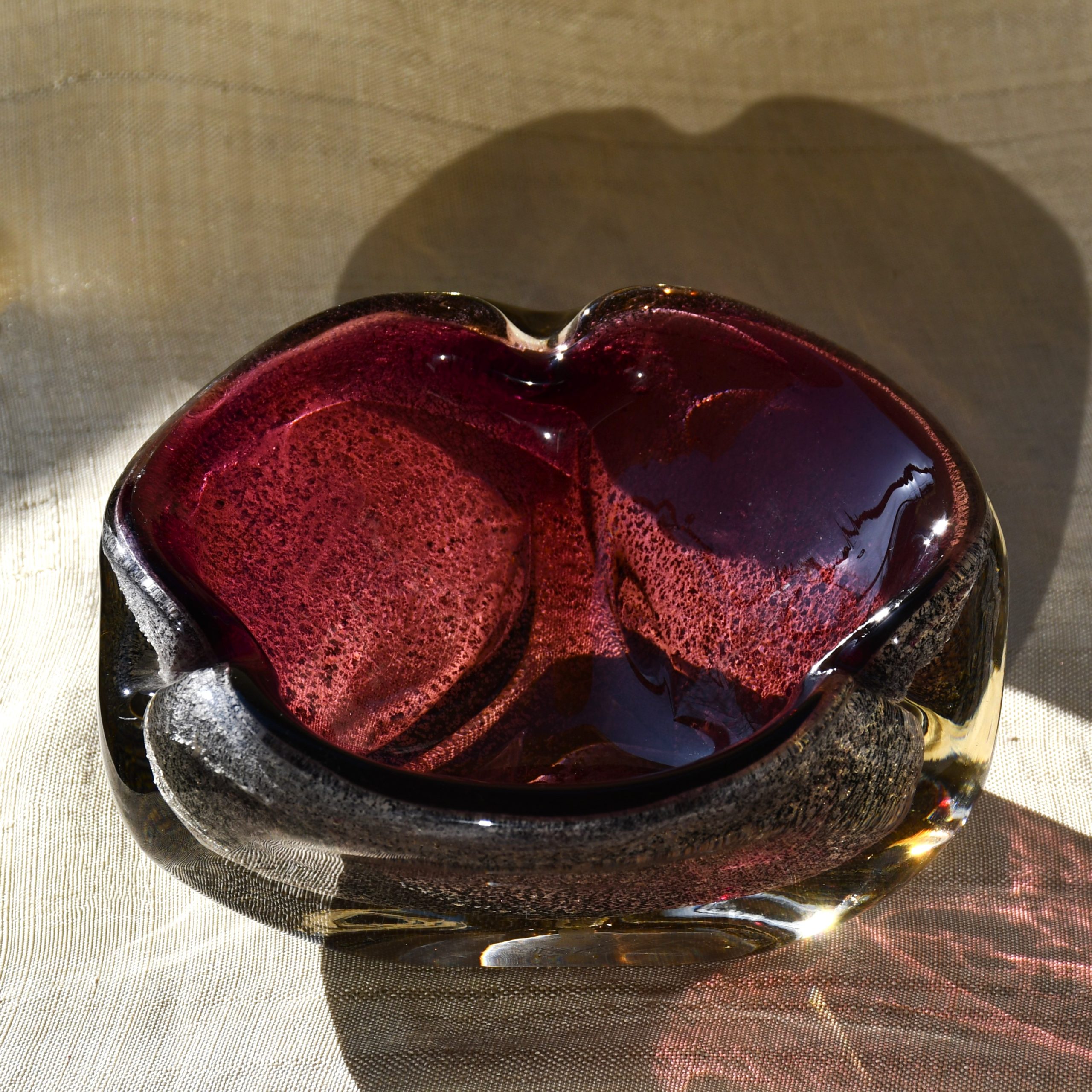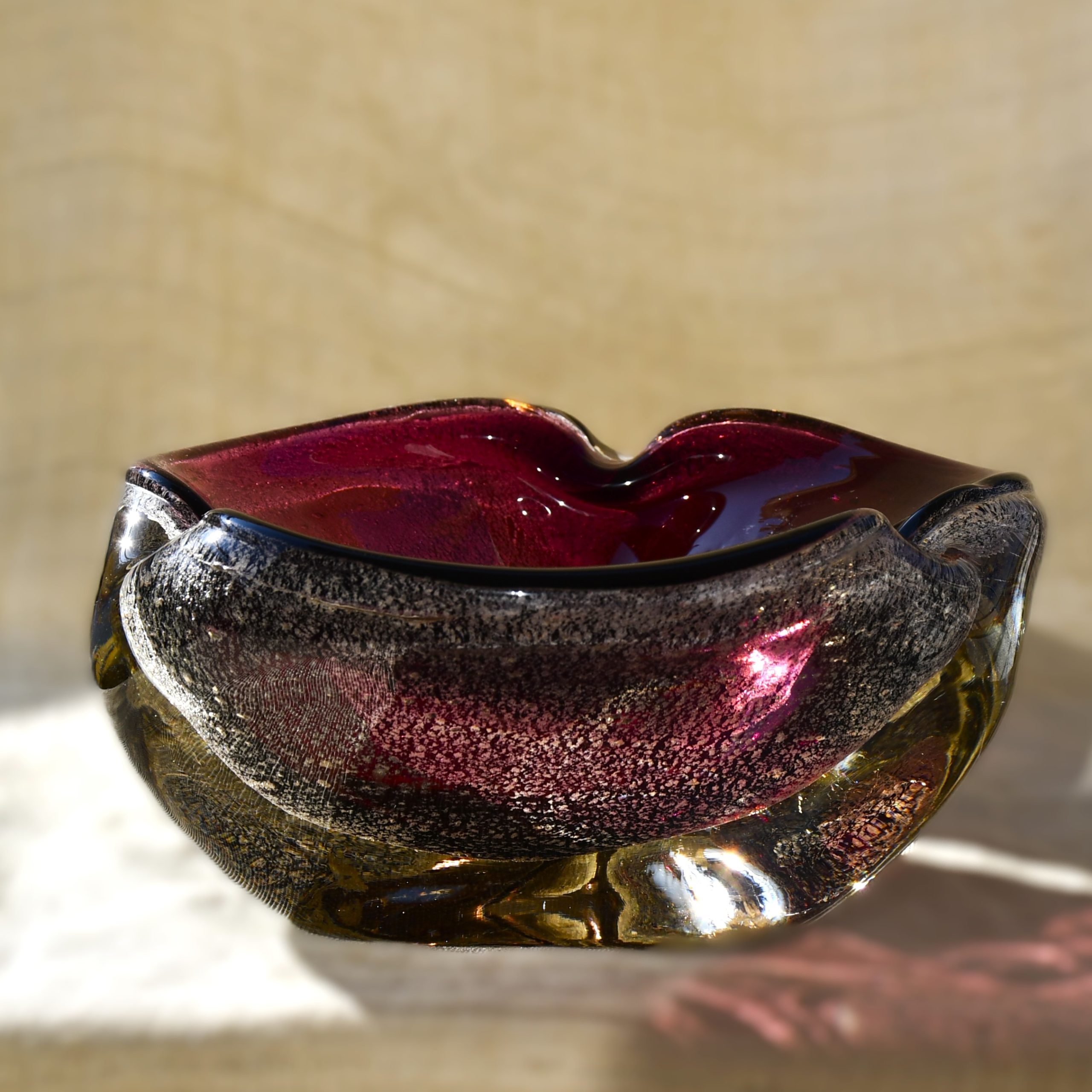 Много красив стъклен пепелник/център от средата на 20 в., художествено стъкло – сомерсо техника със сребърни частици и неконтролирани мехурчета. Мурано, Италия. Голям размер. Датировка – 1950-60те.