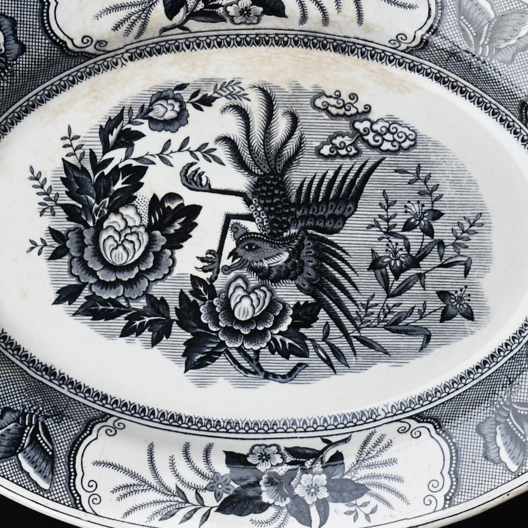 Антична чиния – по-скоро плато за сервиране с мнушителни размери… Трансферен печат в един цвят – черно. Датировка ок. 1830 – 1869 г. Стафордшър, Англия.