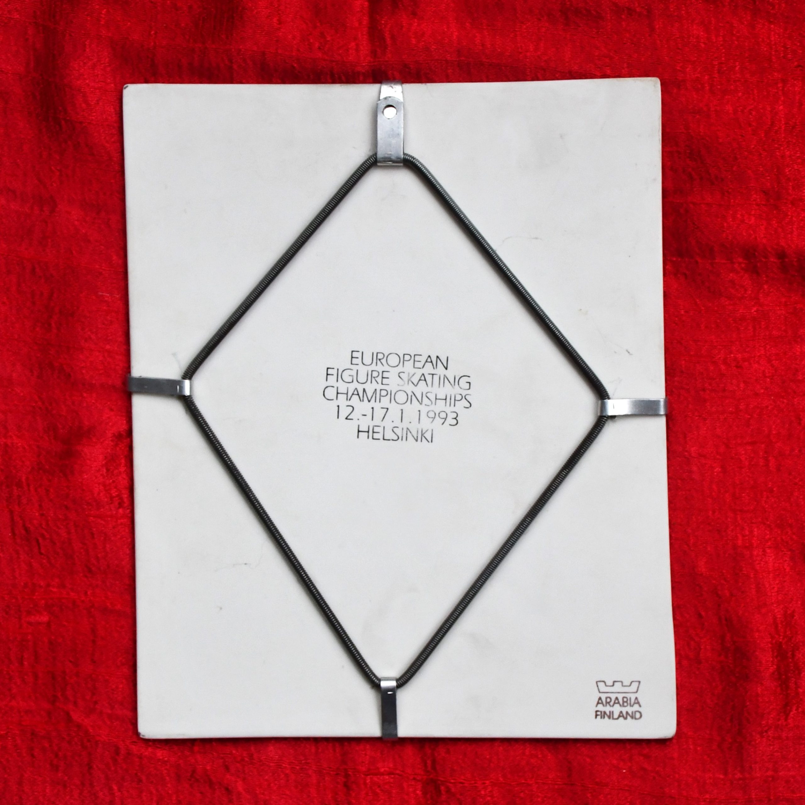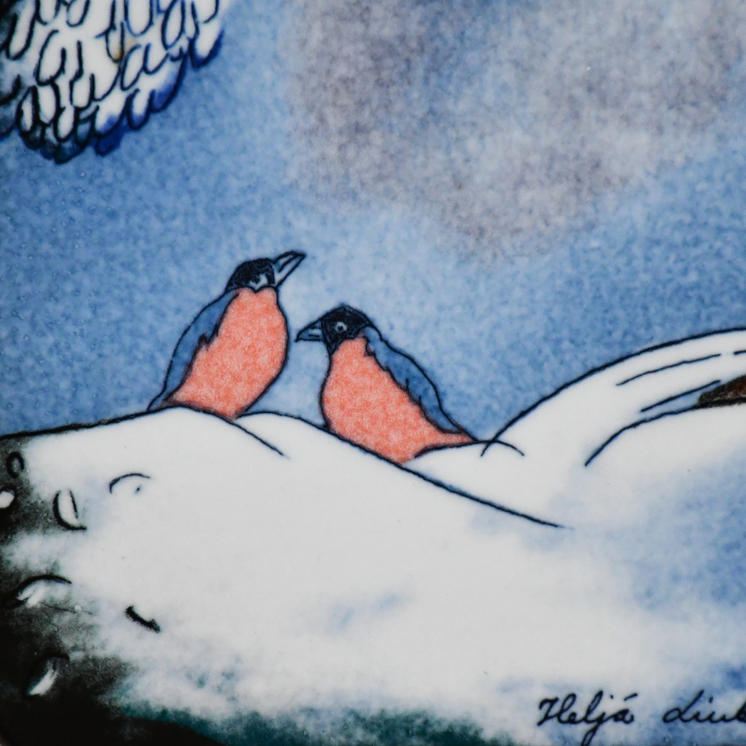 Стилна и рядка винтидж картина от Арабия (Финландия). Порцелан с многоцветна глазура. Работа на известната финска художничка Heljä Liukko-Sundström (1938-2024). Подписана долу дясно. Нарича се „Зима“ и е част от серия „Четирите годишни времена“, създадена ок.1990.