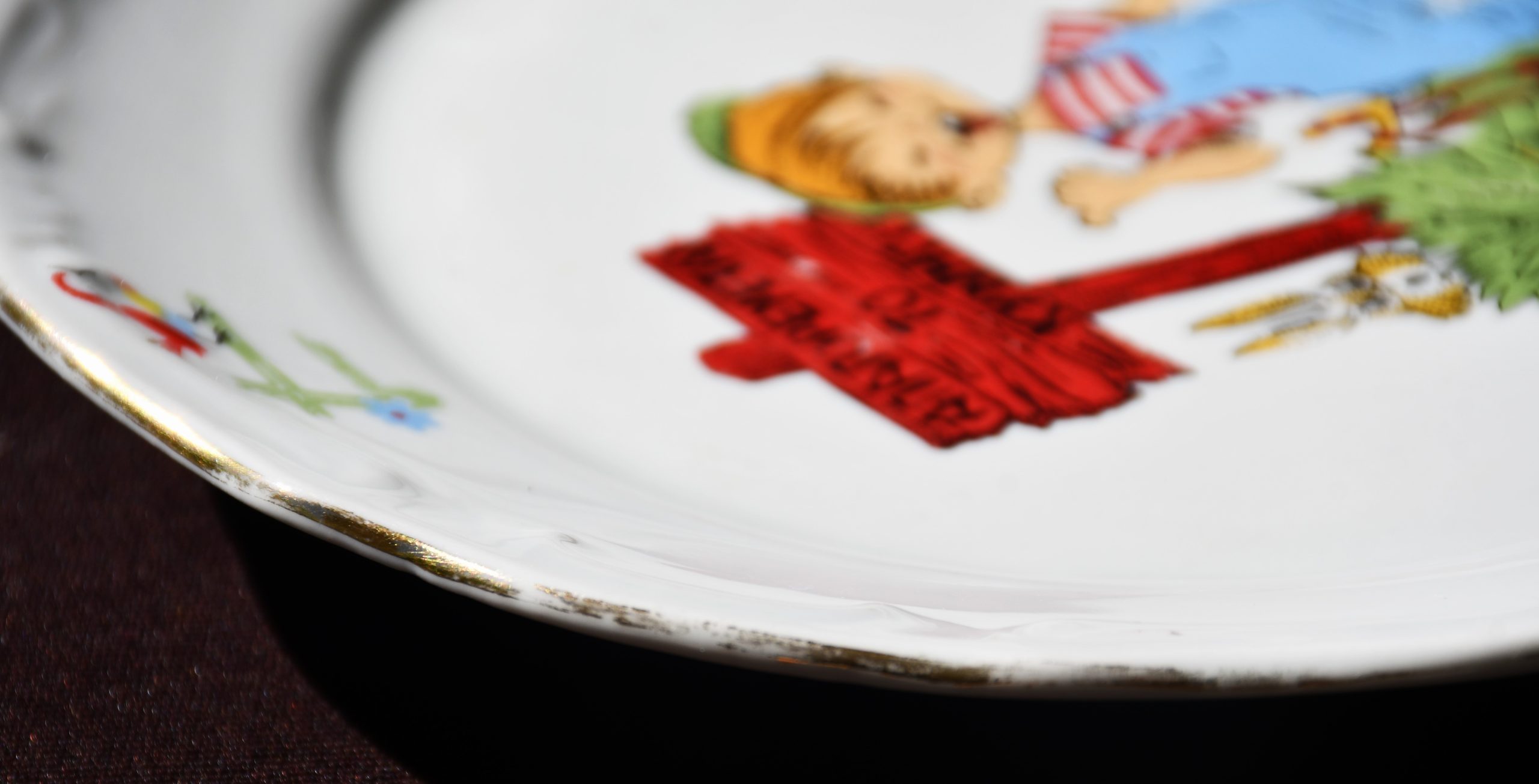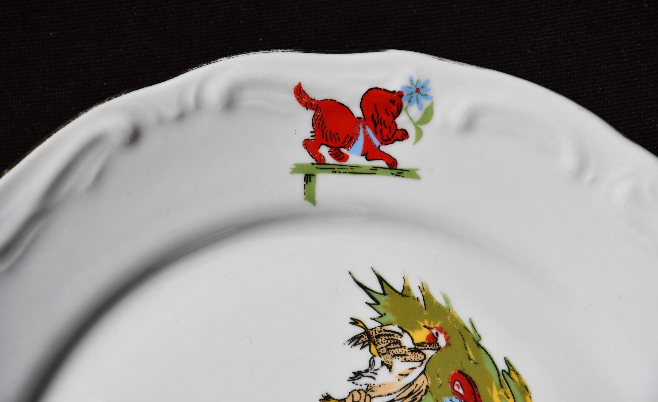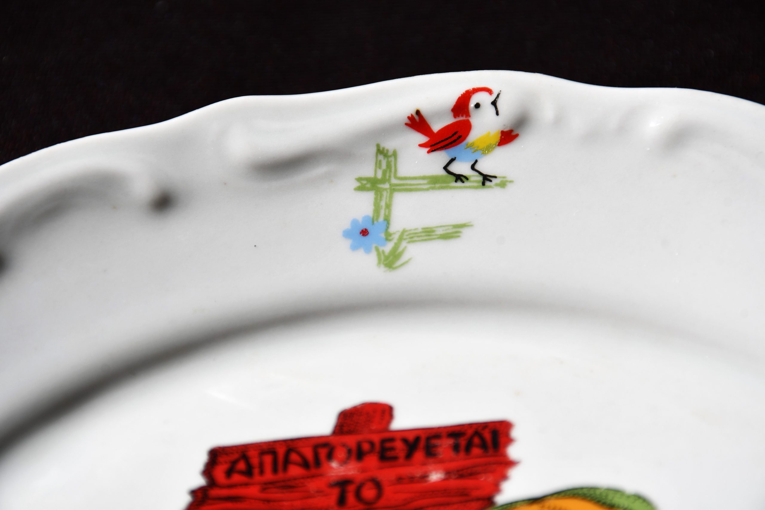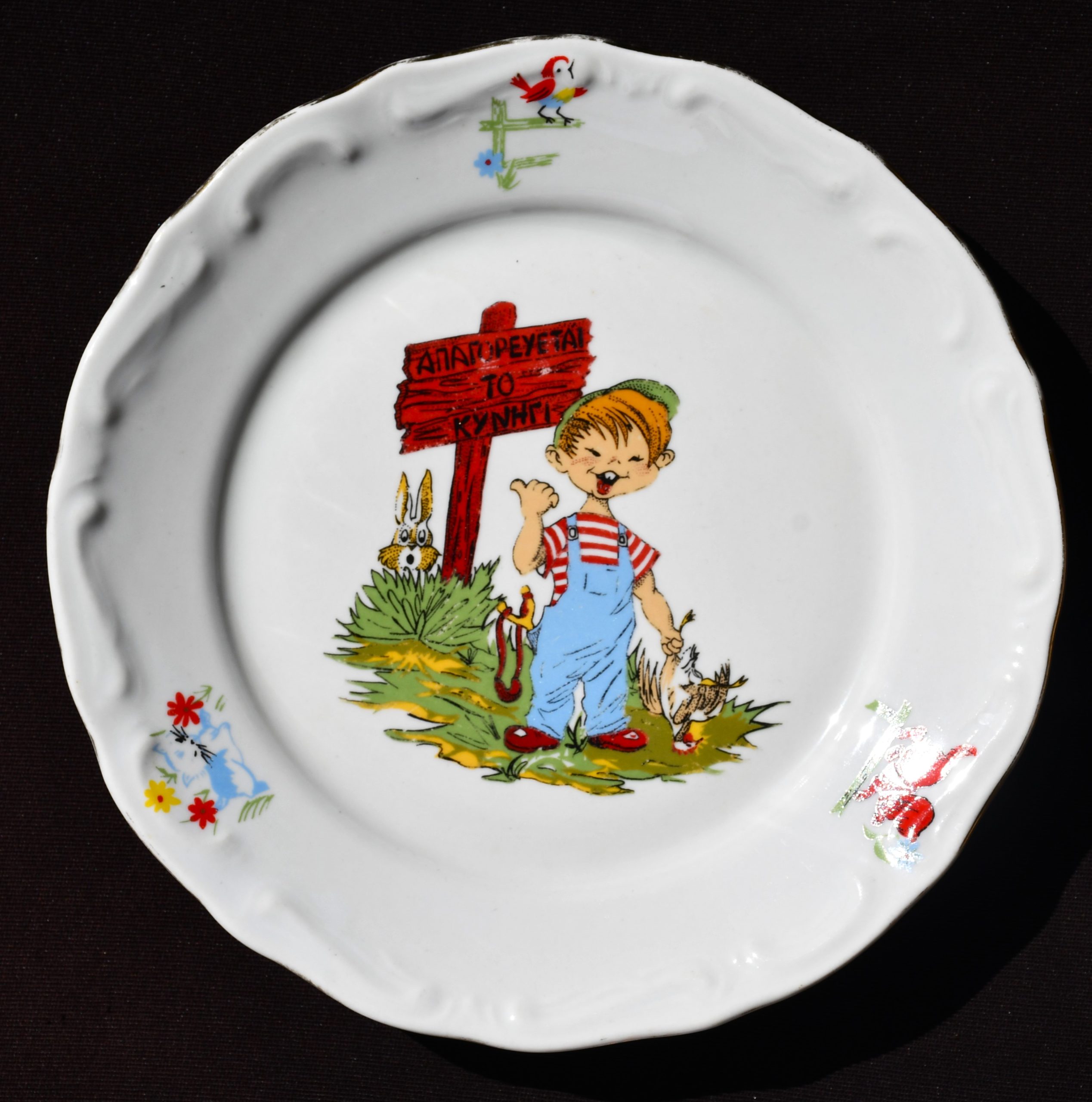 Рядка порцеланова чиния с детски сюжет, произведена от „Изида“, България през 80-те. Предназначена за гръцкия пазар.
