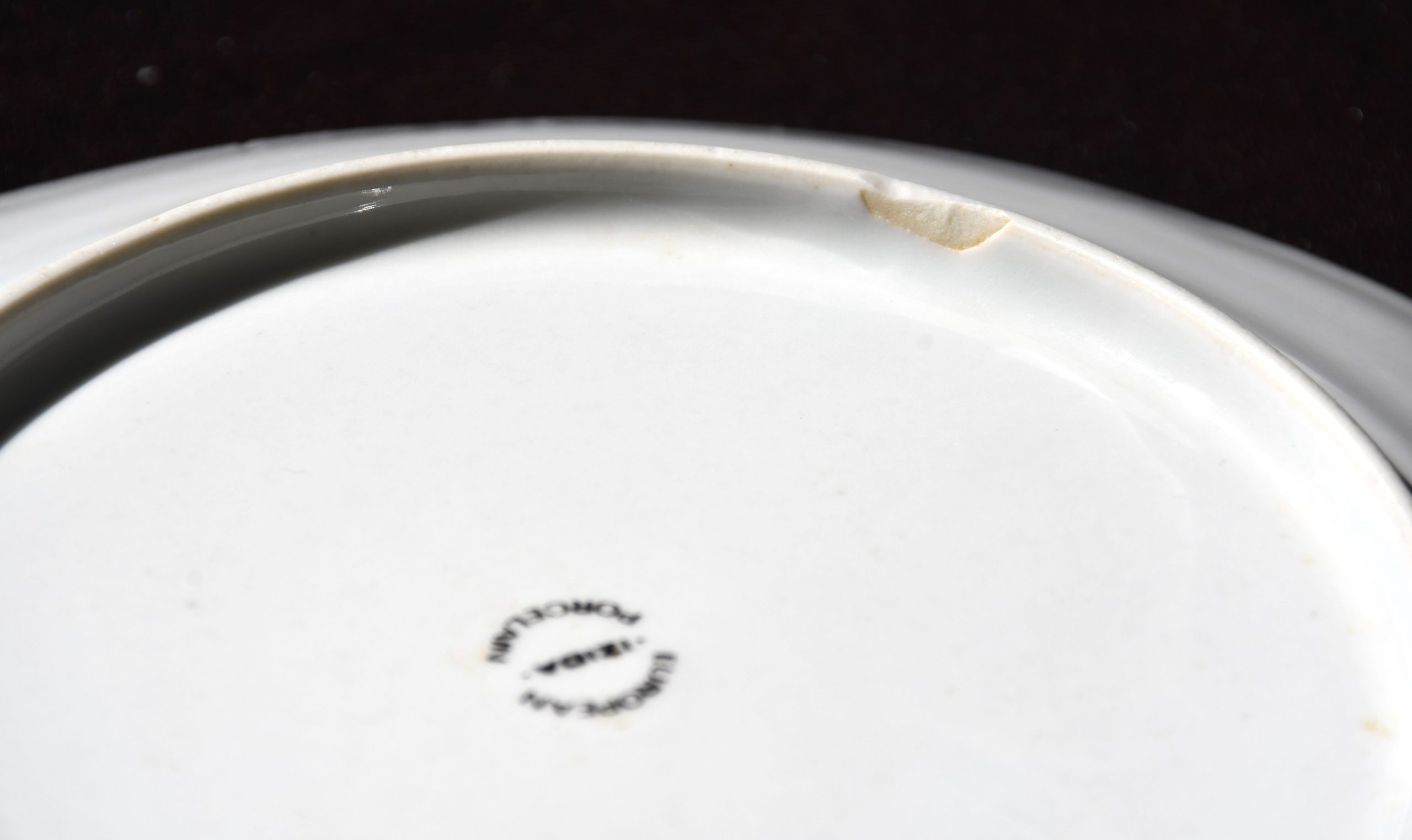 Добро винтидж състояние без значими забележки. Малък чип на долния вътрешен ръб – показан в едър план. Има протривания в златния кант.