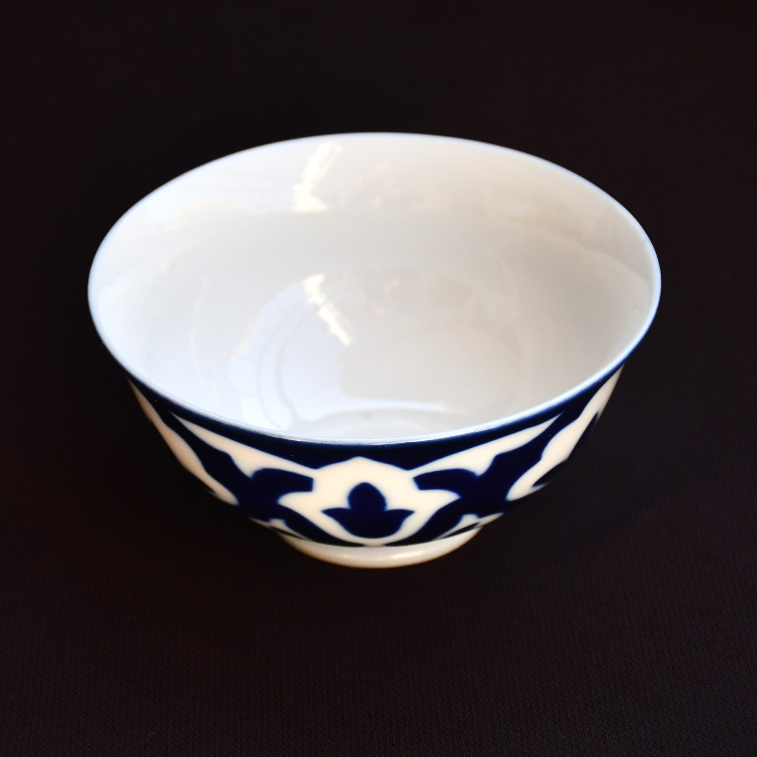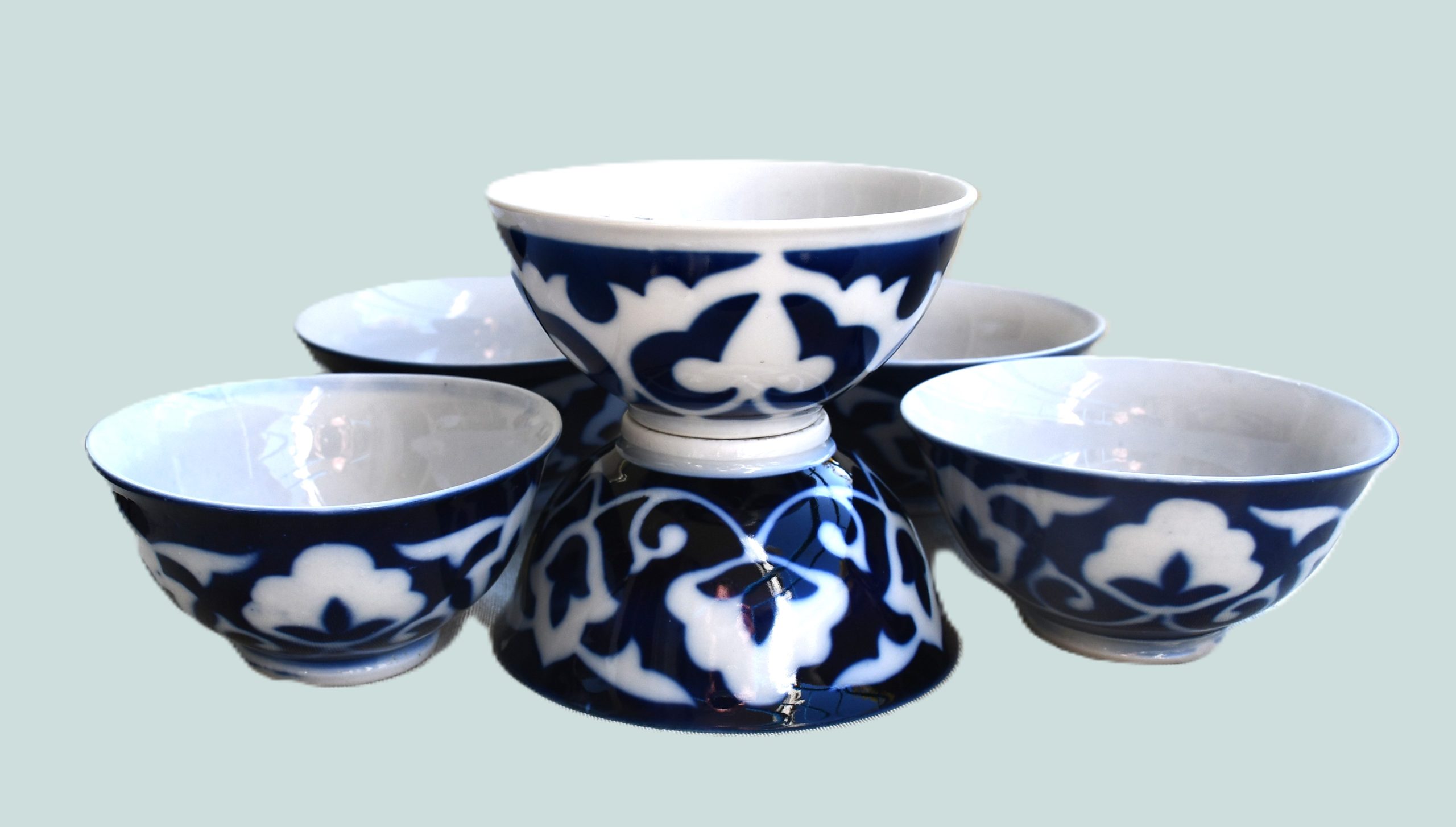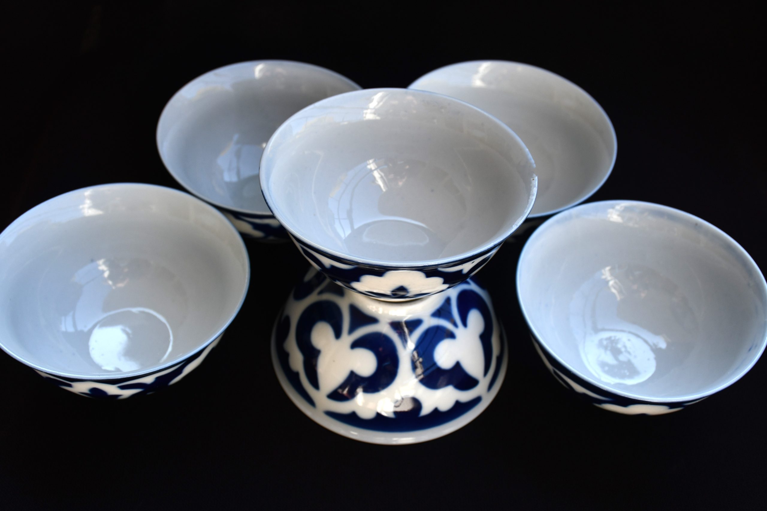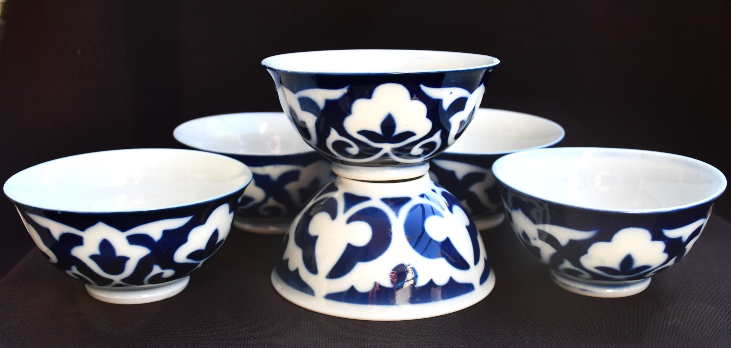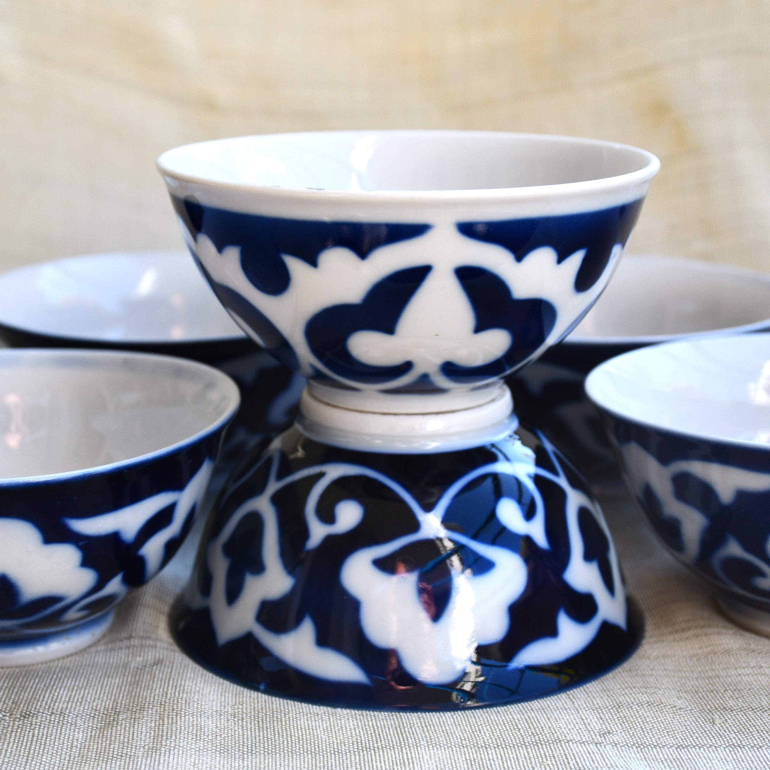Винтидж екзотика! Съветски порцеланов сет за чай, предназначен за пазара в съветските републики от Централна Азия – 1970те. Състои се от 6 чаши/пиали в характерния за региона стил. Рядка находка в пълна комплектация. Ръчно декорирани с кобалт в азиатски стил.