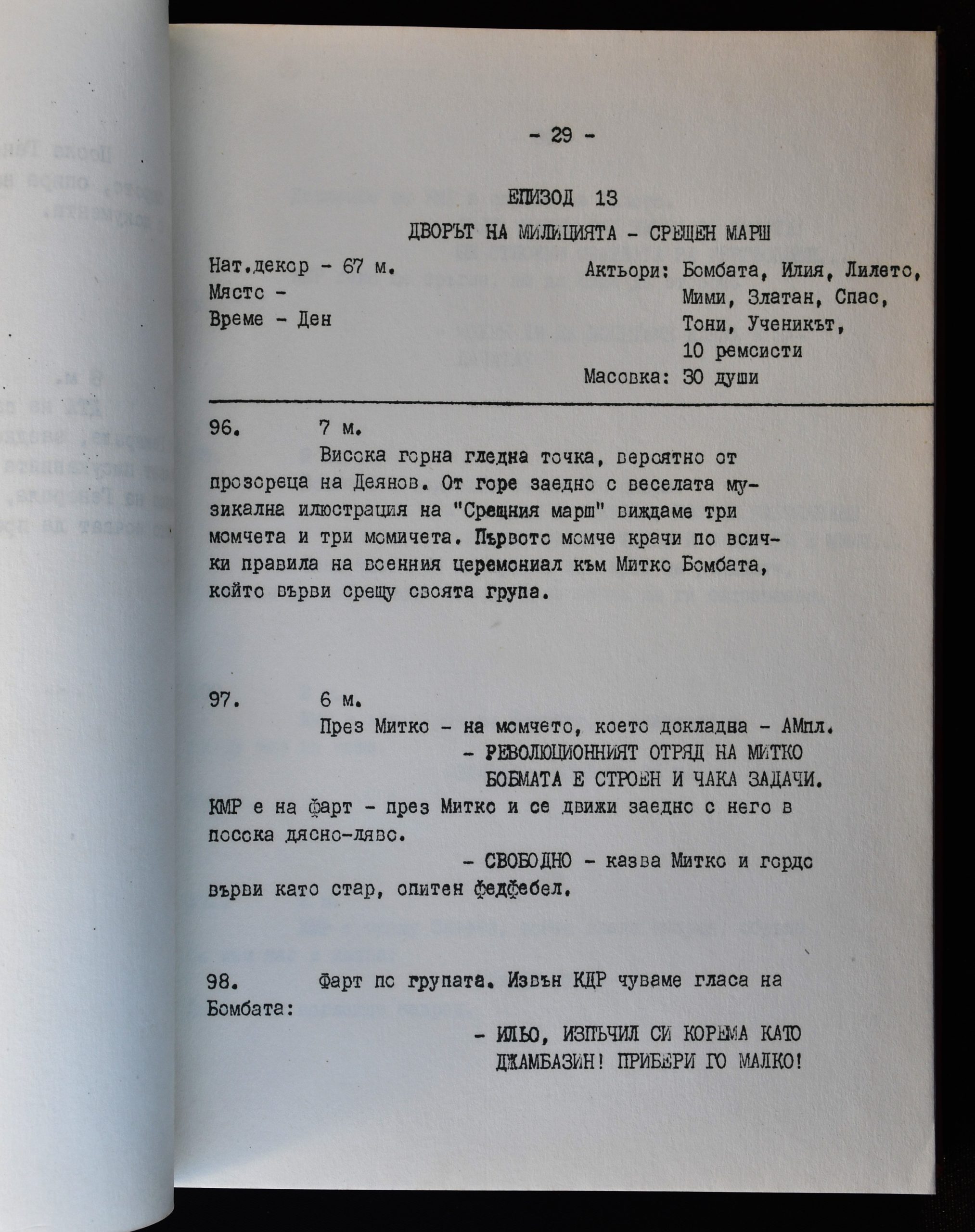 Режисьорска книга от култовия сериал „На всеки километър“. 1970 г. Уникална част от най-популярния български сериал. Свръх рядък екземпляр в чудесно общо състояние. Правени са само по няколко броя – за главните участници в процеса. Истинско парче история – и на БНТ, и на легендарните актьори Стефан Данаилов и Григор Вачков, а и на българското кино въобще…