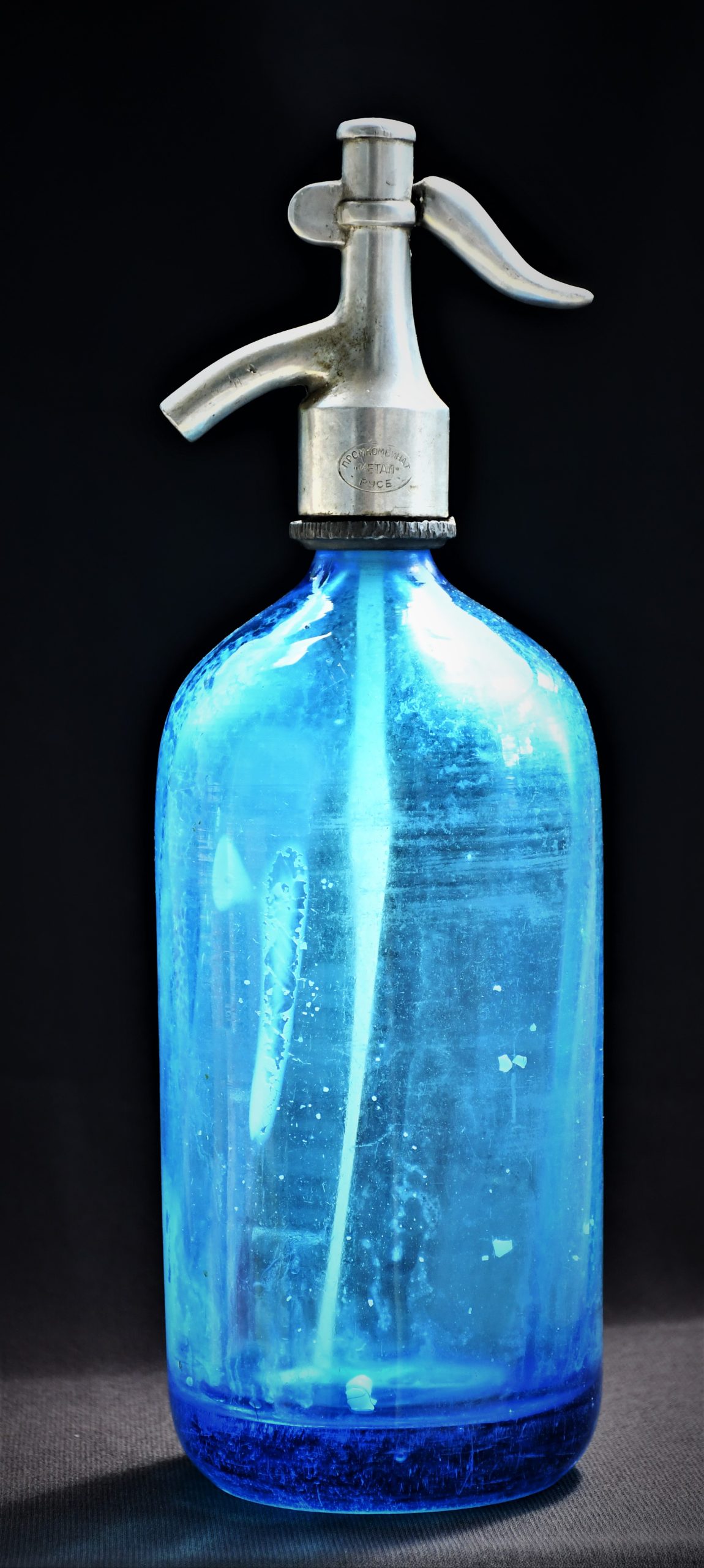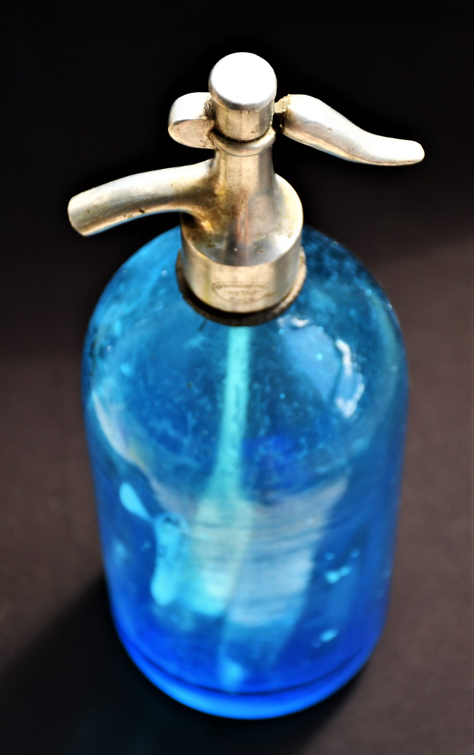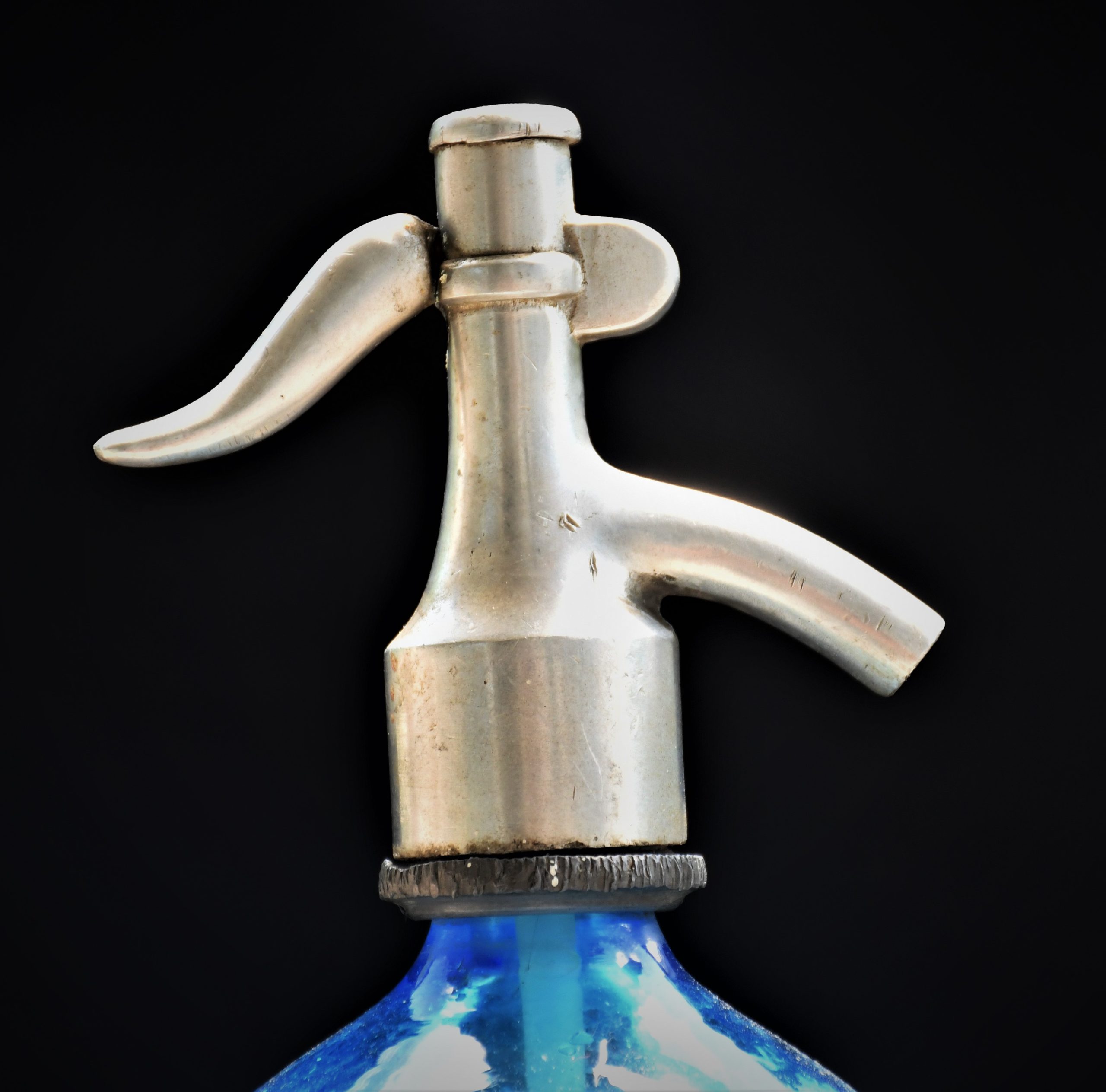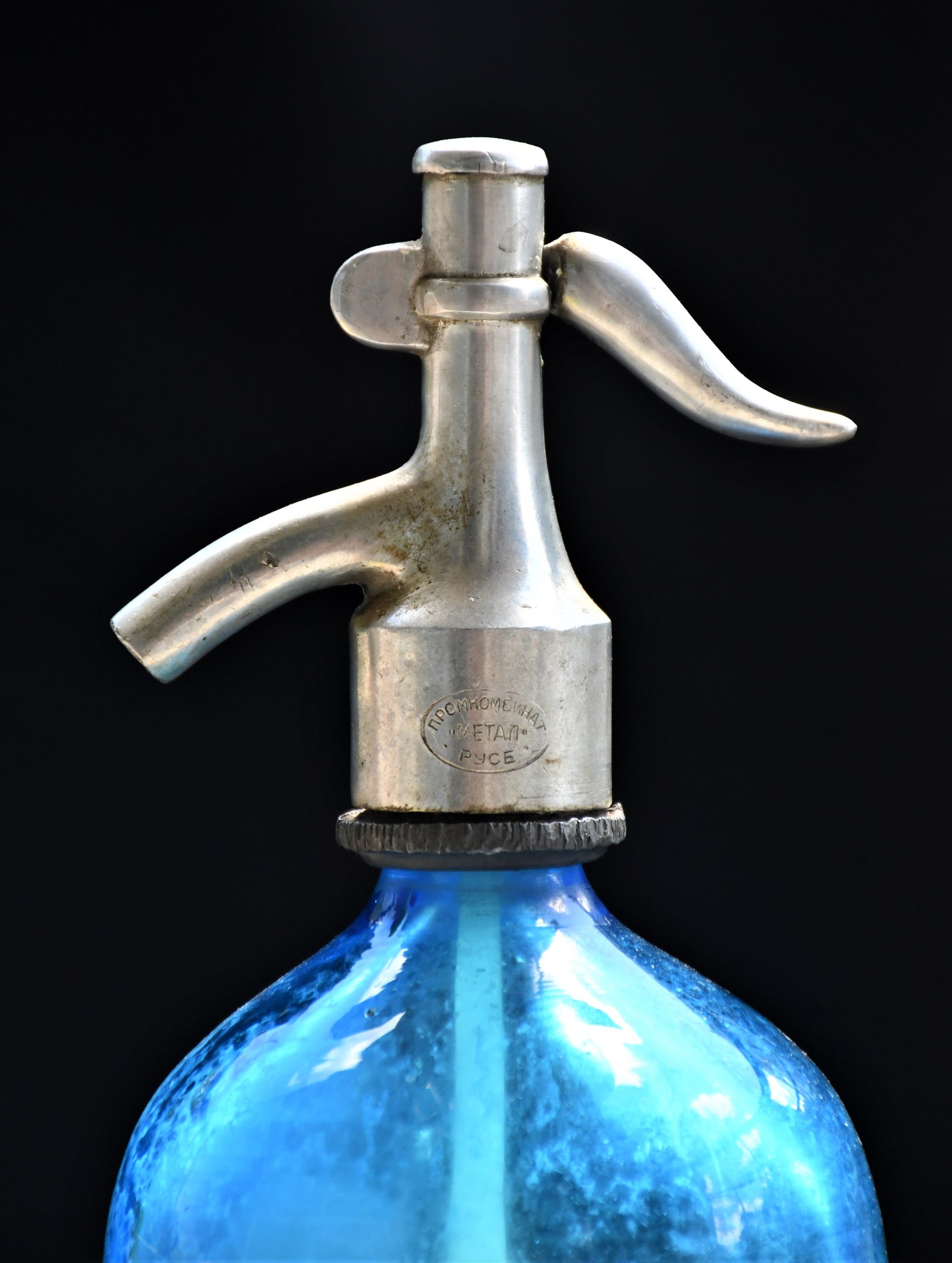 Носталгичен винтидж сифон, произведен от Промкомбинат „Метал“, Русе през 1950-те. (Национализирана фирма „Тевекелев“.) Рядко срещано изпълнение от синьо стъкло.