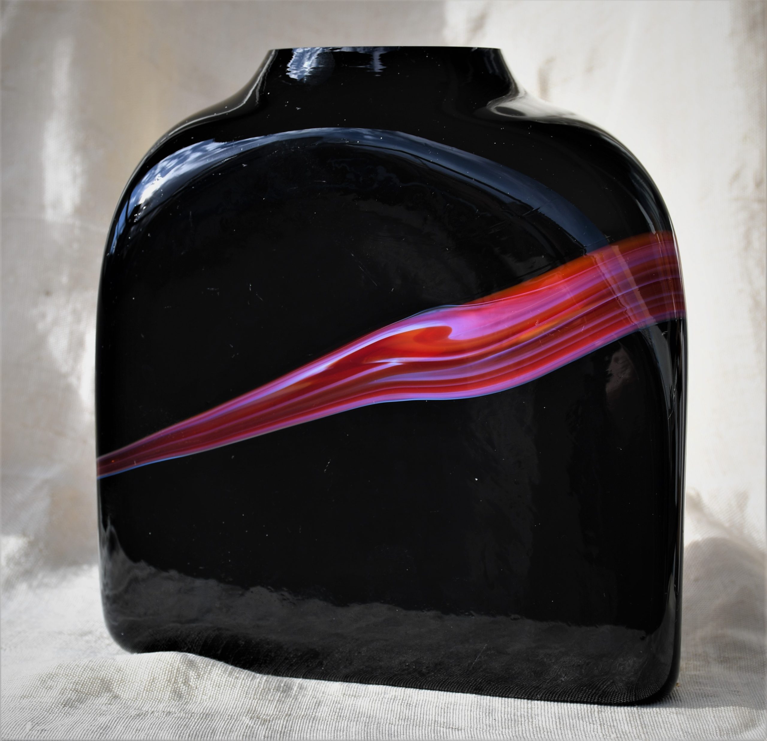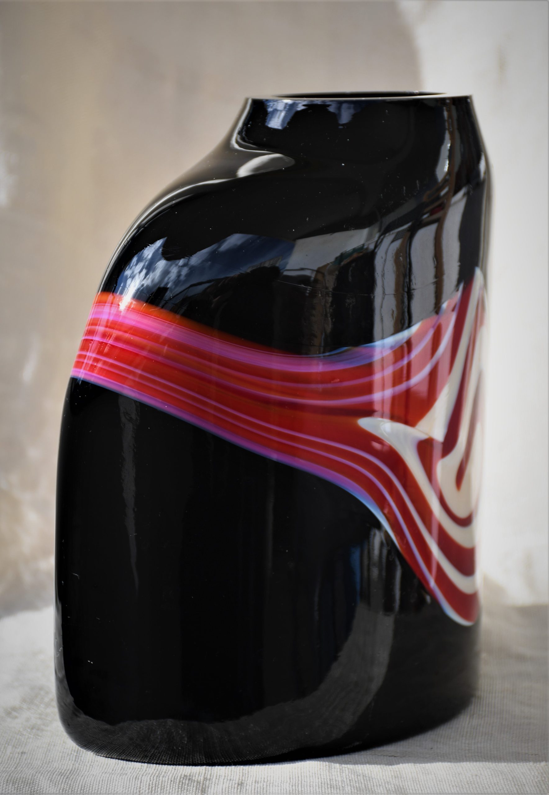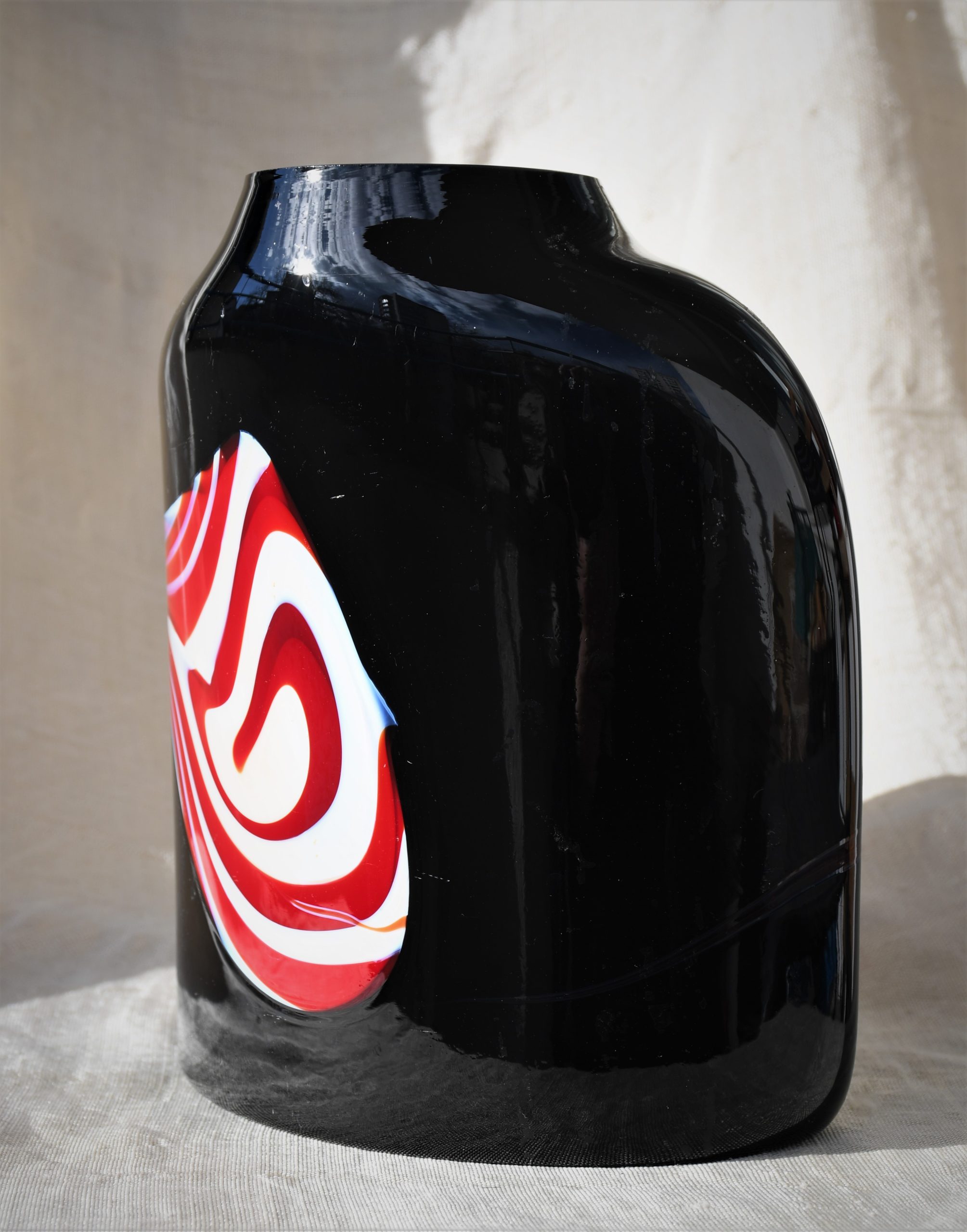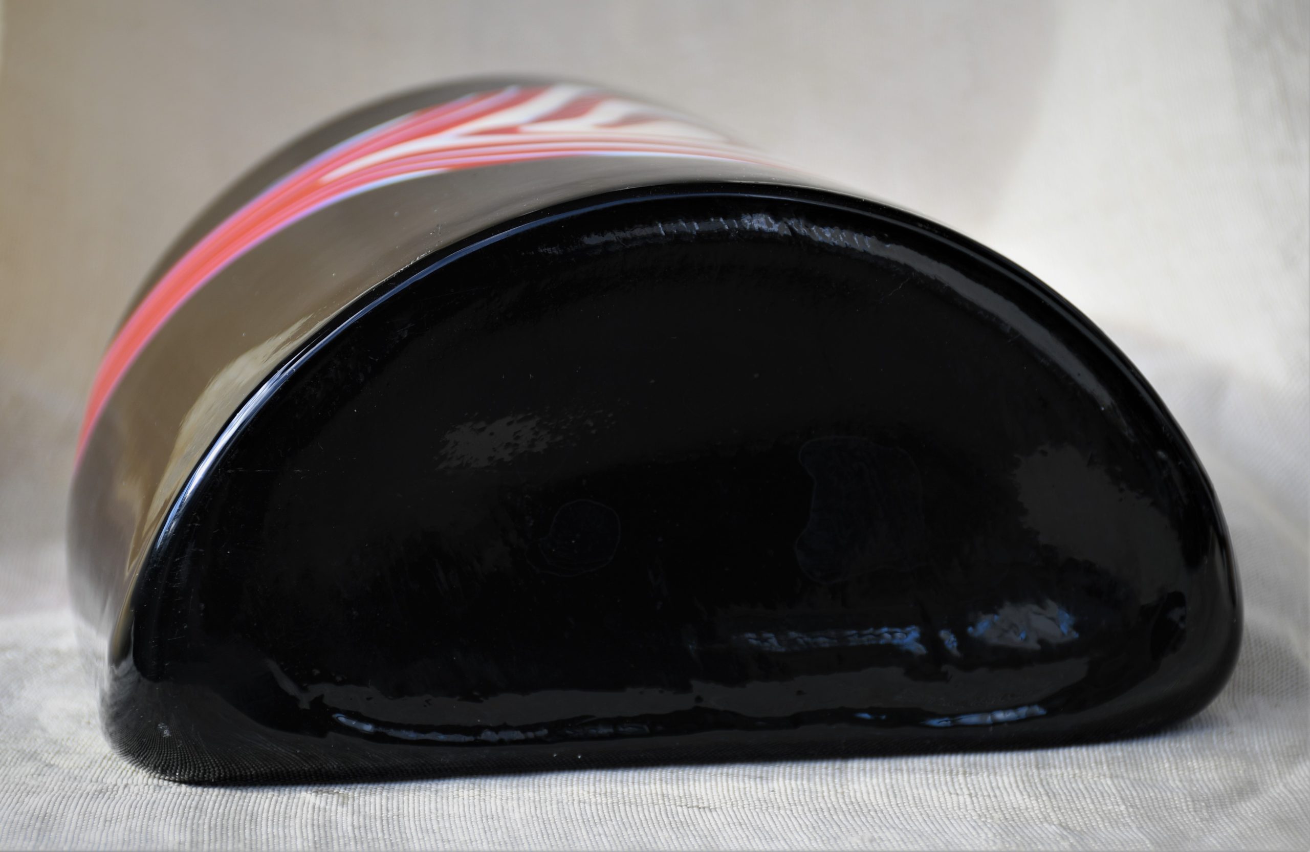 От непрозрачно черно стъкло с включвания на бяло и червено в абстрактен дизайн. Чрез тази стъкларска техника всеки следващ продукт е уникален. Изключително декоративна, с характерно присъствие в пространството на стаята. Непрорпорционална, различна от различните гледни точки… Перфектен и емблематичен предмет в стил Mid Century Modern.