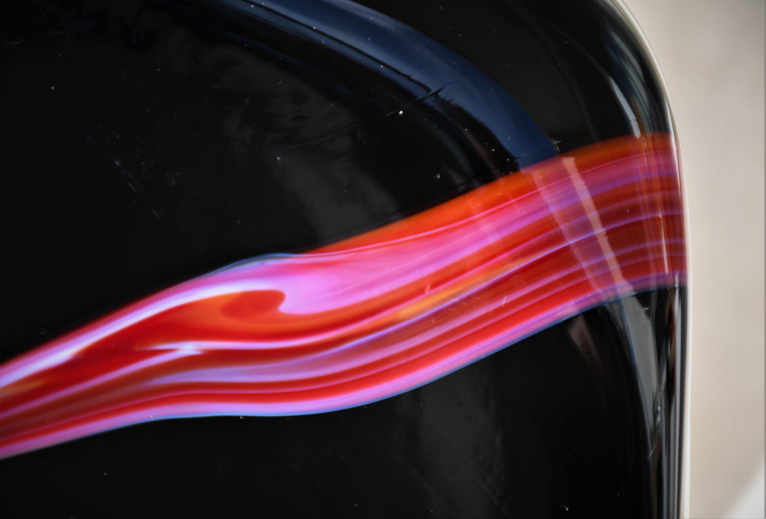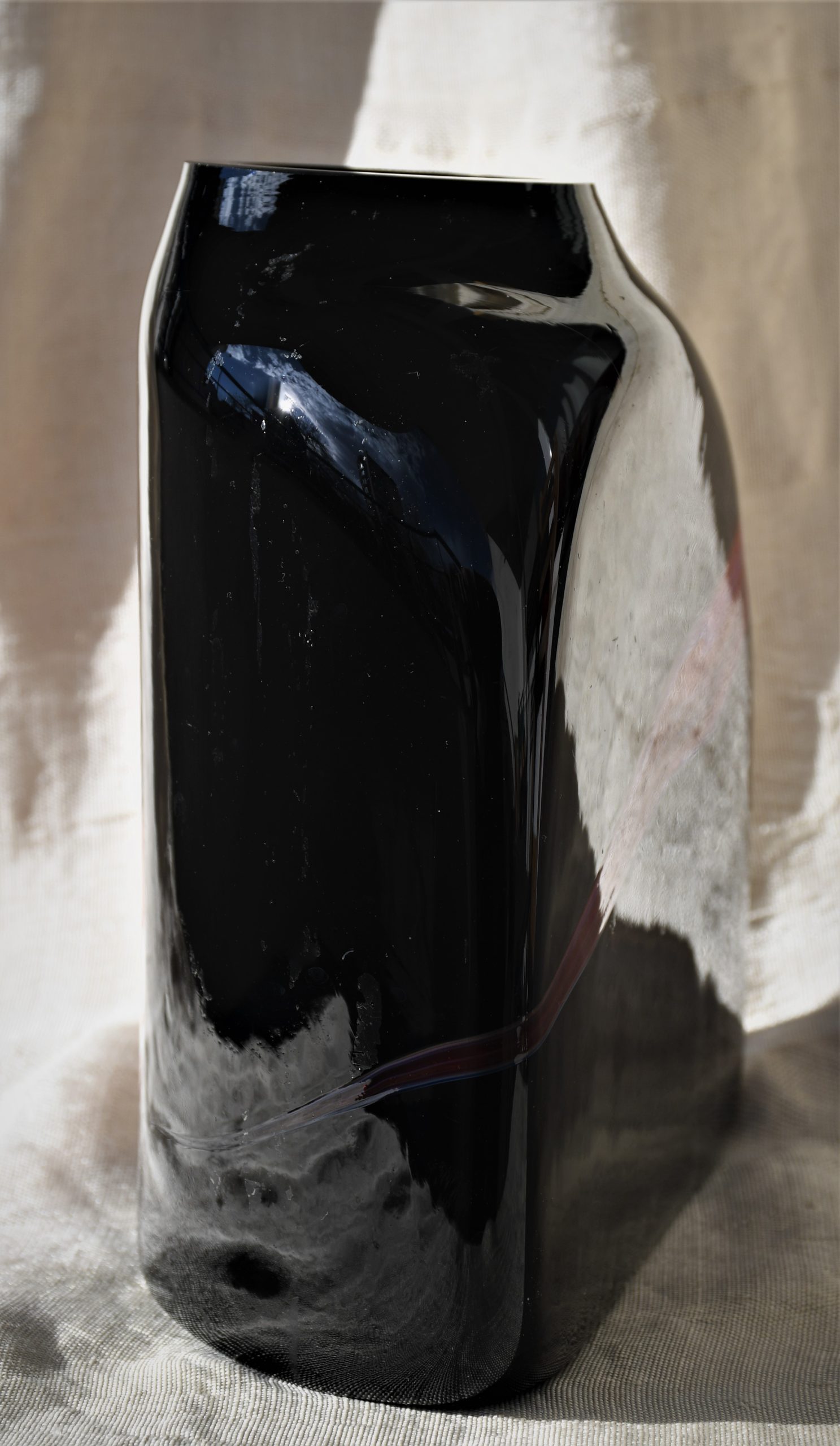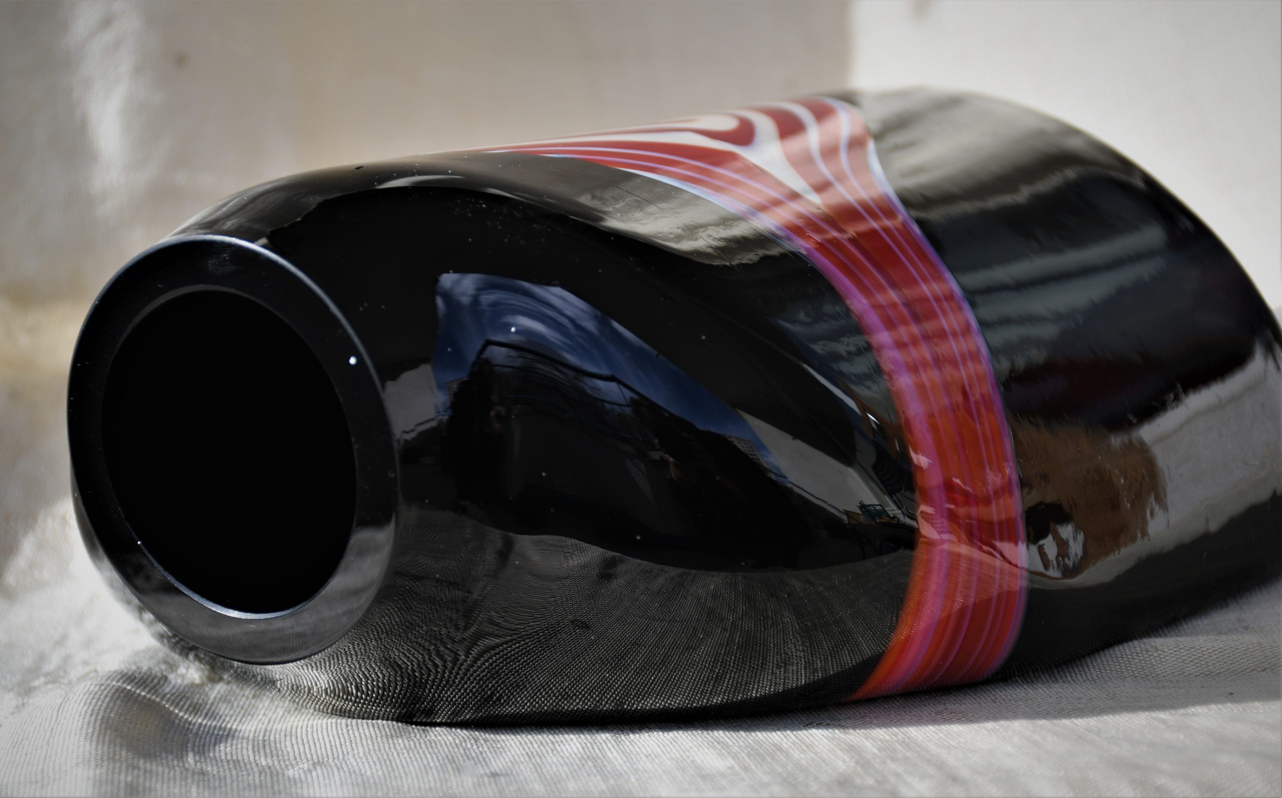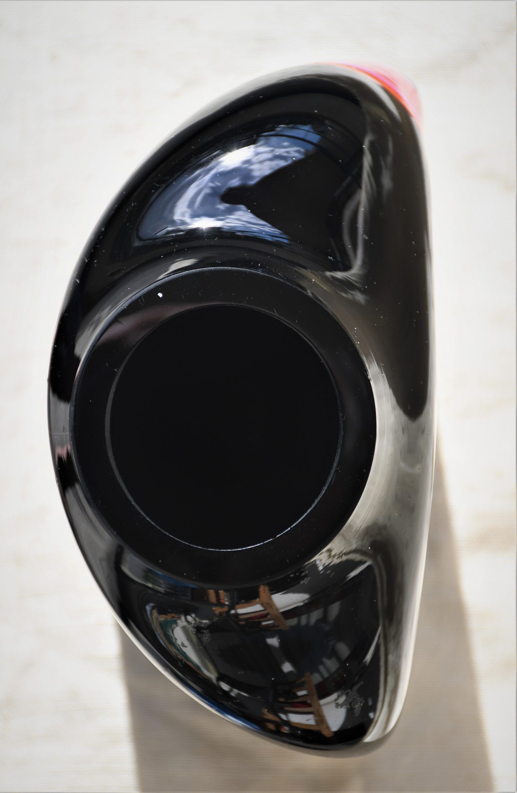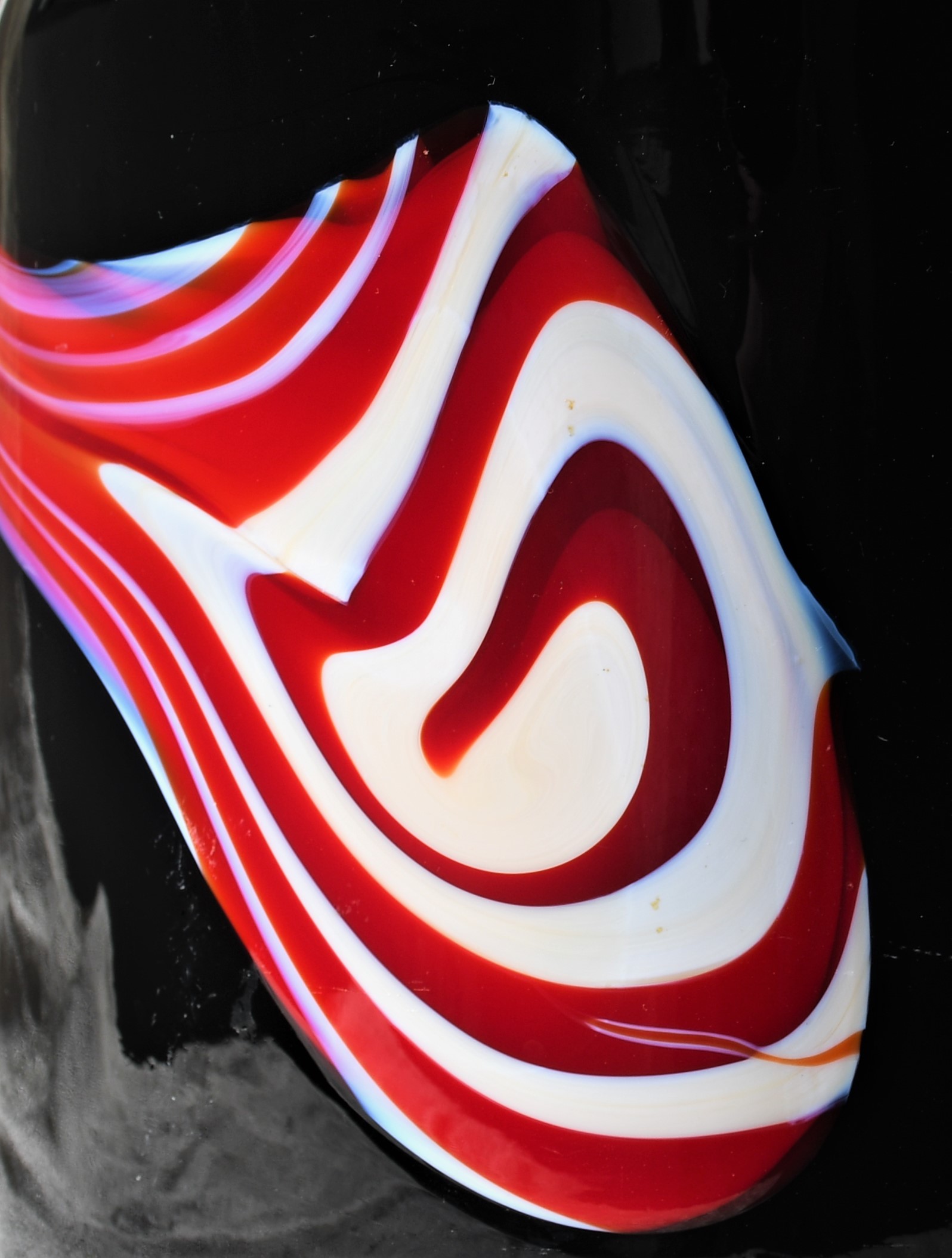 От непрозрачно черно стъкло с включвания на бяло и червено в абстрактен дизайн. Чрез тази стъкларска техника всеки следващ продукт е уникален. Изключително декоративна, с характерно присъствие в пространството на стаята. Непрорпорционална, различна от различните гледни точки… Перфектен и емблематичен предмет в стил Mid Century Modern.
