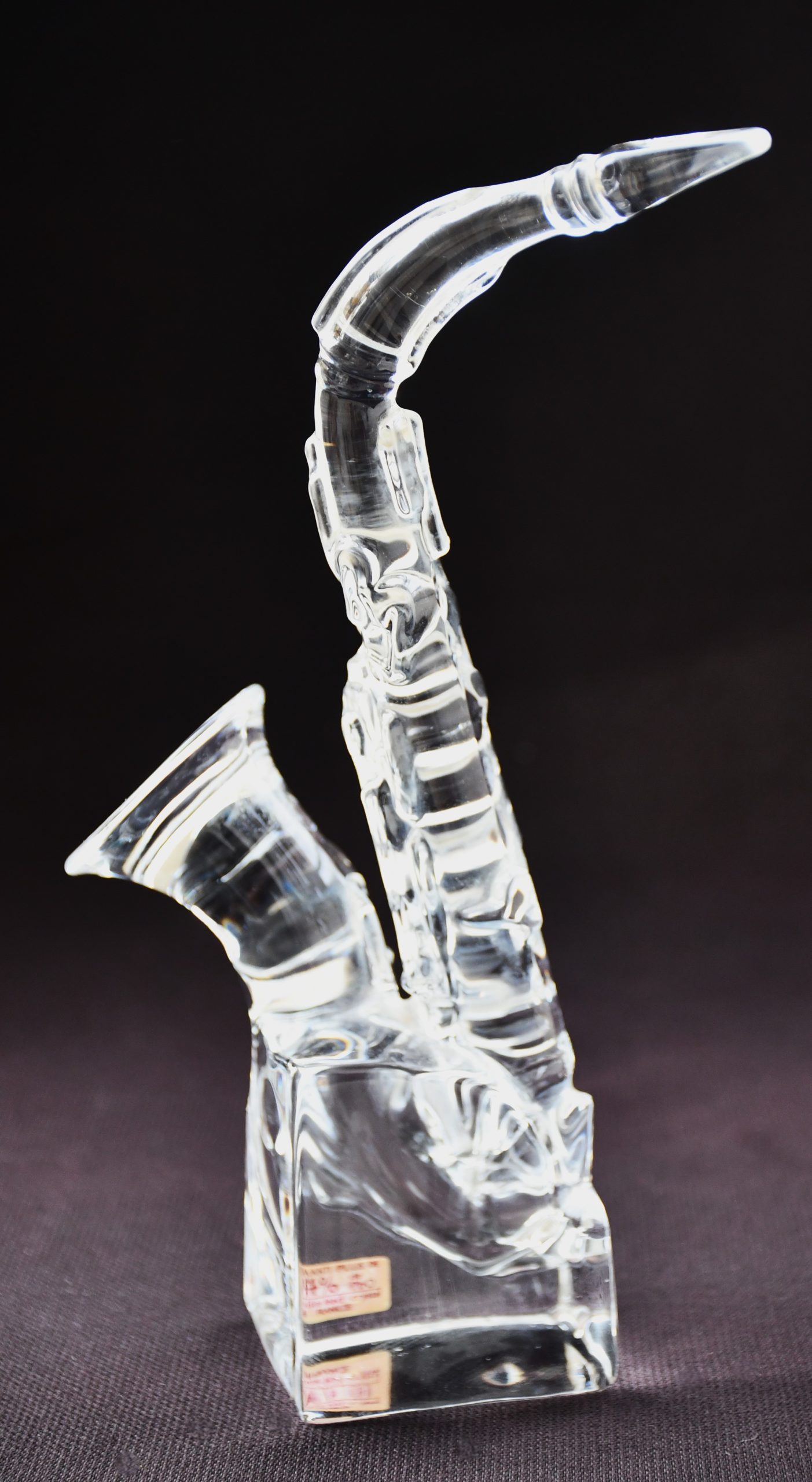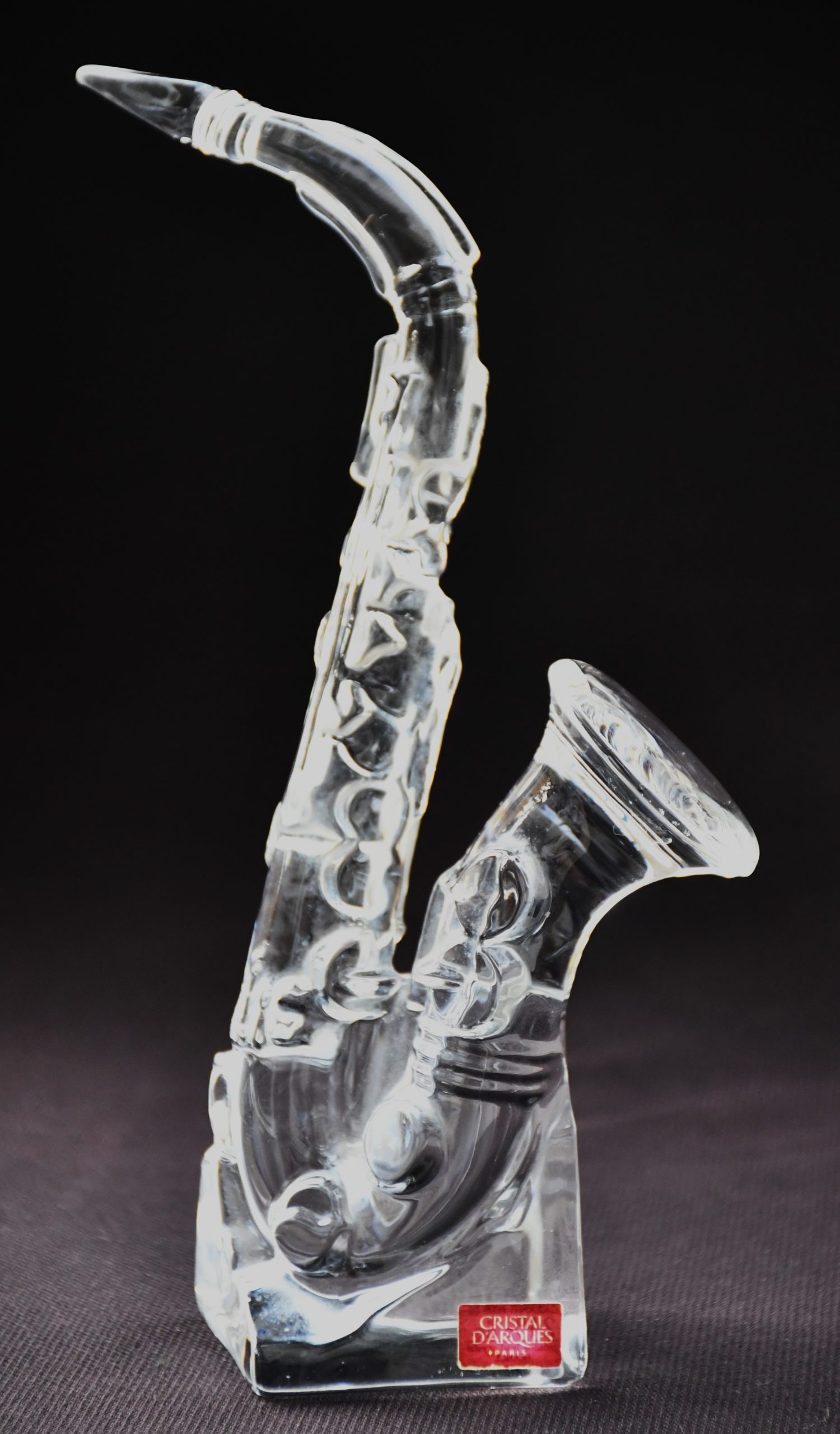 Екстравагантна кристална скулптура – саксофон, датирана 70’те. Производство на знаменитата френска кристалерия Cristal d’Arques. Дизайнер – неизвестен. Не е подписана, както повечето неща от периода. Оригиналният етикет е наличен.
