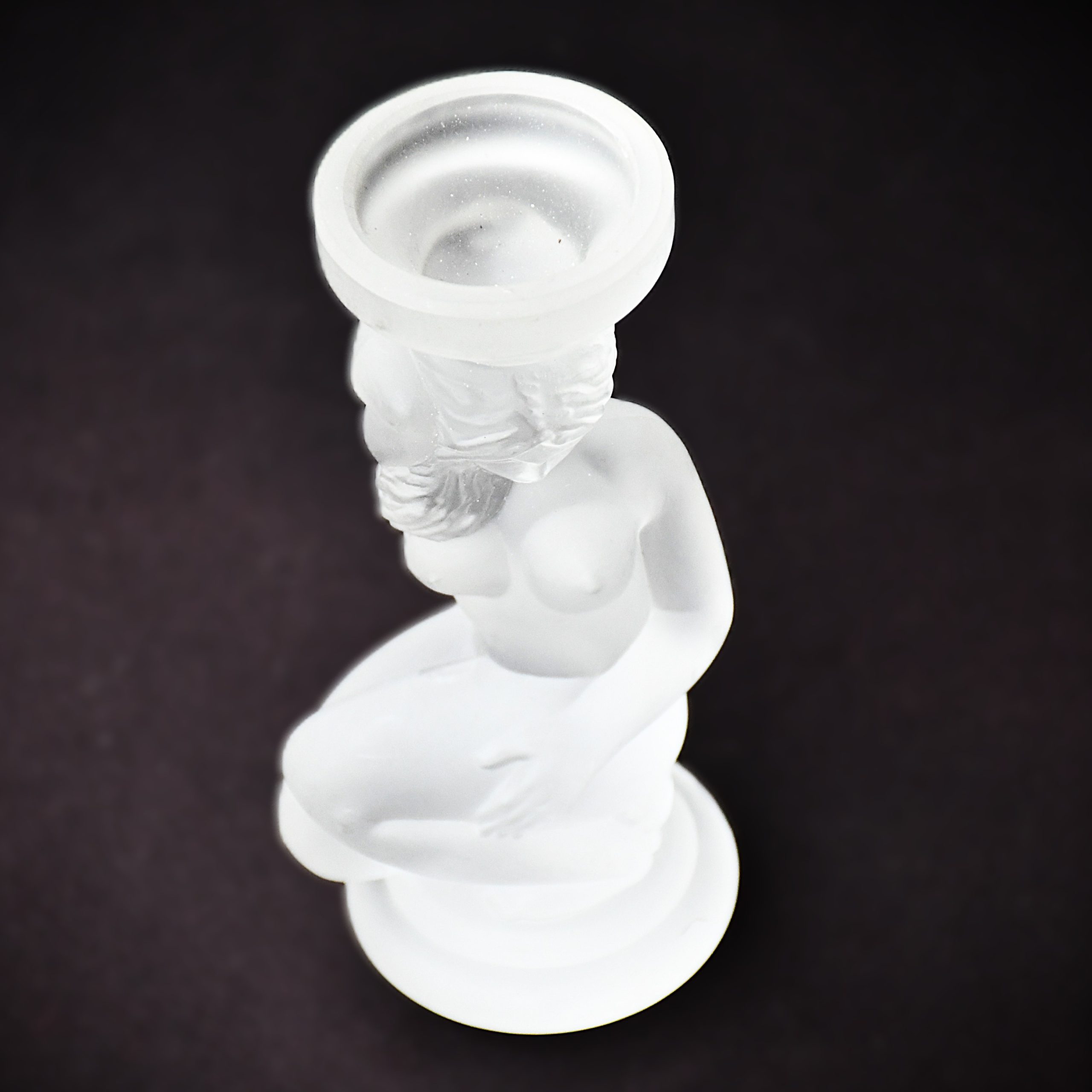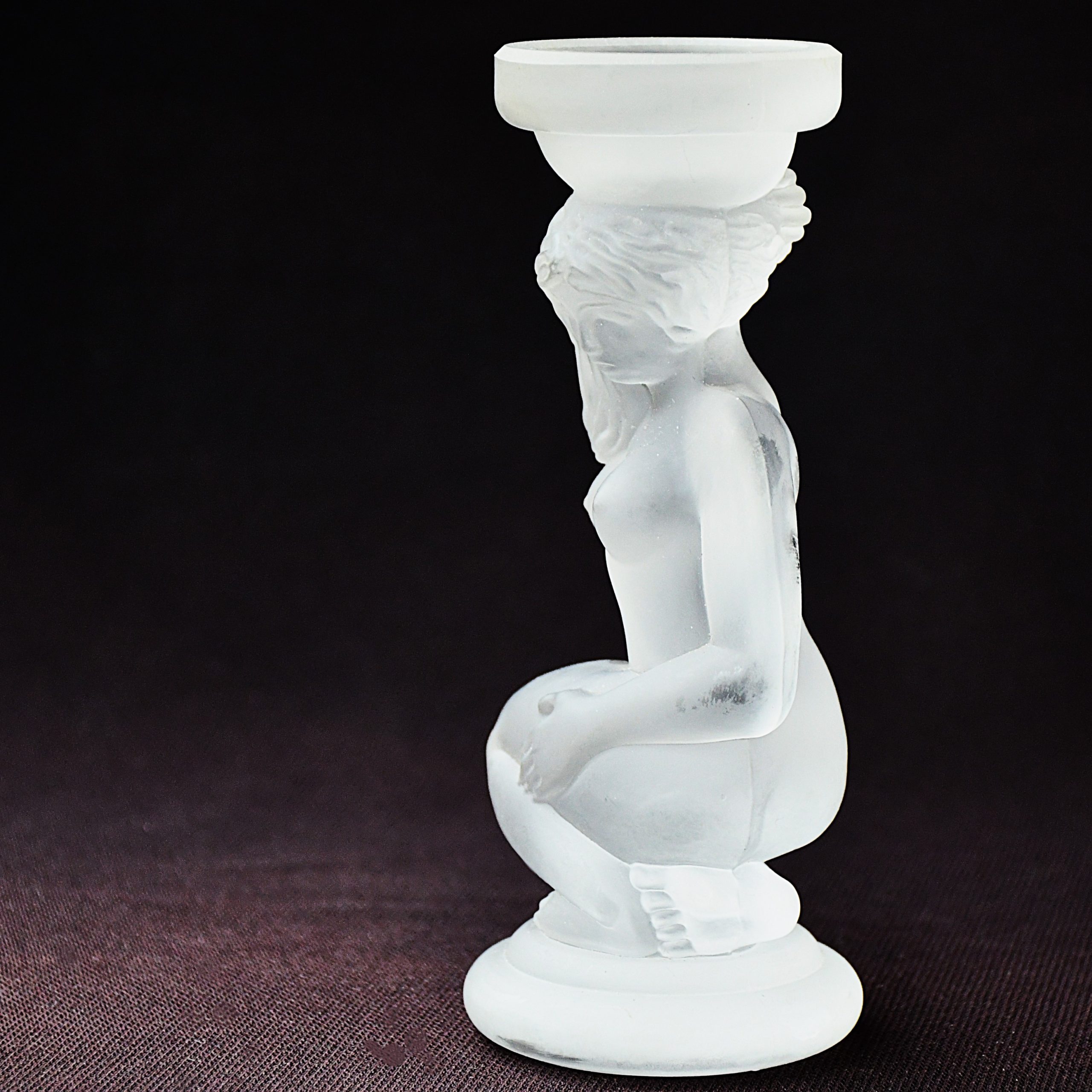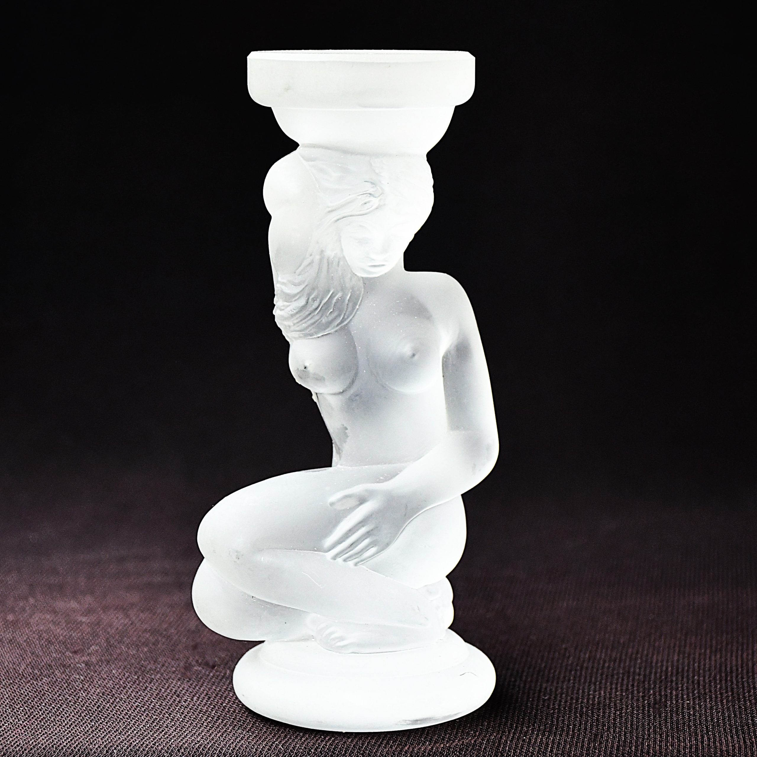 Прекрасна скулптура/свещник на заводите Гусь Хрустальный, Русия. Обичайно наричана „Ева“ или „Къпеща се“. Дизайнът е в стил Ар Деко и изобразява коленичила гола женска фигура, която държи чашката за свещ върху главата си. (Вдъхновението идва от работите на Рене Лалик в началото на 20и век.) Оловен кристал, сатениран. Датировка – началото на 21 век.