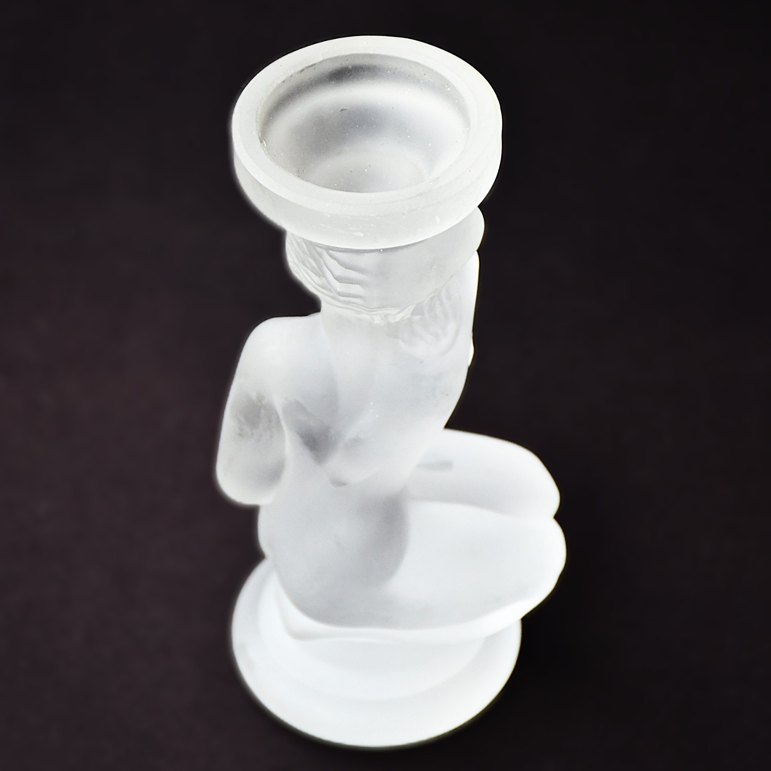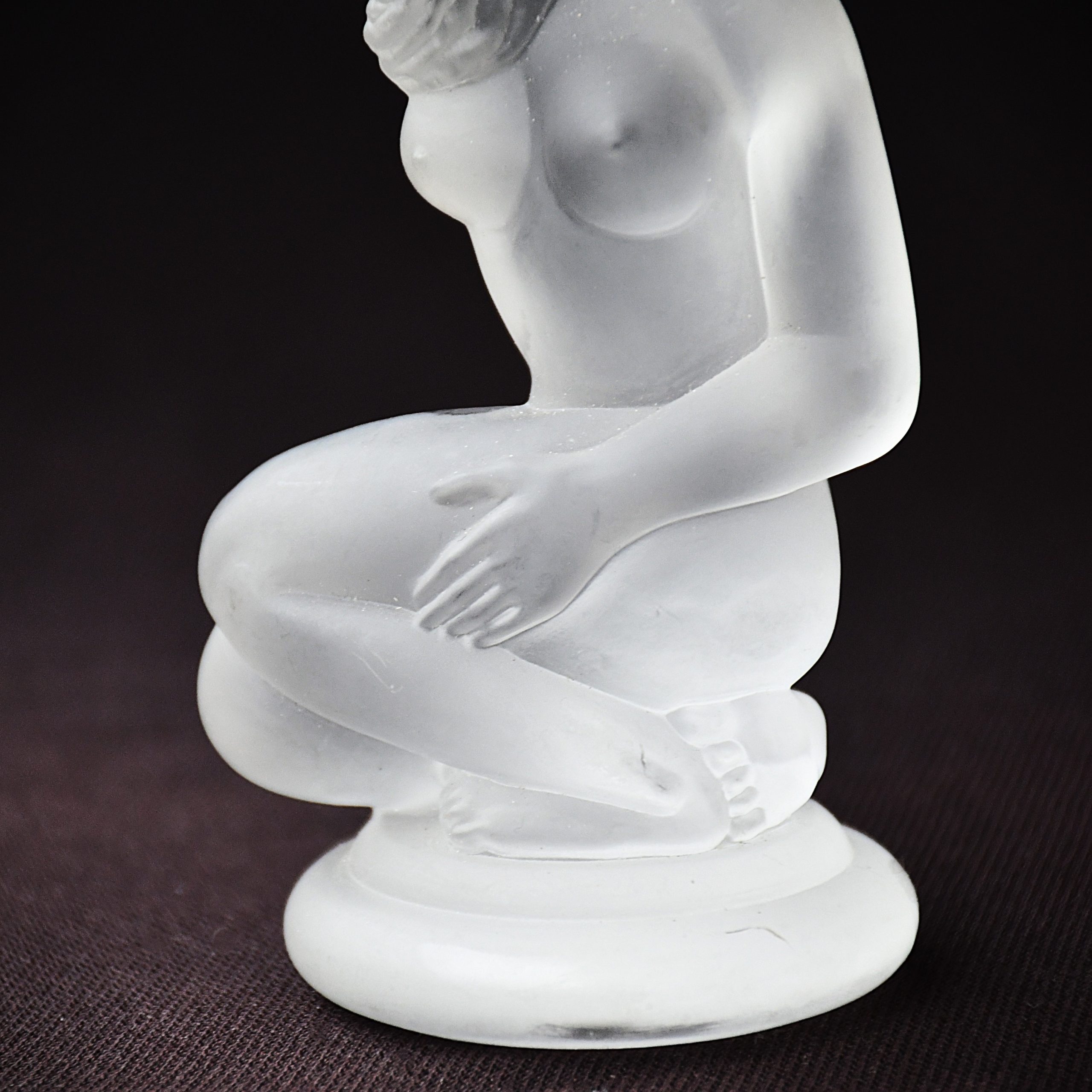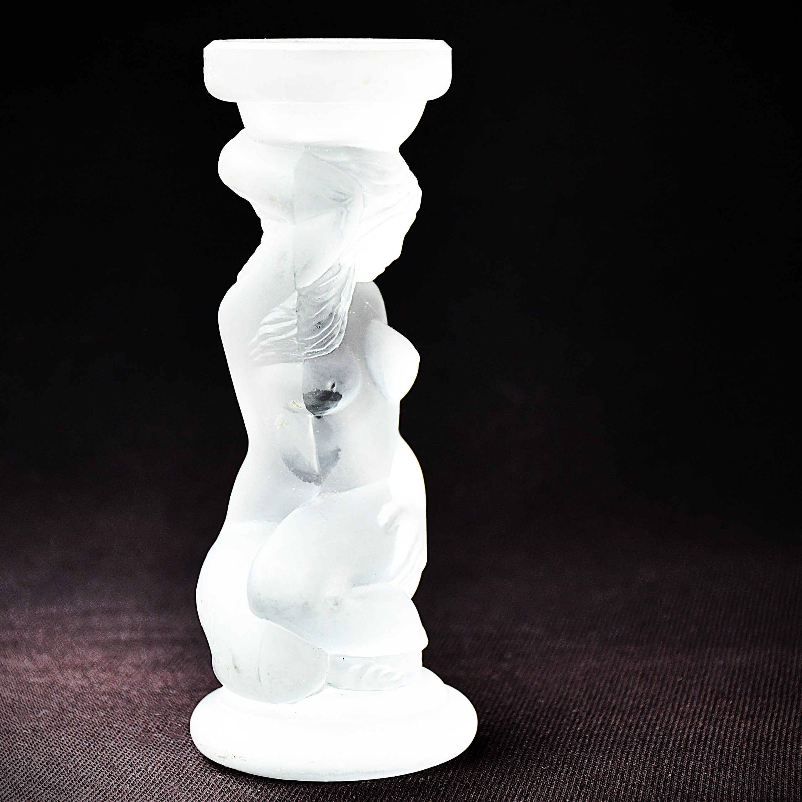 Прекрасна скулптура/свещник на заводите Гусь Хрустальный, Русия. Обичайно наричана „Ева“ или „Къпеща се“. Дизайнът е в стил Ар Деко и изобразява коленичила гола женска фигура, която държи чашката за свещ върху главата си. (Вдъхновението идва от работите на Рене Лалик в началото на 20и век.) Оловен кристал, сатениран. Датировка – началото на 21 век.