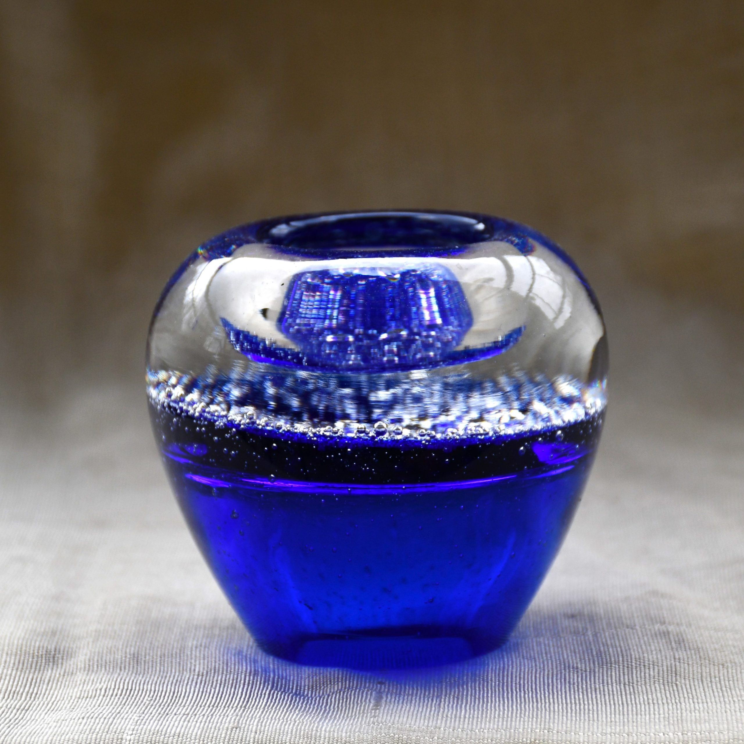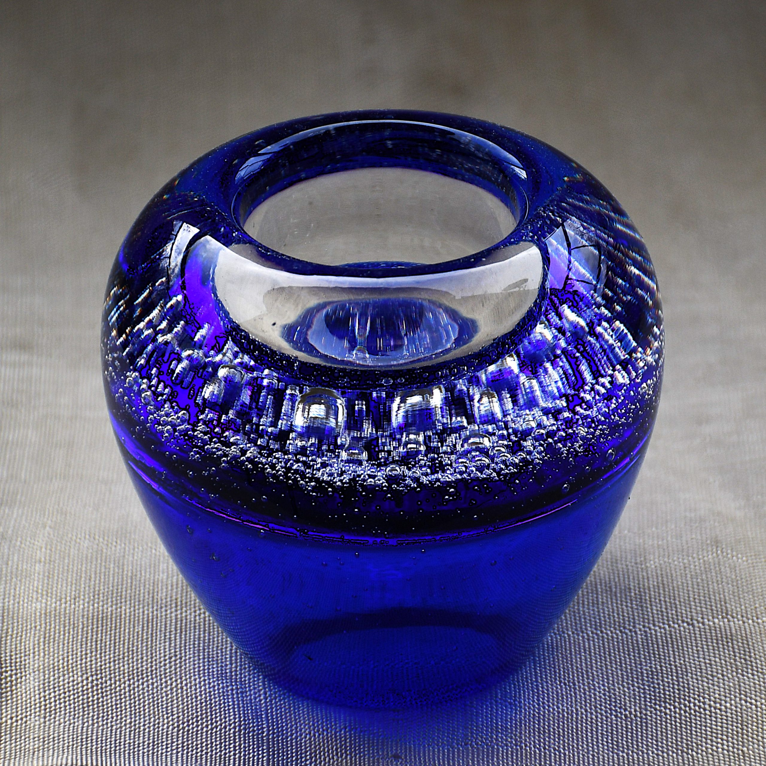 В кобалтово синьо и прозрачно, с множество неконтролирани мехурчета.