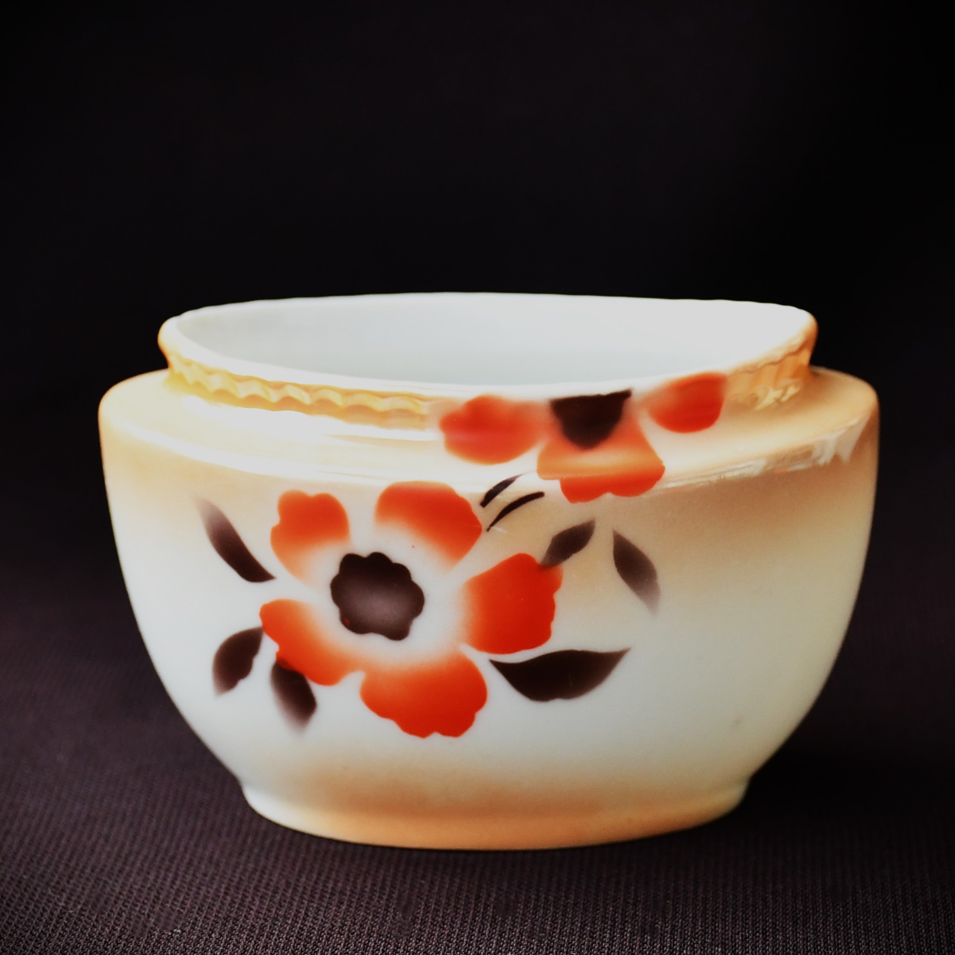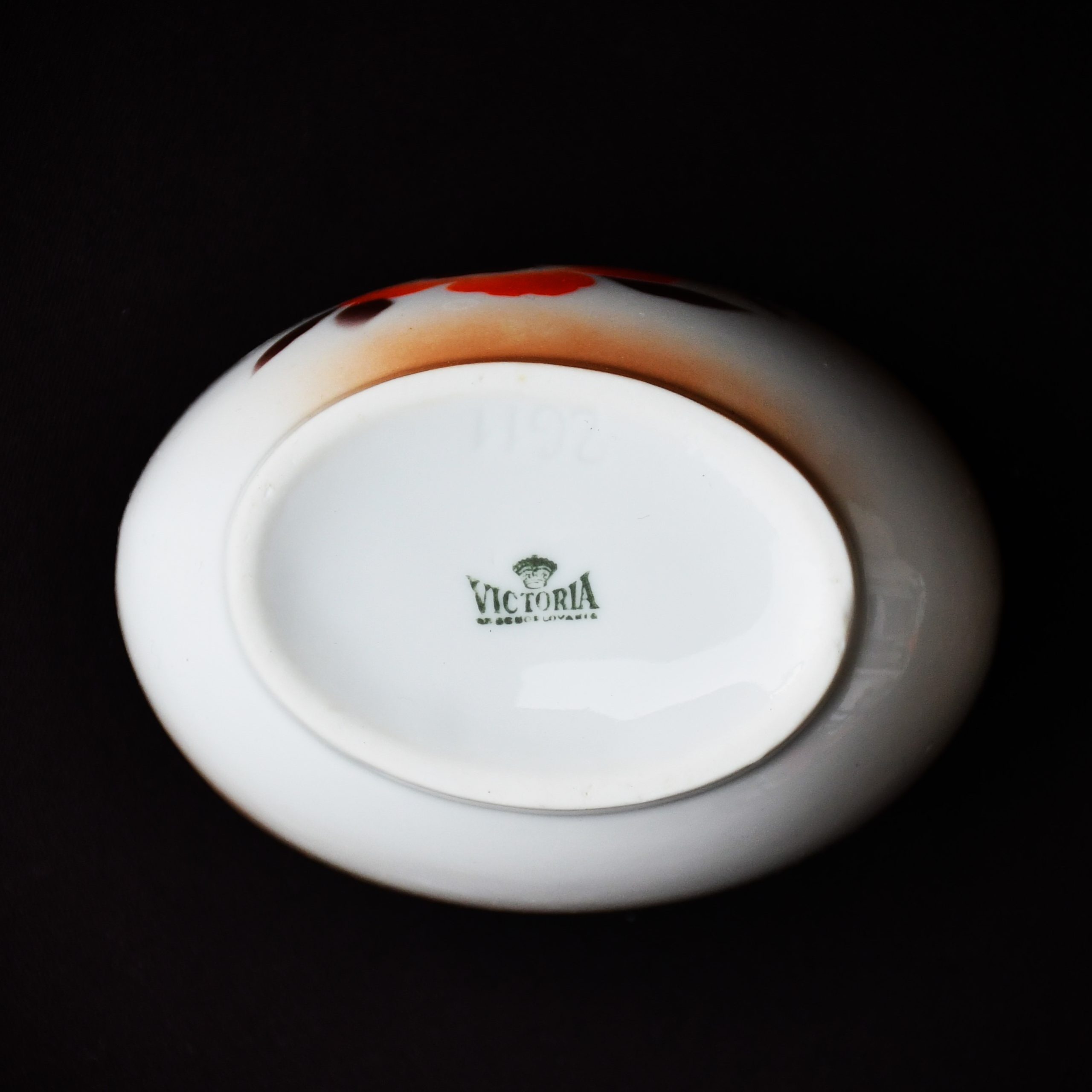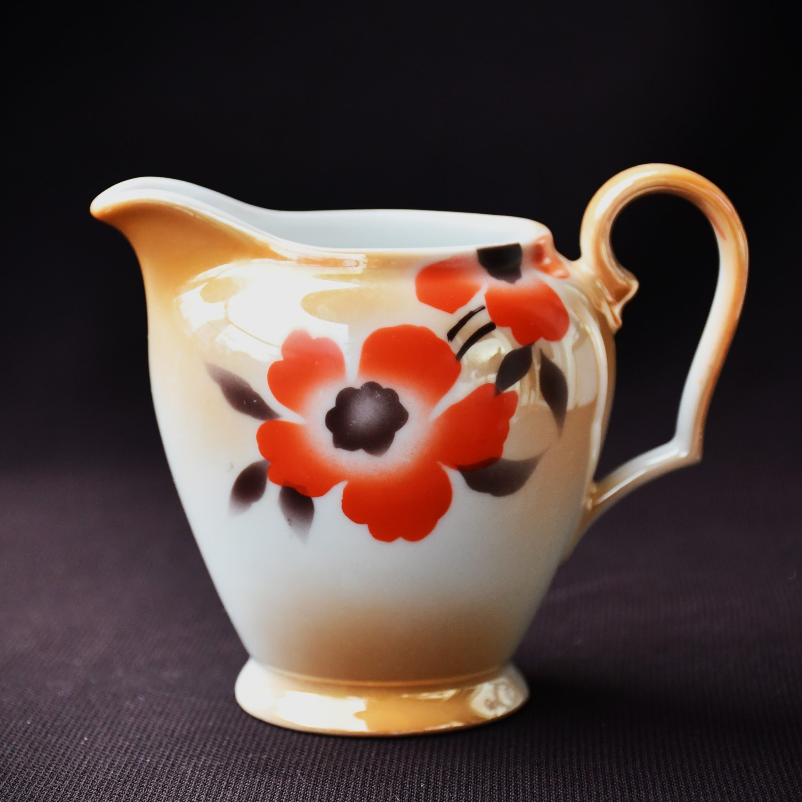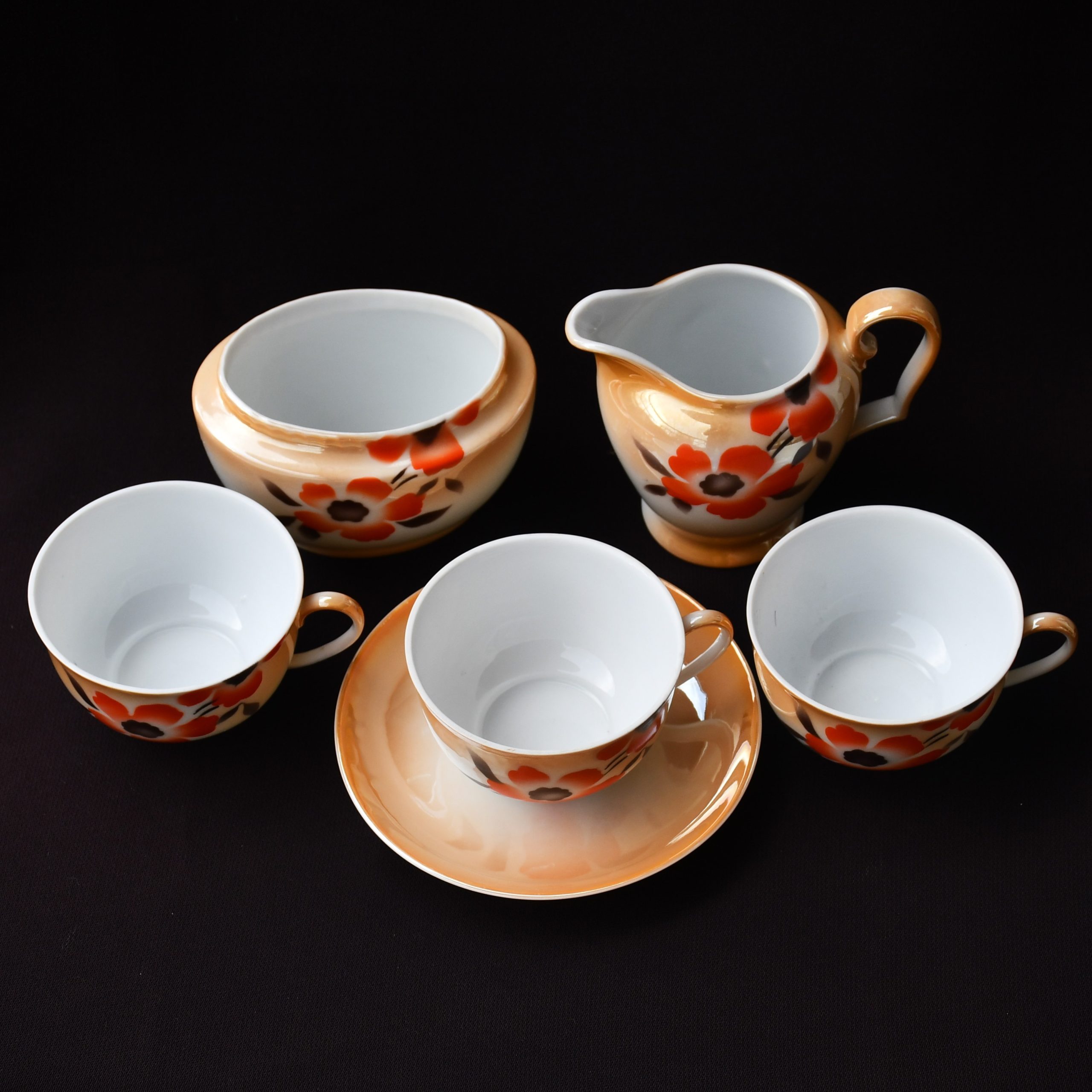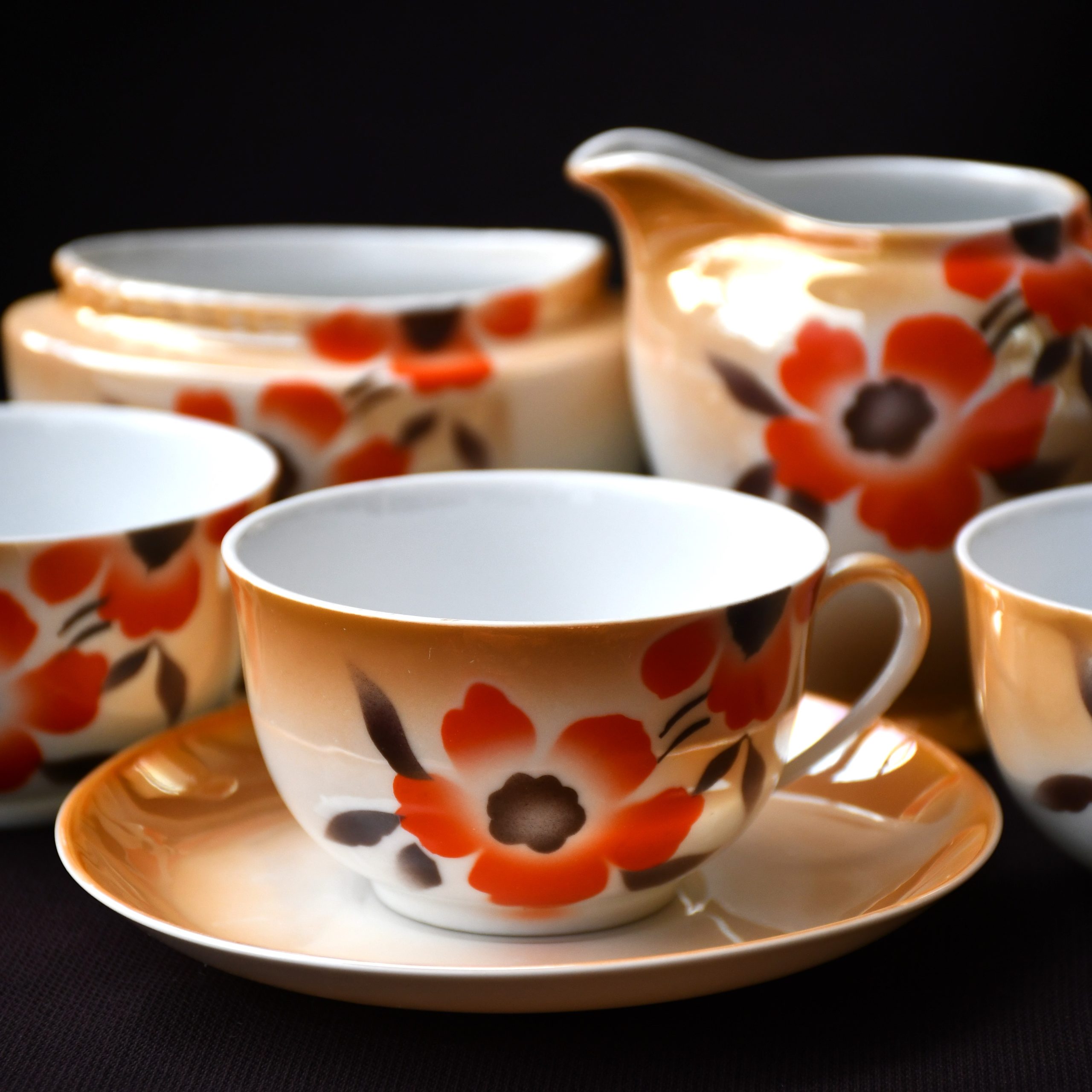 Прекрасен сервиз за кафе, произведен от реномираната компания Victoria, Чехословакия през 1930те. Състои се от 6 чашки, 6 чинийки, латиера и захарница в отлично винтидж качество. Рядка декорация в стил Арт Деко. Иридесцентен финиш.