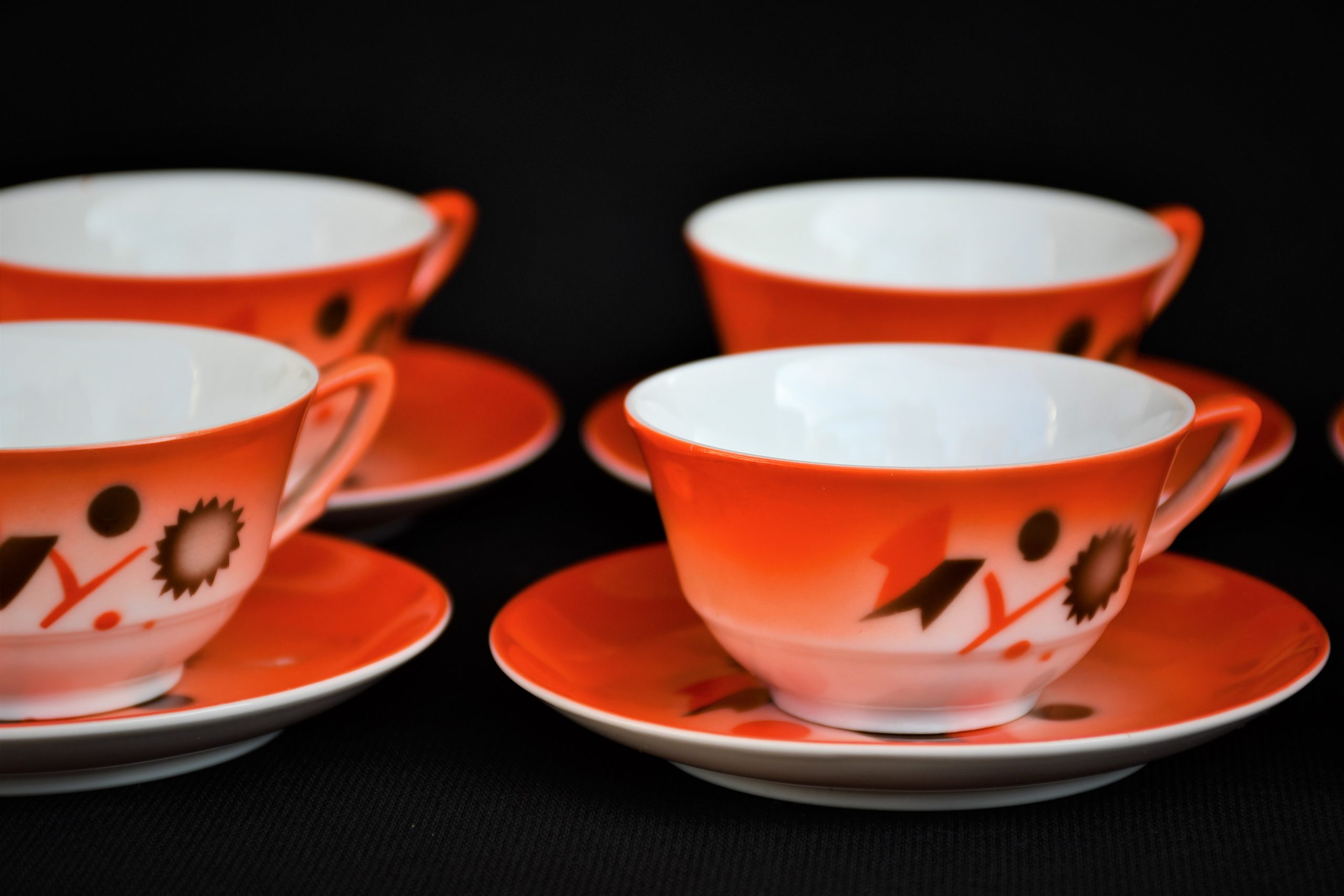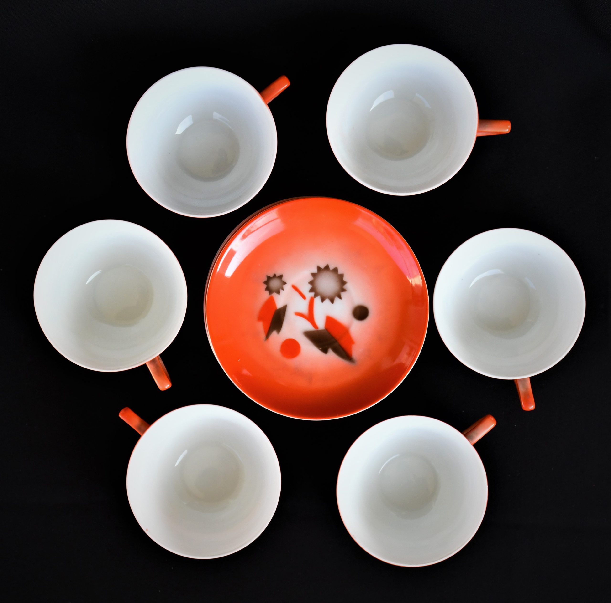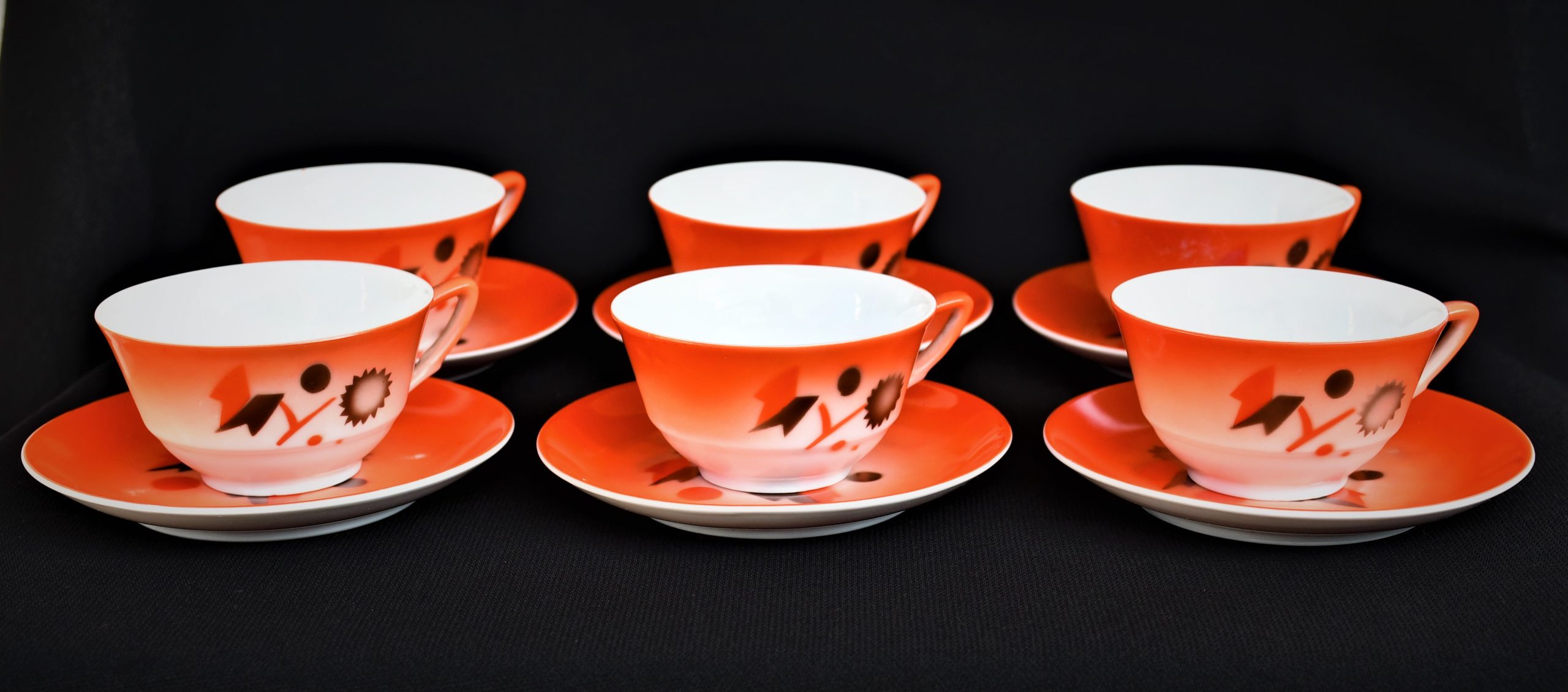 Прекрасен сервиз за кафе, произведен от реномираната компания Zeh Sherzer, Bavaria за техния полувековен юбилей през 1930. Състои се от 6 чашки и 6 чинийки в отлично винтидж качество. Рядко юбилейно издание.
