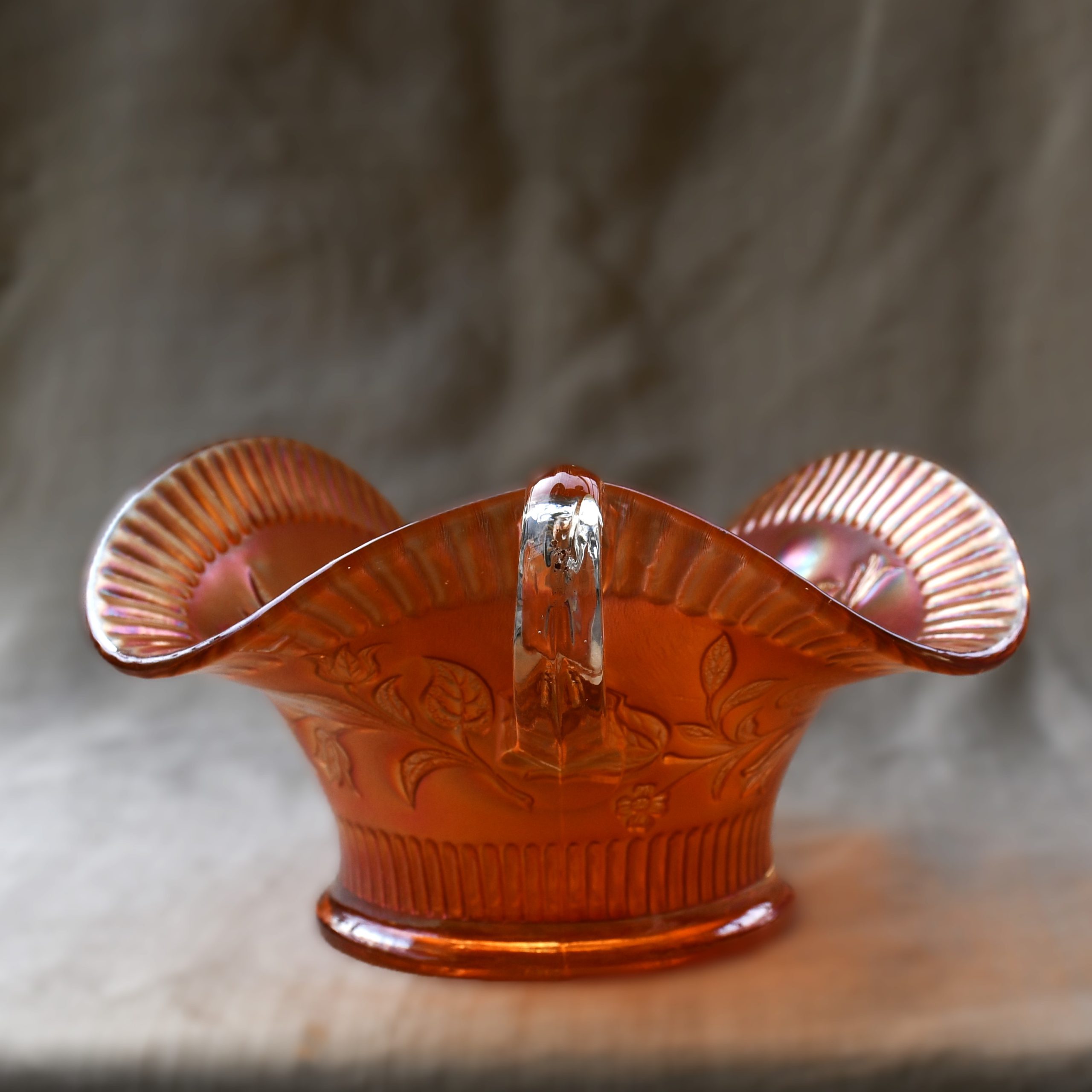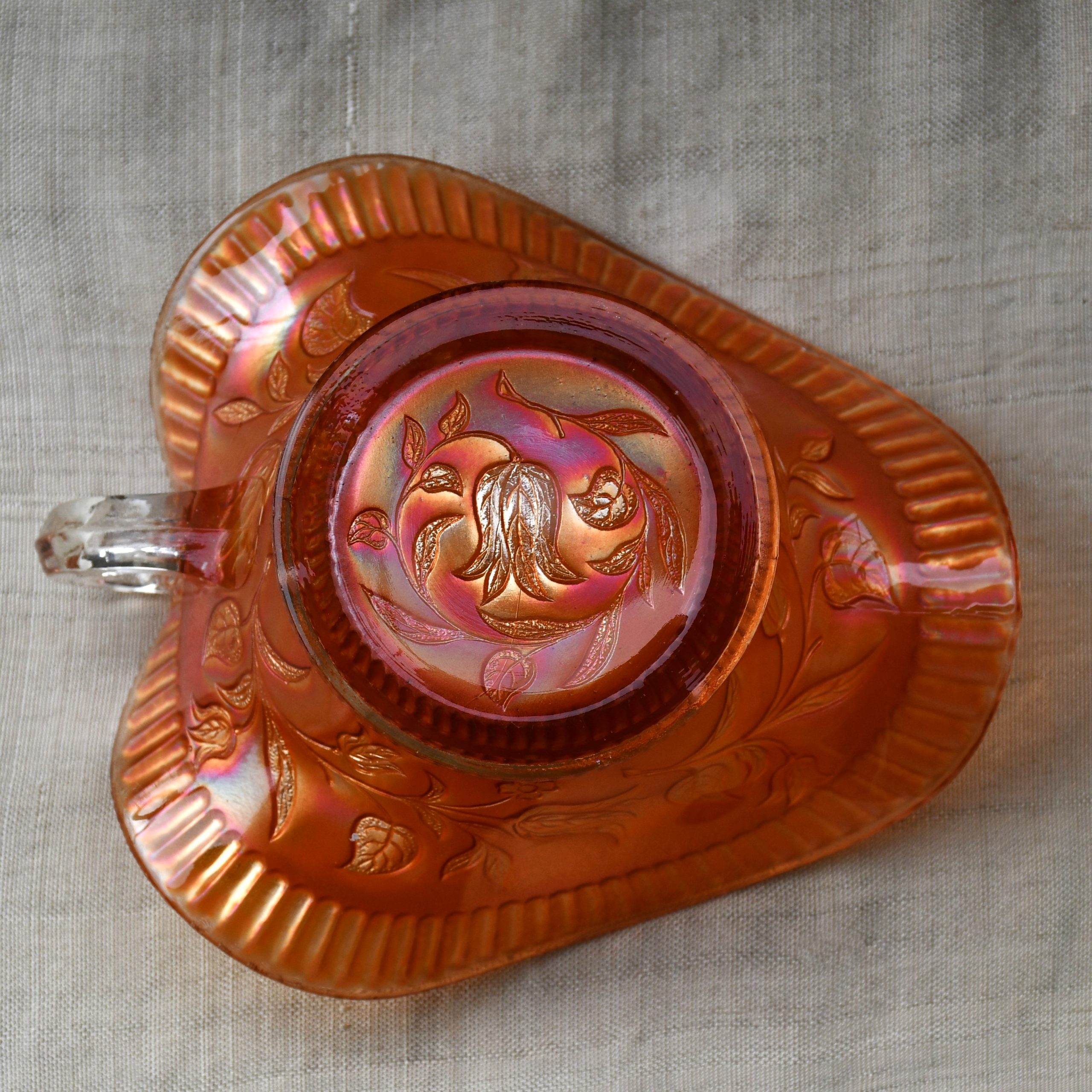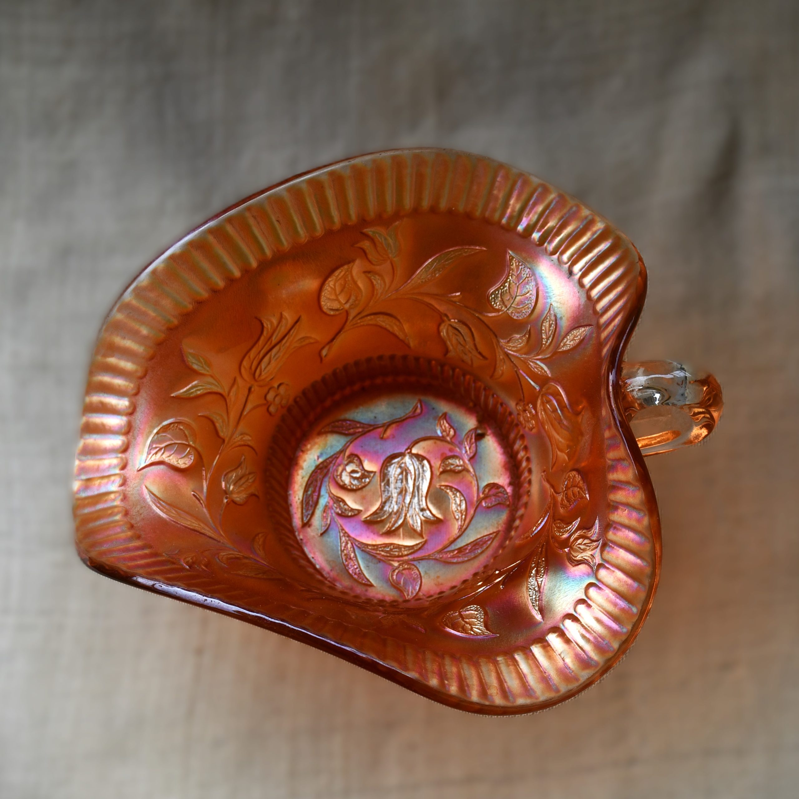 Vintage Dugan „сосиера“ от карнавално стъкло. Цвят: peach opalescent. Декор – флорални мотиви. Пресовано стъкло. Изключително красив предмет с пищна вълнообразна периферия.